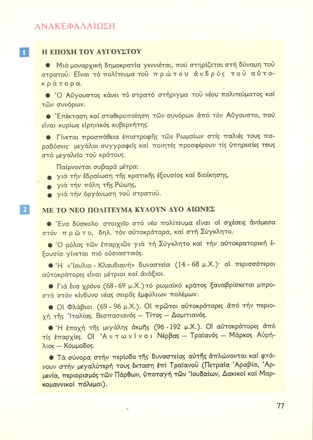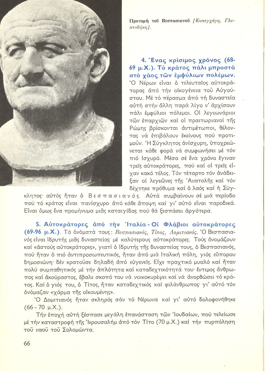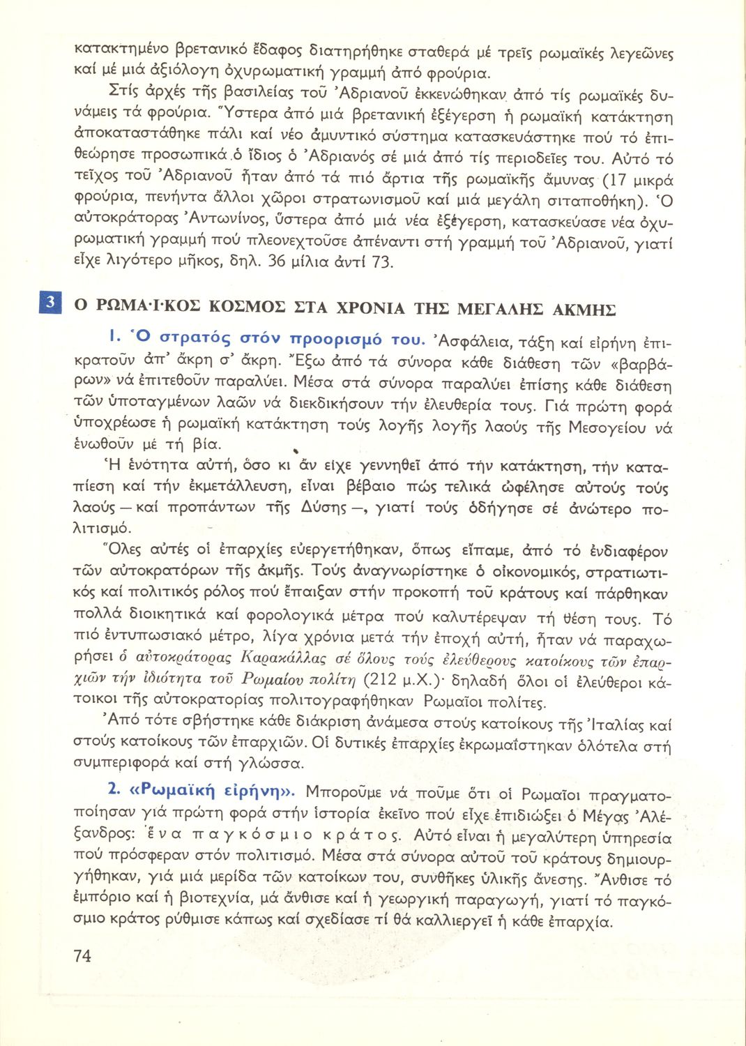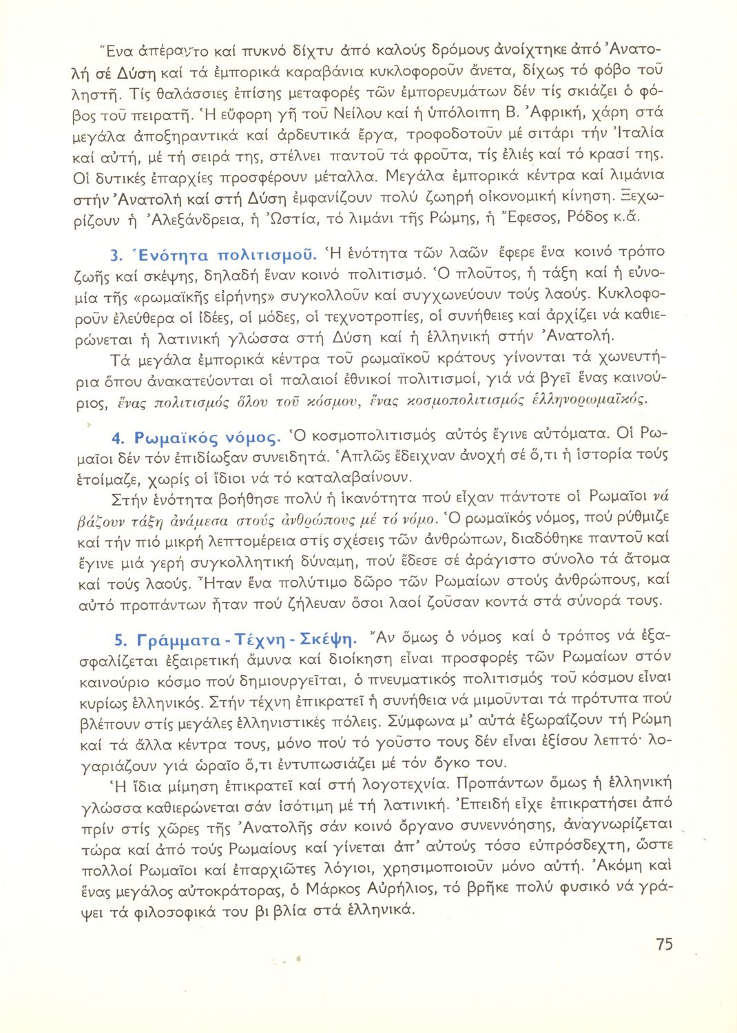 Σχολικό εγχειρίδιο Ιστορίας Β΄ Γυμνασίου που καλύπτει την περίοδο από την κατάληψη της Ελλάδας από τους Ρωμαίους ως την πτώση της Βυζαντινής Αυτοκρατορίας. Γίνεται ιδιαίτερη μνεία στο χριστιανικό και ελληνικό στοιχείο του Βυζαντίου. Προτείνει μια υλιστική ανάγνωση της Ιστορίας την οποία διαβάζει από την οπτική των κοινωνικών συγκρούσεων.
