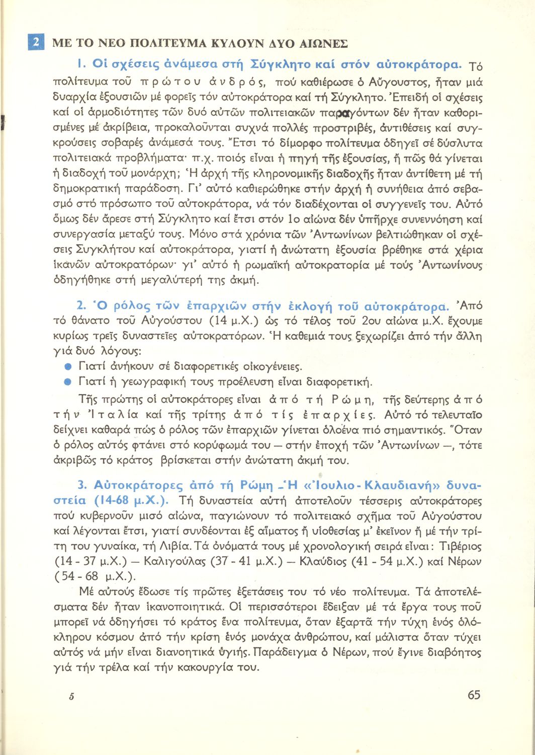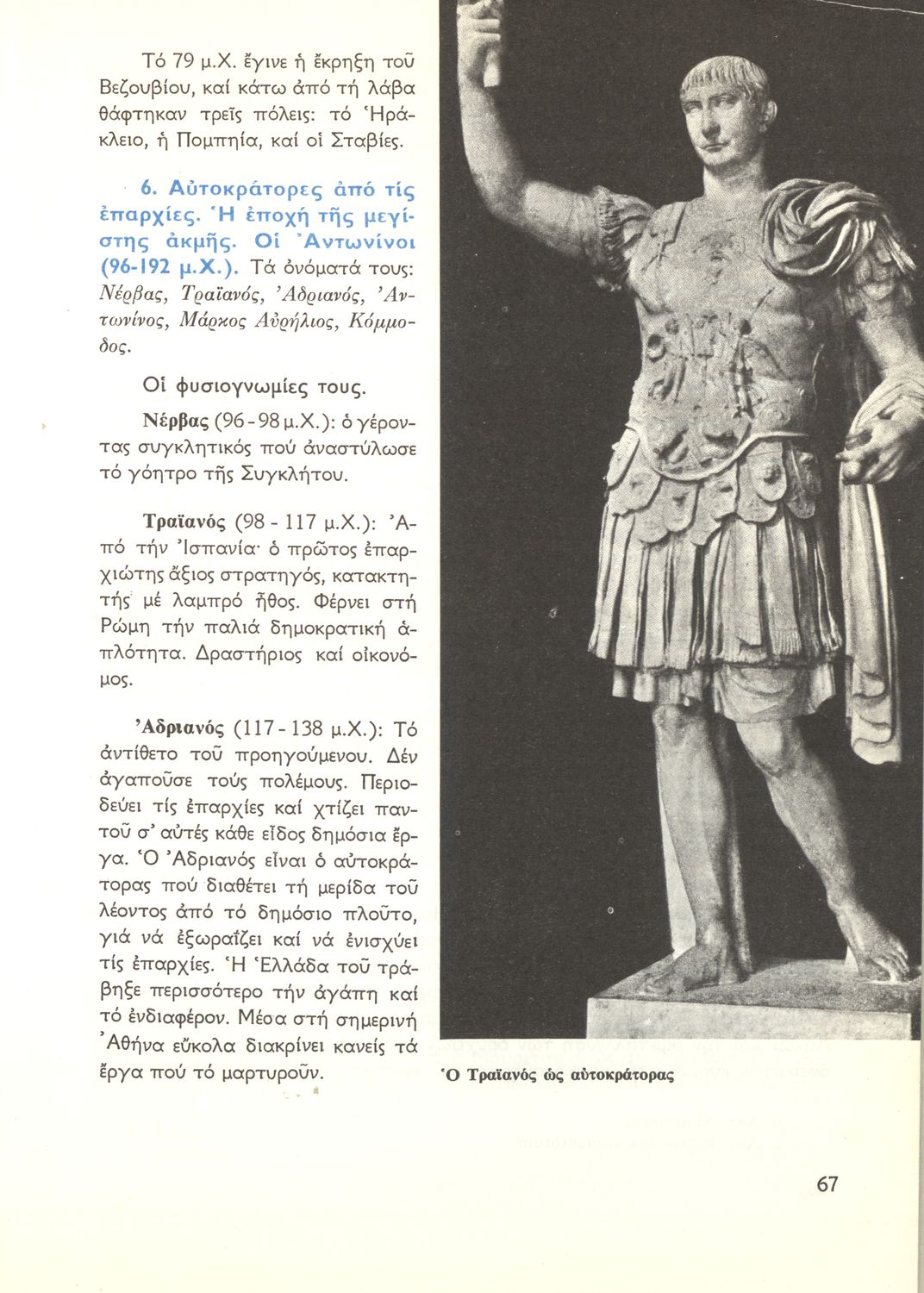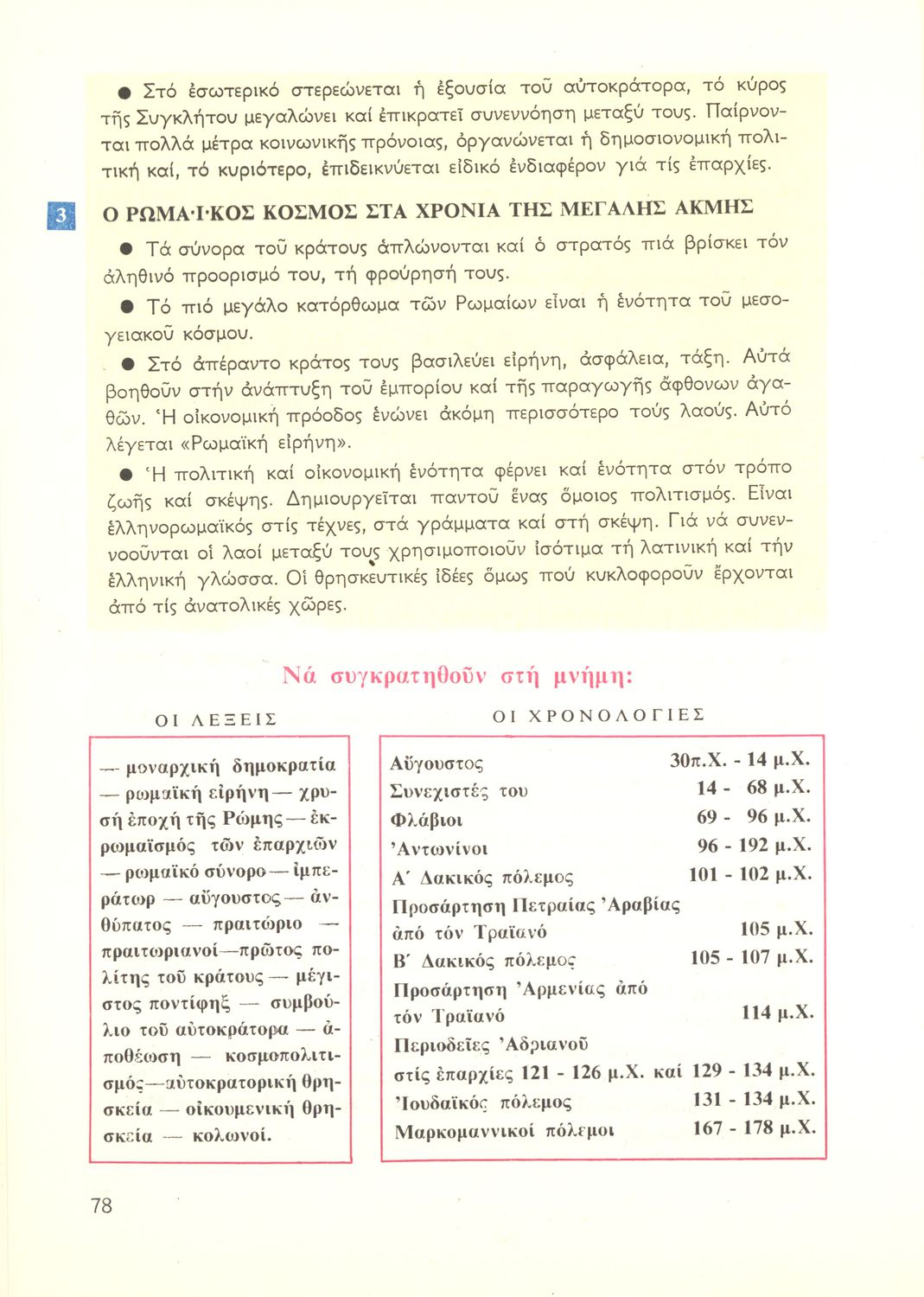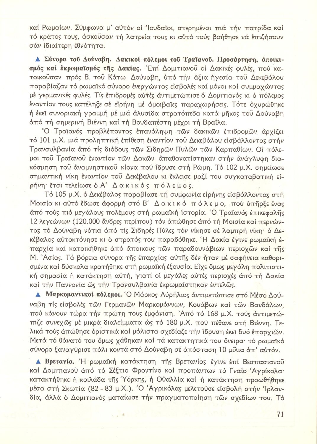 Σχολικό εγχειρίδιο Ιστορίας Β΄ Γυμνασίου που καλύπτει την περίοδο από την κατάληψη της Ελλάδας από τους Ρωμαίους ως την πτώση της Βυζαντινής Αυτοκρατορίας. Γίνεται ιδιαίτερη μνεία στο χριστιανικό και ελληνικό στοιχείο του Βυζαντίου. Προτείνει μια υλιστική ανάγνωση της Ιστορίας την οποία διαβάζει από την οπτική των κοινωνικών συγκρούσεων.