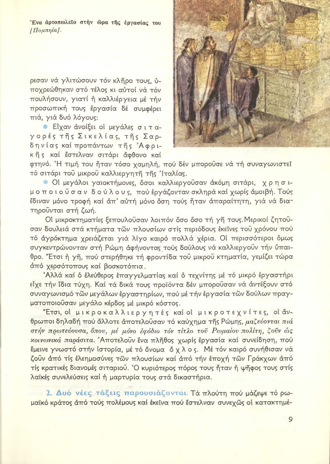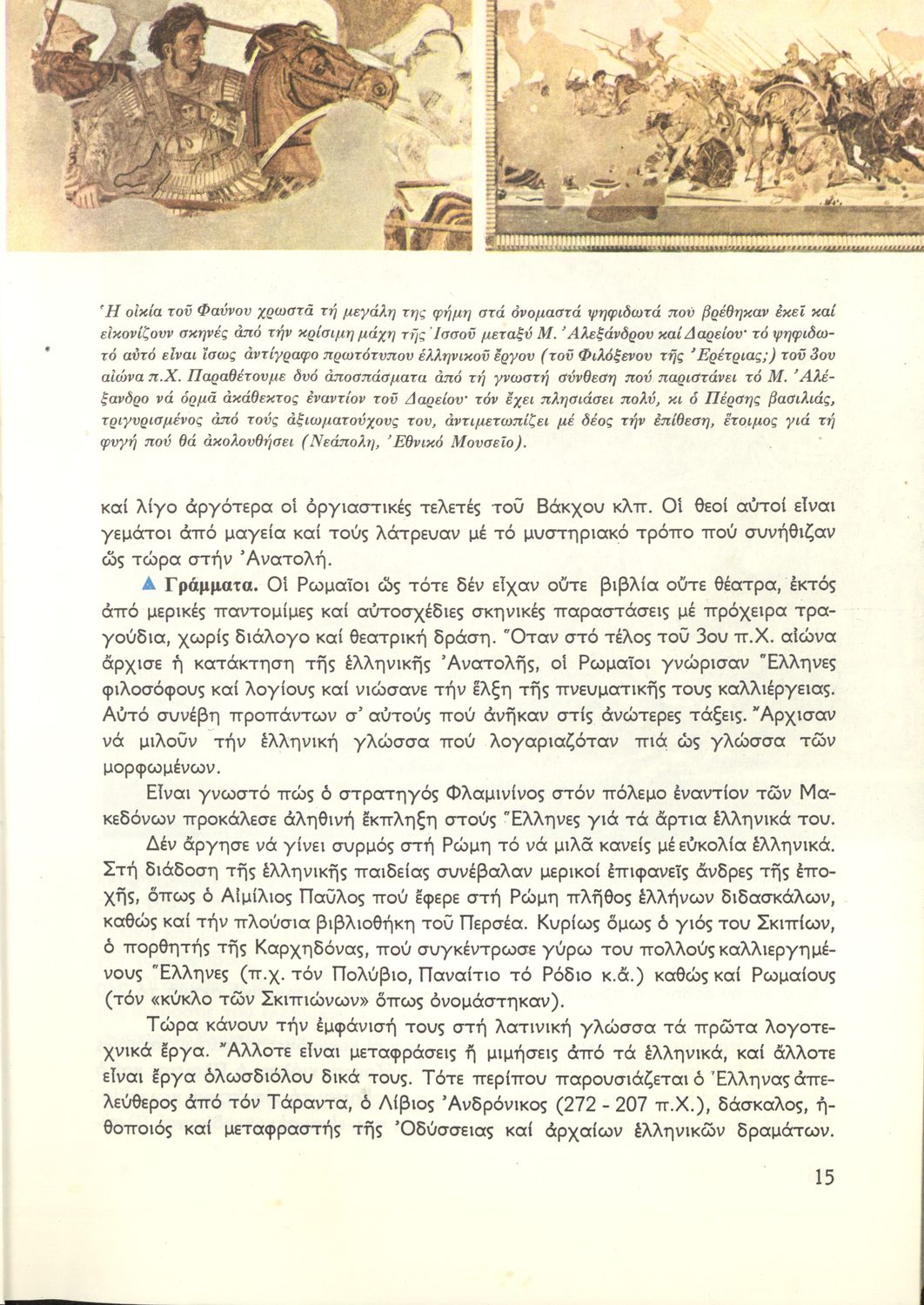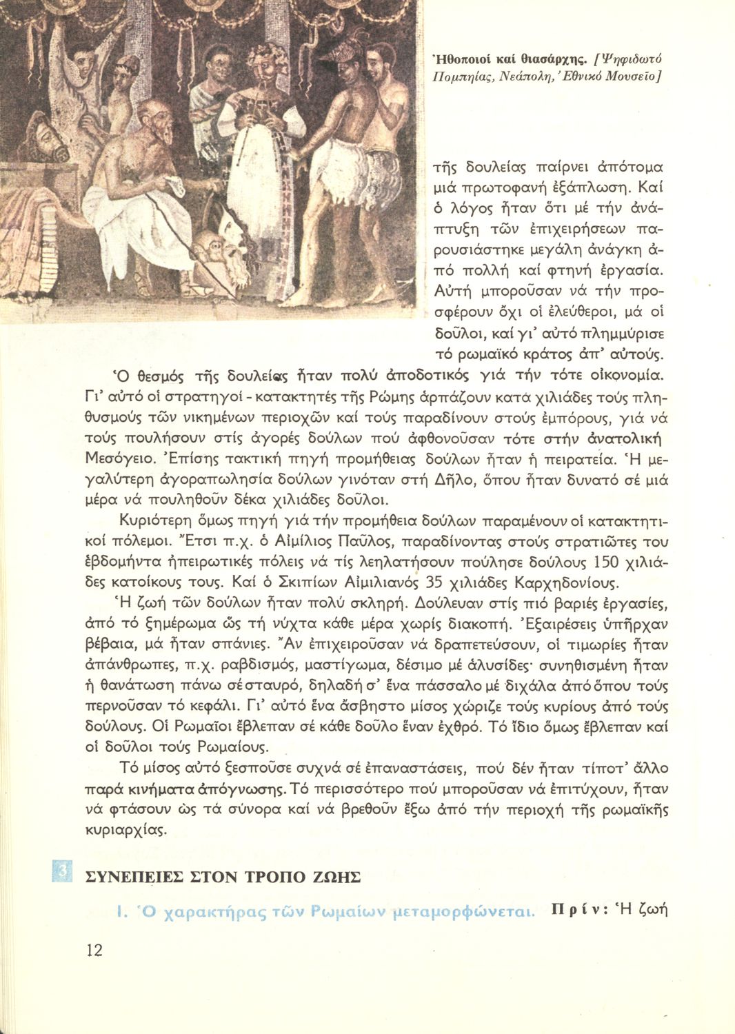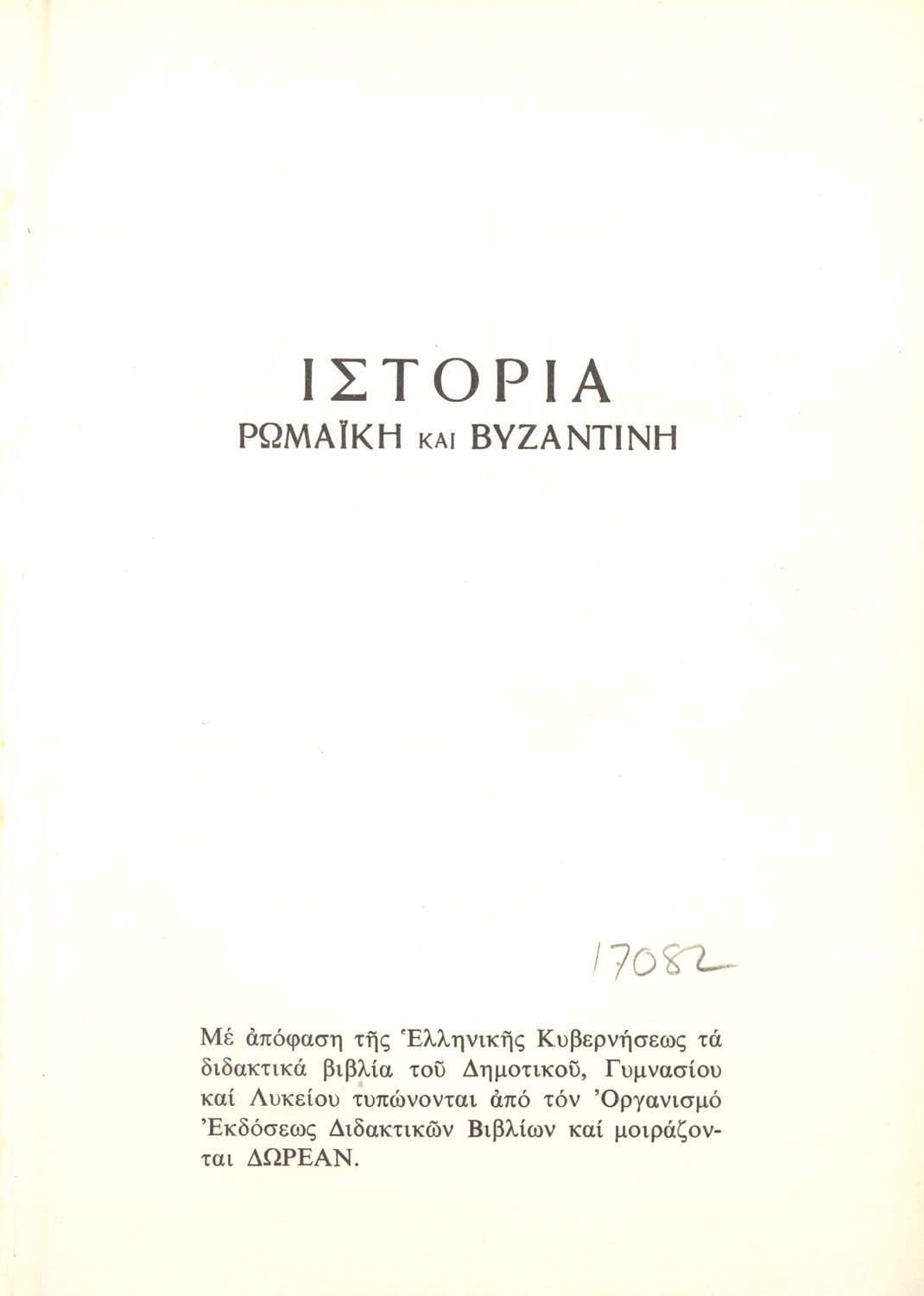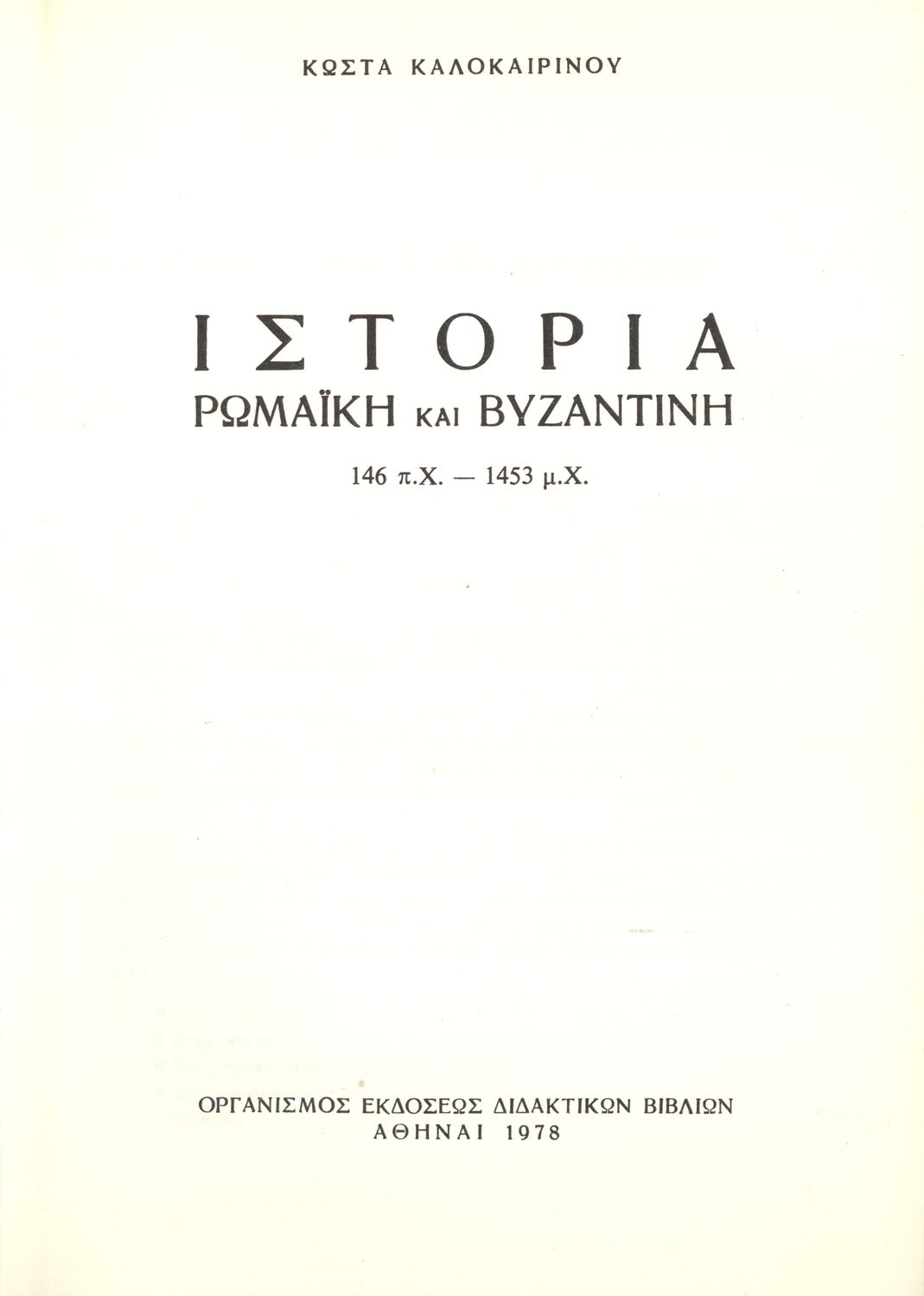 Σχολικό εγχειρίδιο Ιστορίας Β΄ Γυμνασίου που καλύπτει την περίοδο από την κατάληψη της Ελλάδας από τους Ρωμαίους ως την πτώση της Βυζαντινής Αυτοκρατορίας. Γίνεται ιδιαίτερη μνεία στο χριστιανικό και ελληνικό στοιχείο του Βυζαντίου. Προτείνει μια υλιστική ανάγνωση της Ιστορίας την οποία διαβάζει από την οπτική των κοινωνικών συγκρούσεων.
