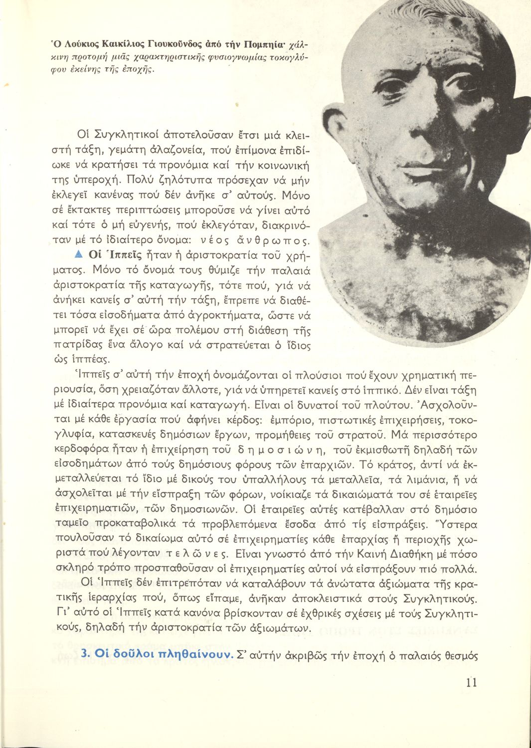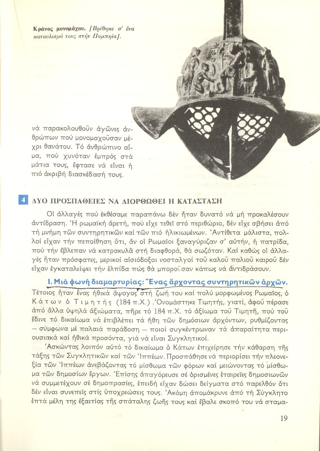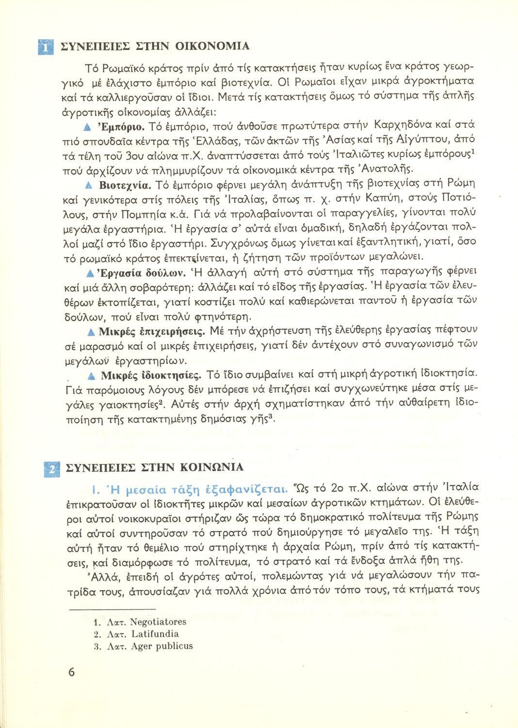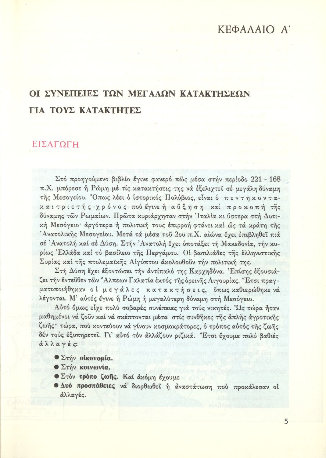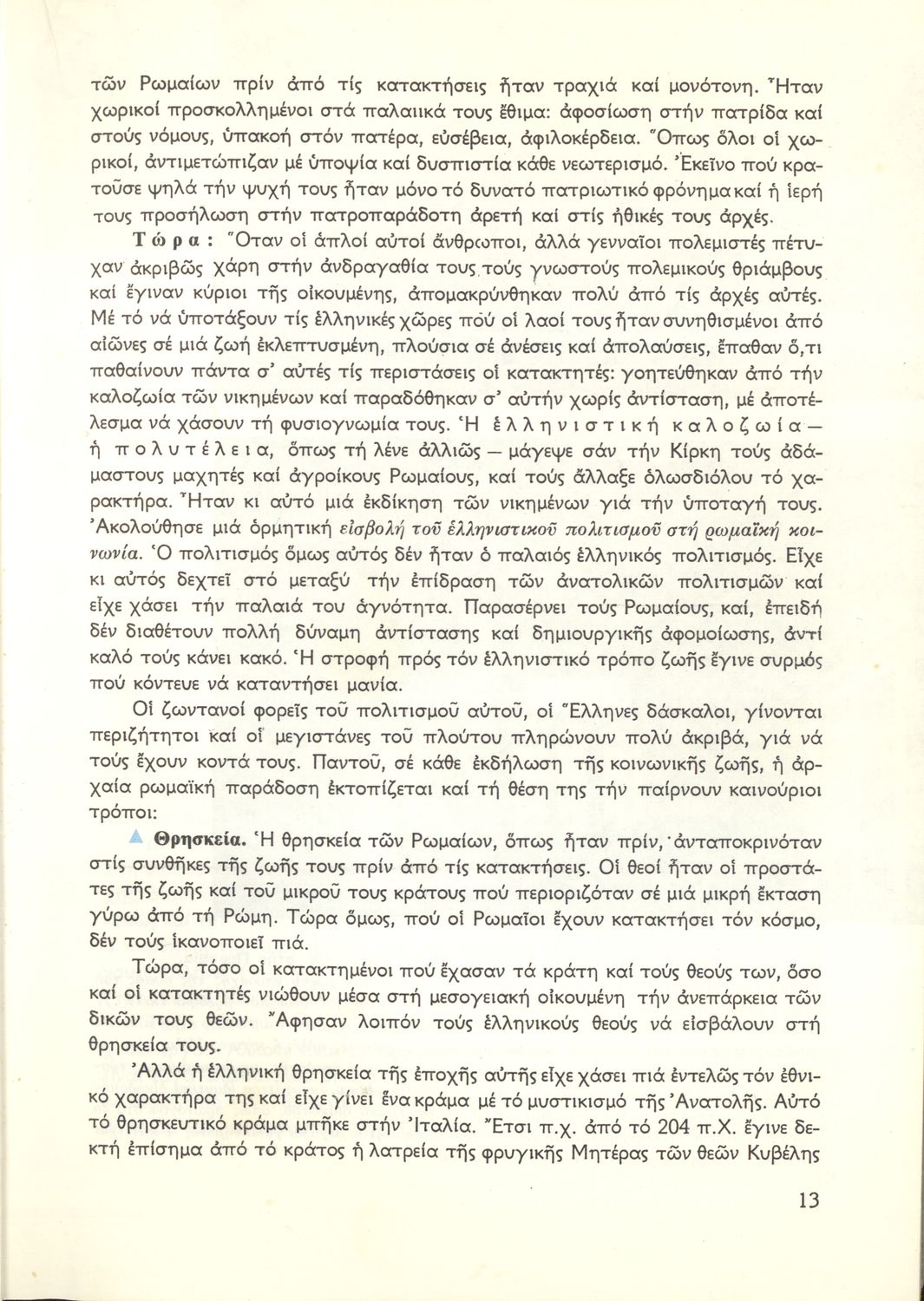 Σχολικό εγχειρίδιο Ιστορίας Β΄ Γυμνασίου που καλύπτει την περίοδο από την κατάληψη της Ελλάδας από τους Ρωμαίους ως την πτώση της Βυζαντινής Αυτοκρατορίας. Γίνεται ιδιαίτερη μνεία στο χριστιανικό και ελληνικό στοιχείο του Βυζαντίου. Προτείνει μια υλιστική ανάγνωση της Ιστορίας την οποία διαβάζει από την οπτική των κοινωνικών συγκρούσεων.