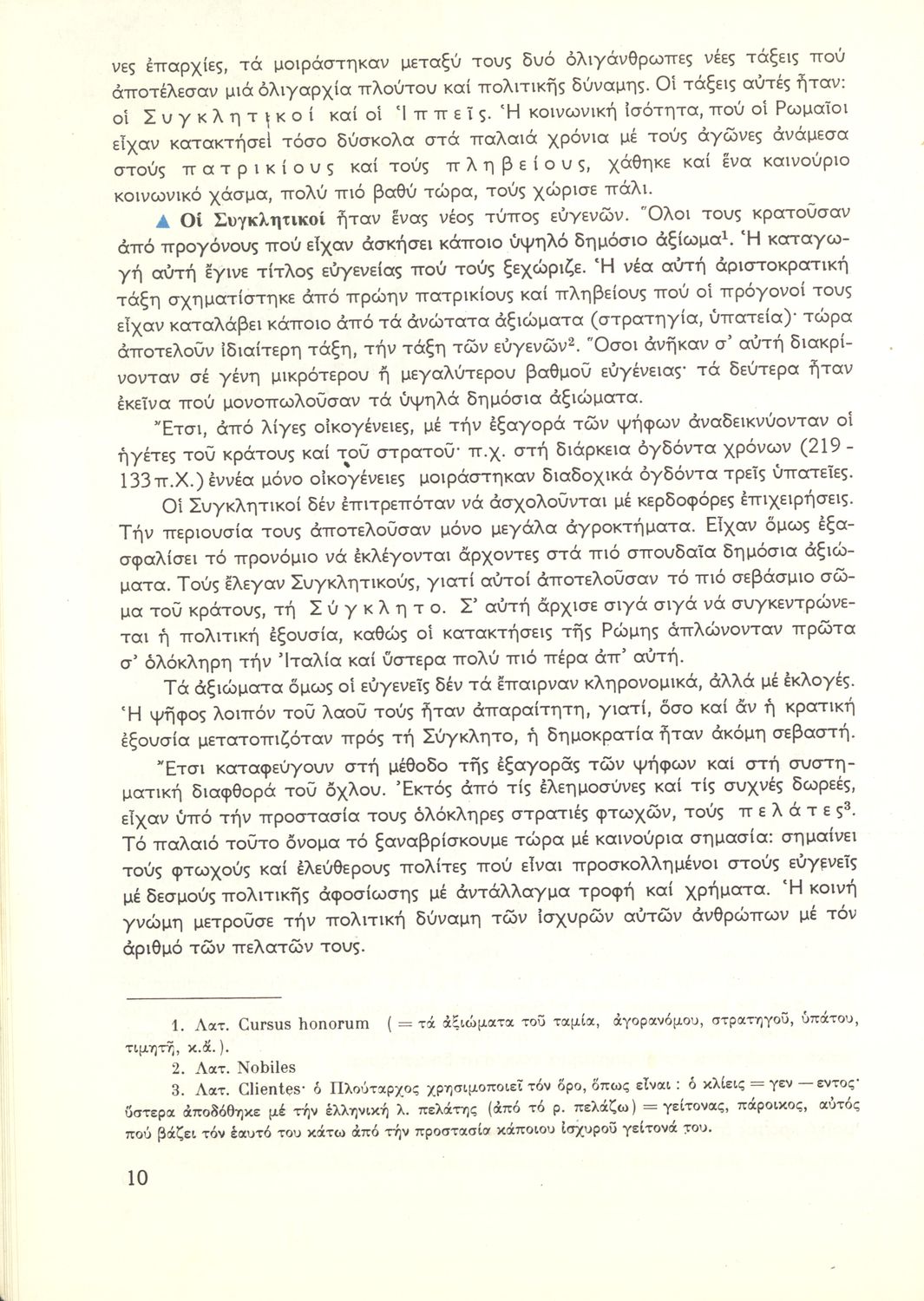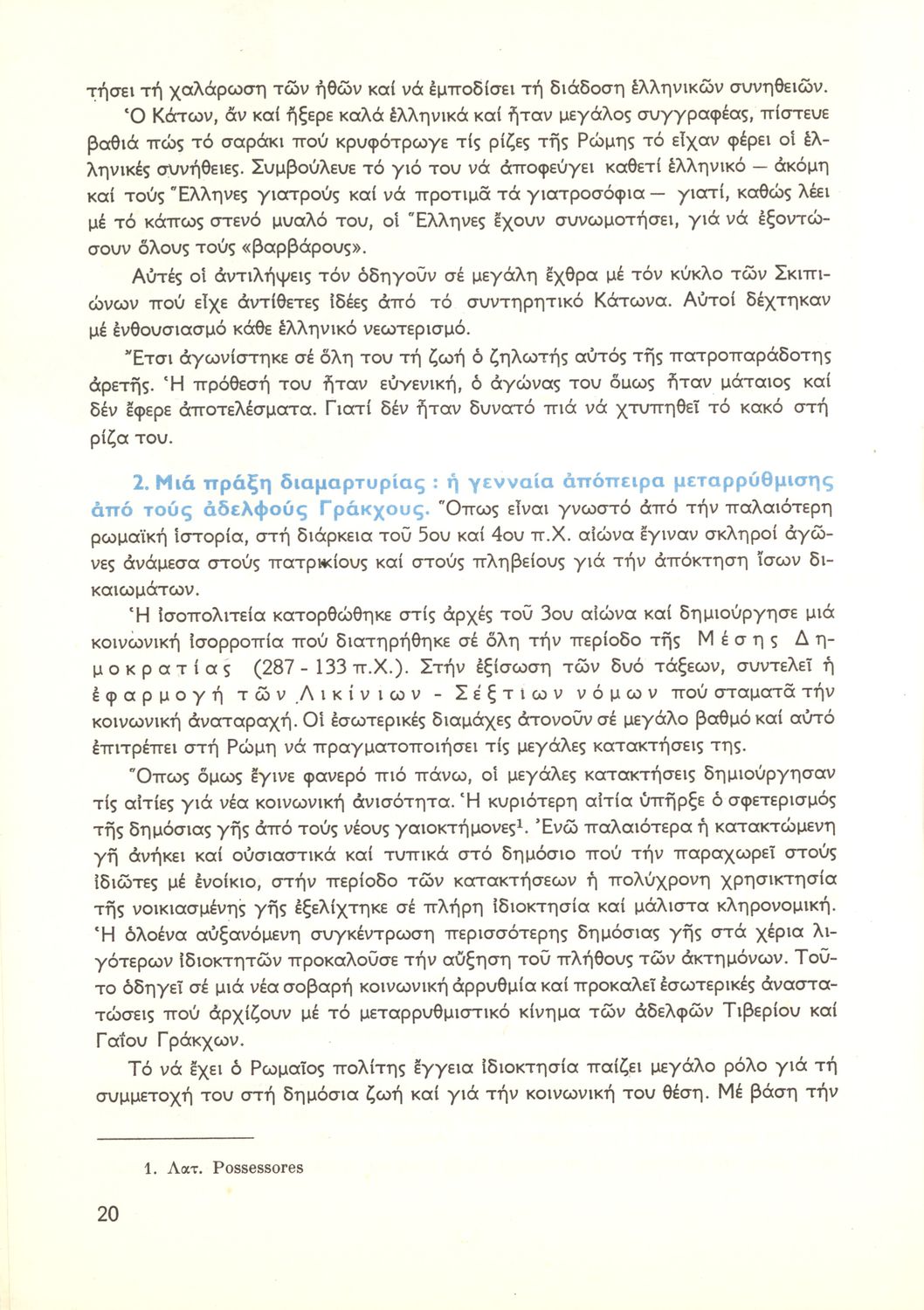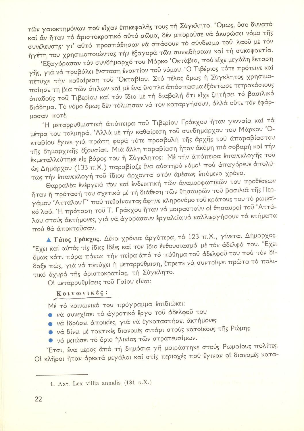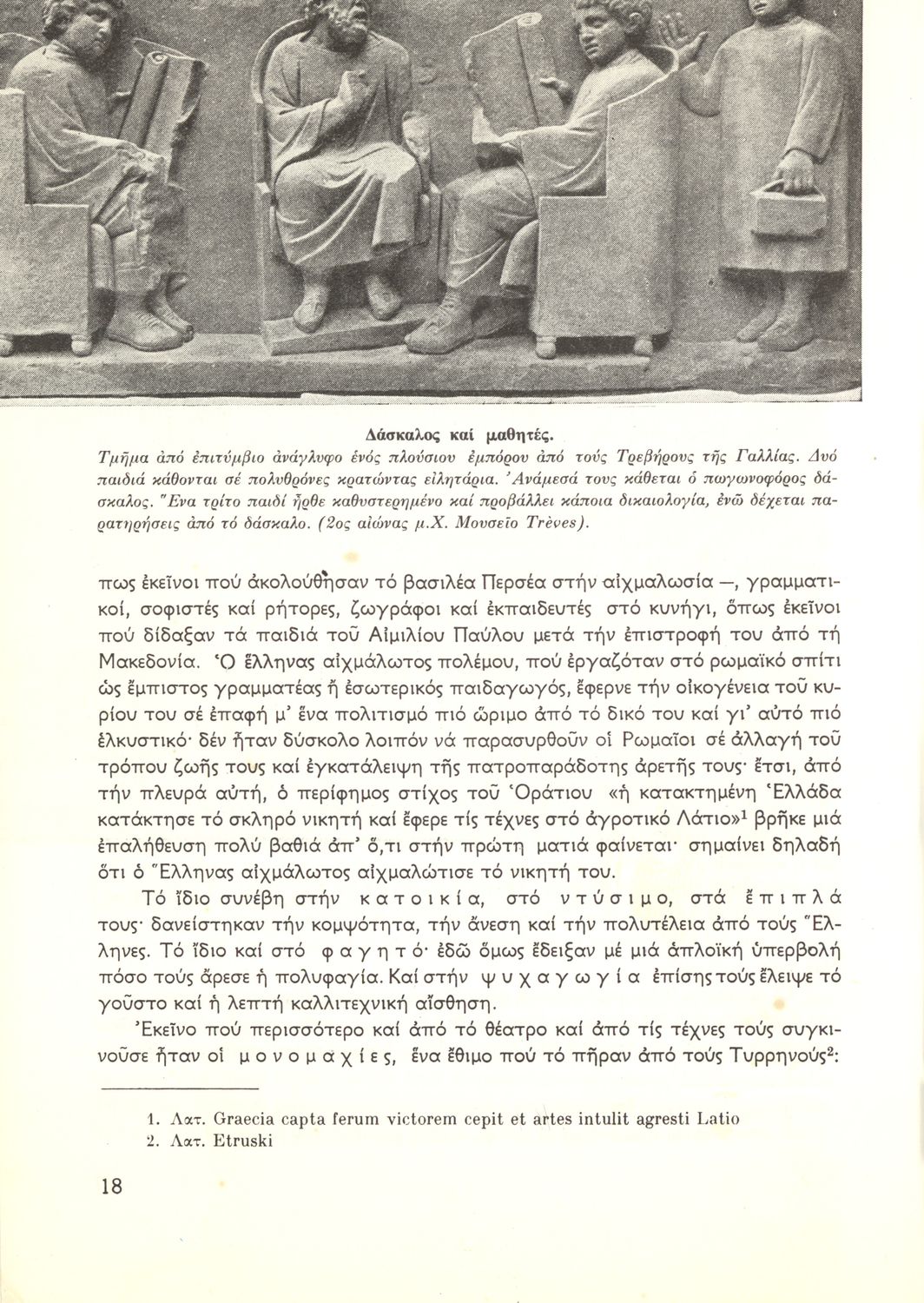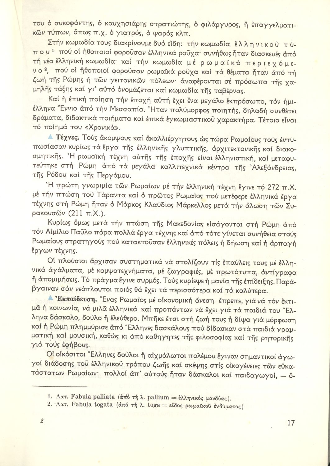 Σχολικό εγχειρίδιο Ιστορίας Β΄ Γυμνασίου που καλύπτει την περίοδο από την κατάληψη της Ελλάδας από τους Ρωμαίους ως την πτώση της Βυζαντινής Αυτοκρατορίας. Γίνεται ιδιαίτερη μνεία στο χριστιανικό και ελληνικό στοιχείο του Βυζαντίου. Προτείνει μια υλιστική ανάγνωση της Ιστορίας την οποία διαβάζει από την οπτική των κοινωνικών συγκρούσεων.