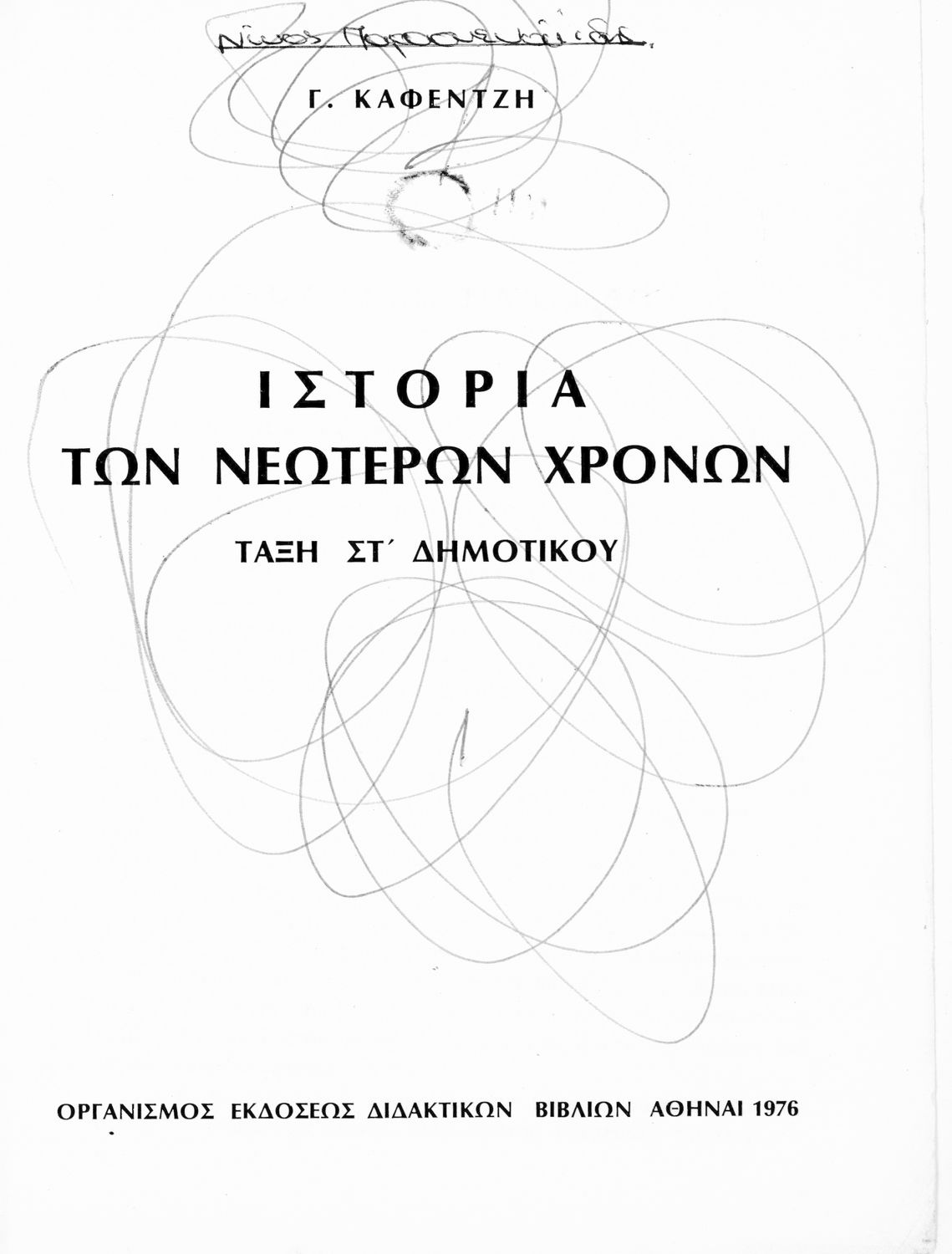 Κωδικός αναγνώρισης: 01-17086 Τίτλος: Ιστορία των Νεώτερων Χρόνων τάξη ΣΤ΄ Δημοτικού Συγγραφέας: Γ. Καφεντζής Μέγεθος και υπόστρωμα: Σχολικό εγχειρίδιο, μαλακό εξώφυλλο, 129 σελίδες. Σκίτσα, εικόνες και χάρτες (ασπρόμαυρα). |