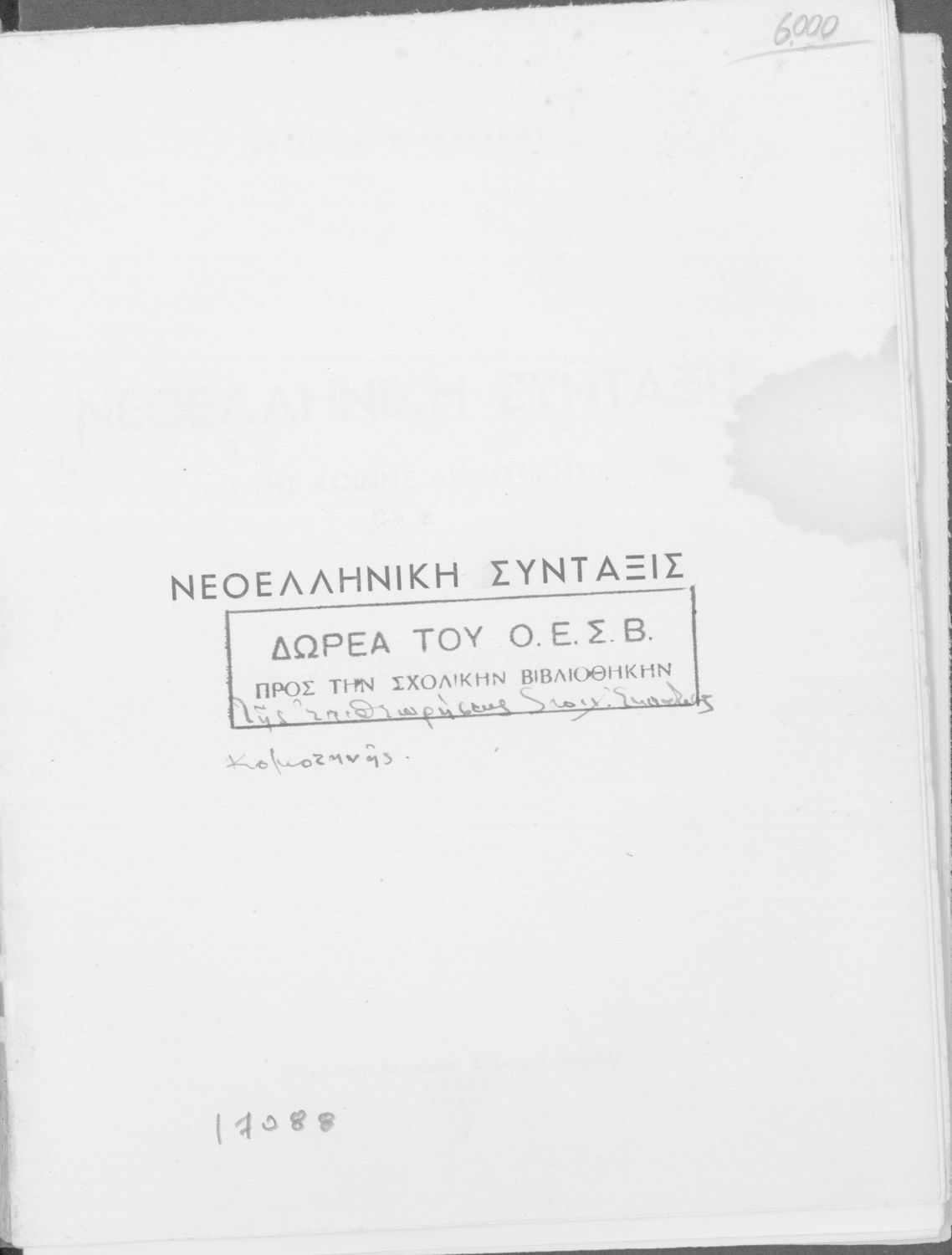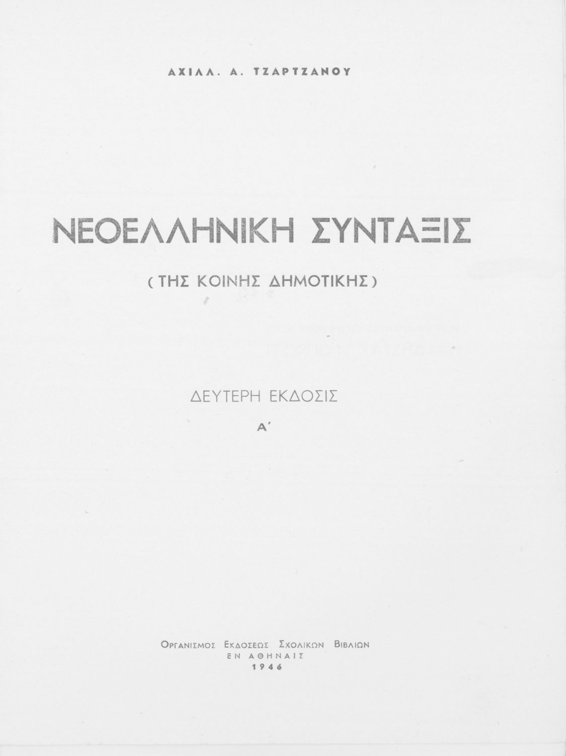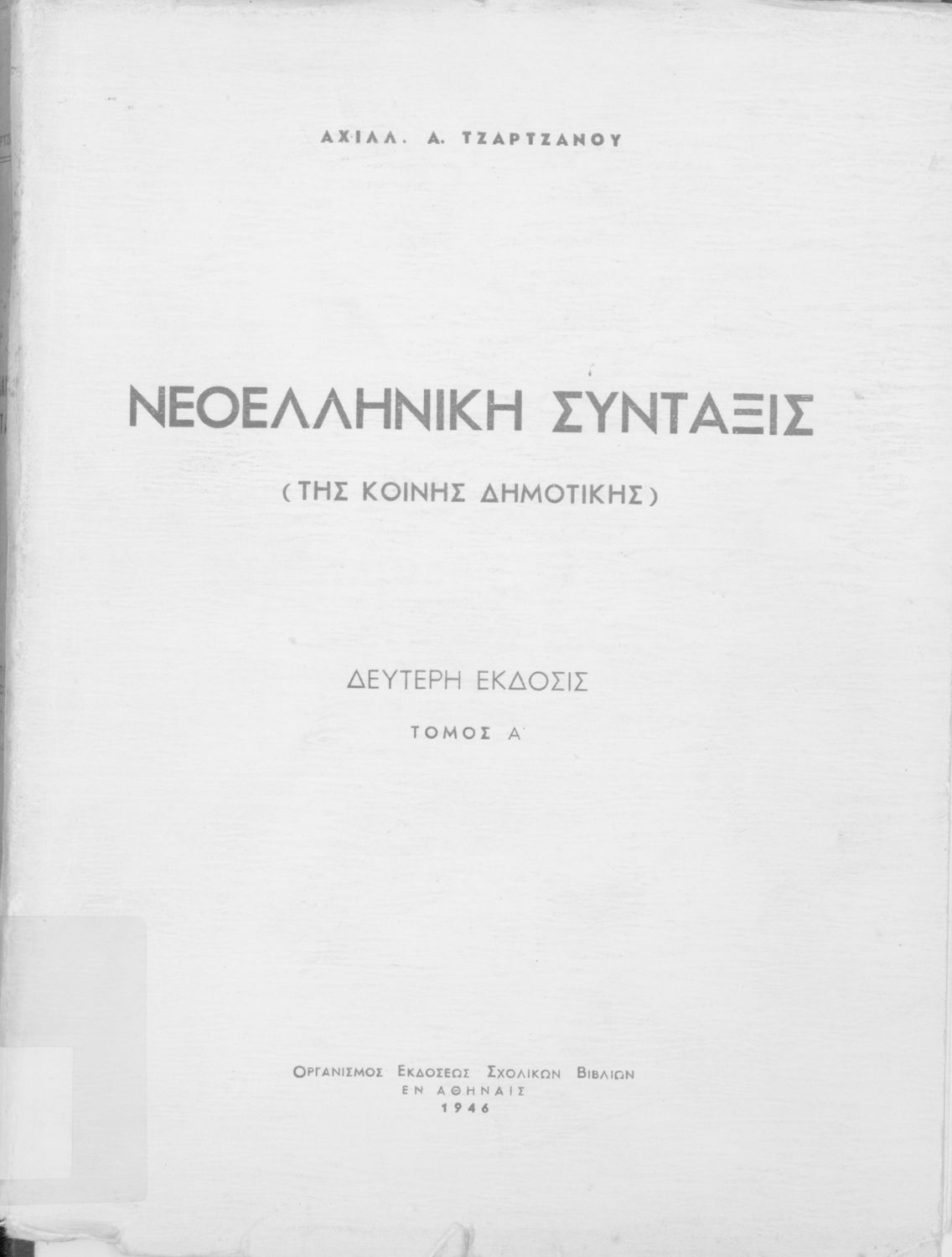 Κωδικός αναγνώρισης: 01-17088 Τίτλος: Νεοελληνική Σύνταξις (της κοινής Δημοτικής), Τόμος Α΄ Συγγραφέας: Αχιλλέας Α. Τζάρτζανος Μέγεθος και υπόστρωμα: Σχολικό εγχειρίδιο, 22εκ., σκληρό εξώφυλλο, 351 σελίδες. |