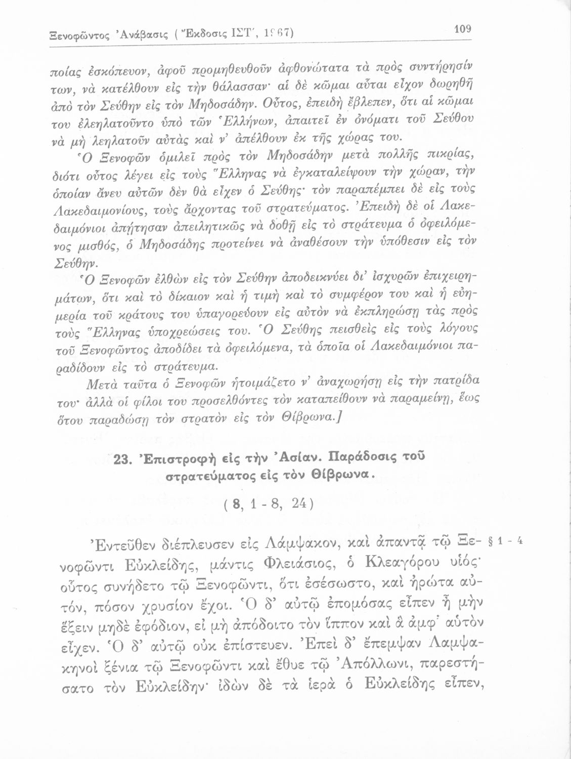 Σχολικό εγχειρίδιο Αρχαίων Ελληνικών για τη Β΄ Γυμνασίου. Πρόκειται για βιβλίο αρχαίων σε μετάφραση από το έργο του Ξενοφώντα. Στο βιβλίο απεικονίζεται το σύμβολο της επταετίας.