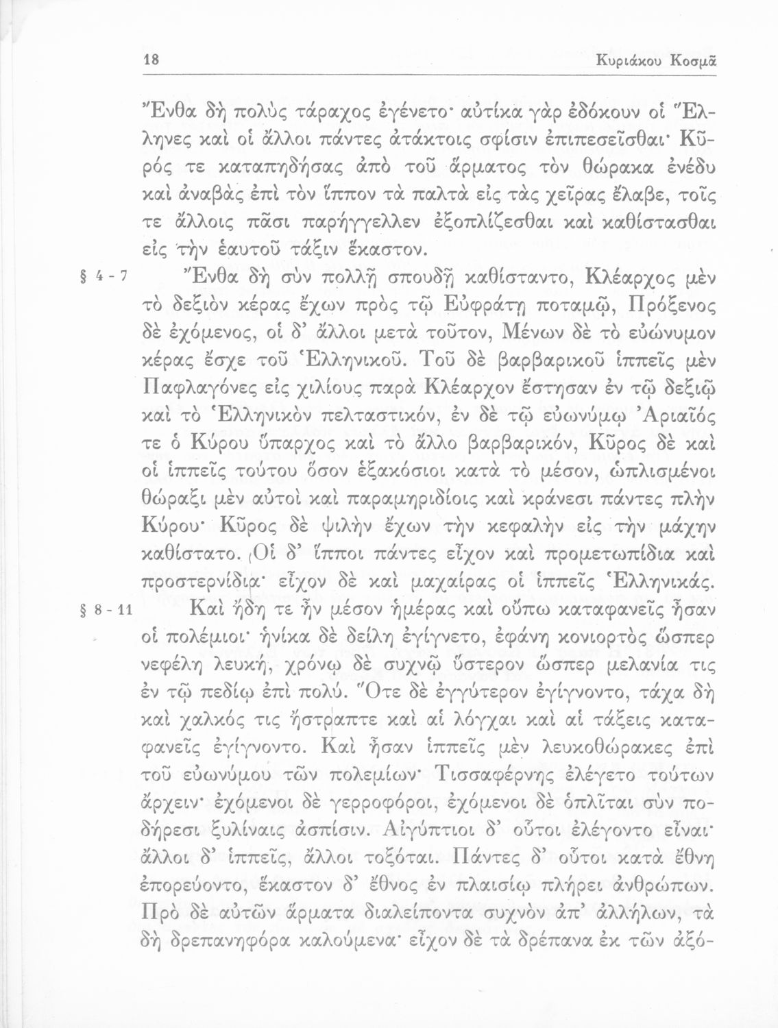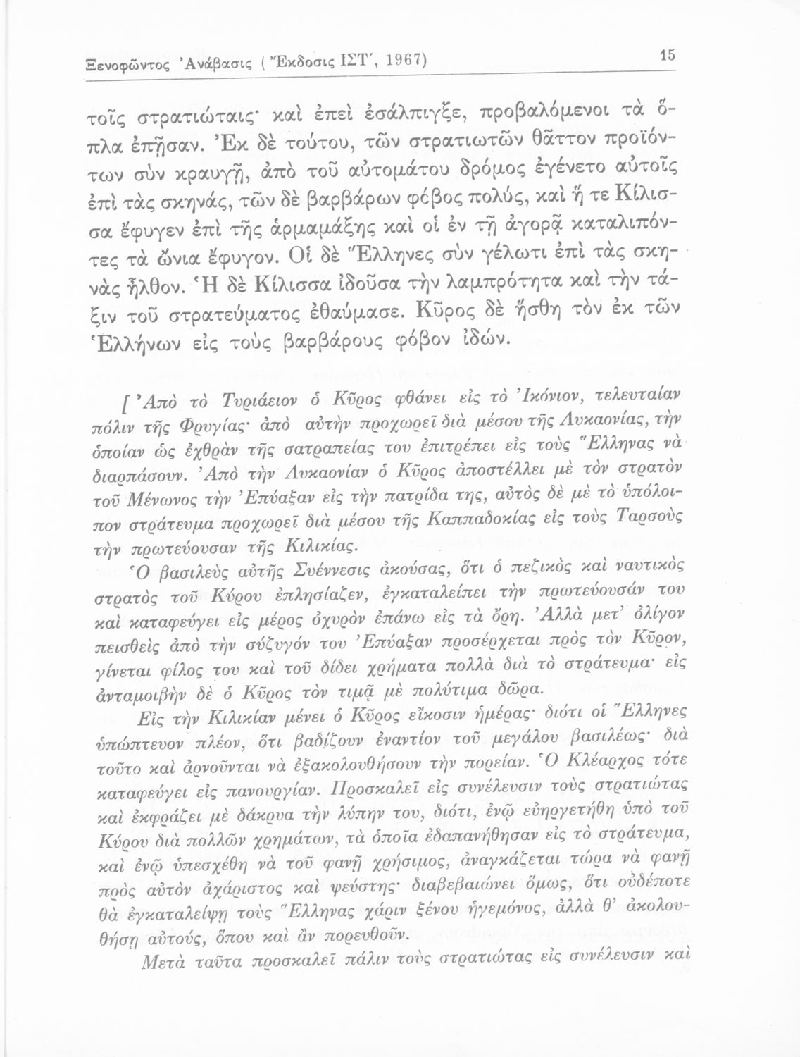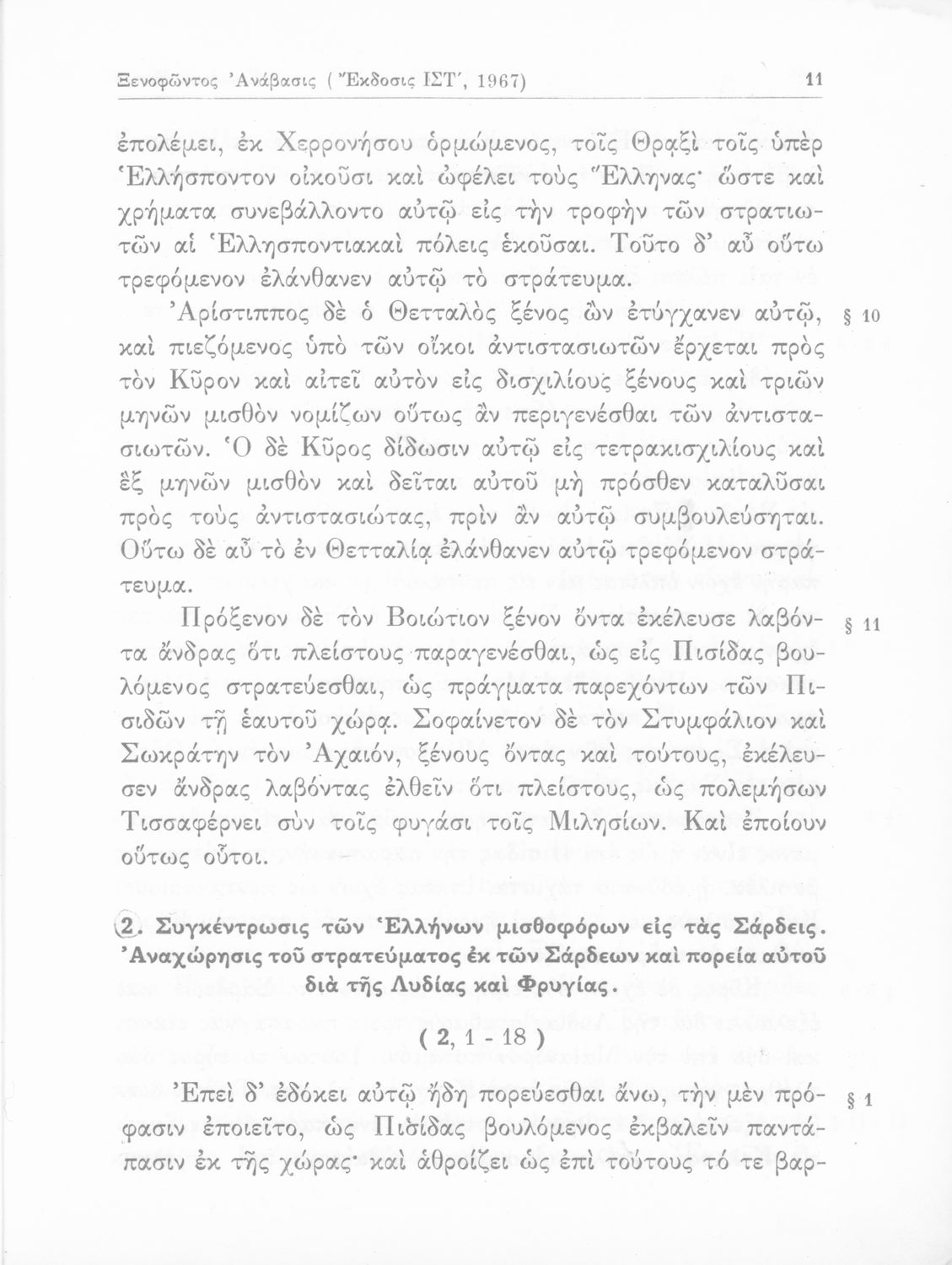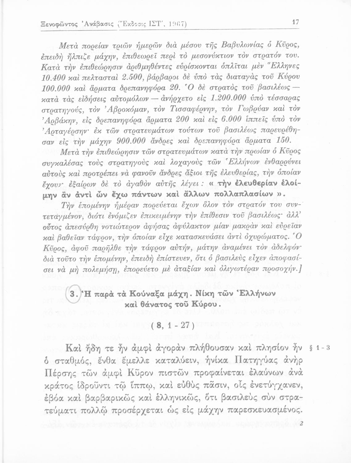 Σχολικό εγχειρίδιο Αρχαίων Ελληνικών Β΄ Γυμνασίου που περιλαμβάνει αποσπάσματα από το έργο του Ξενοφώντα Κύρου Ανάβασις, ερμηνευτικές σημειώσεις και πραγματολογικά σχόλια.