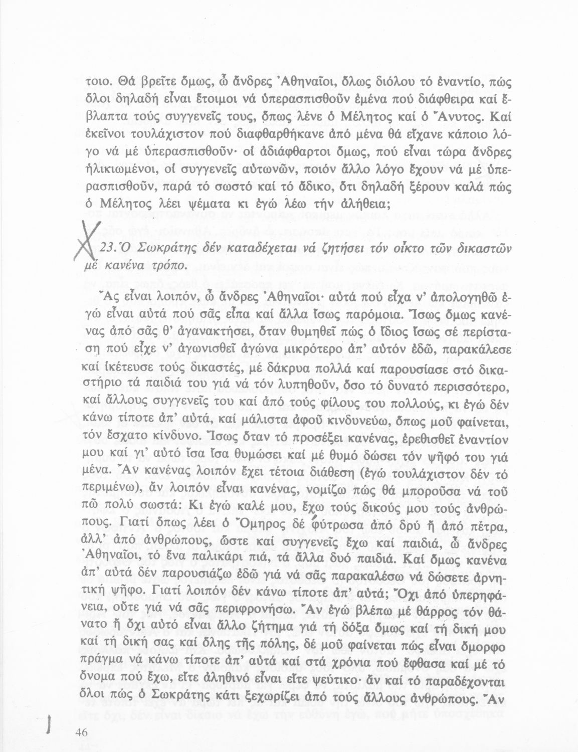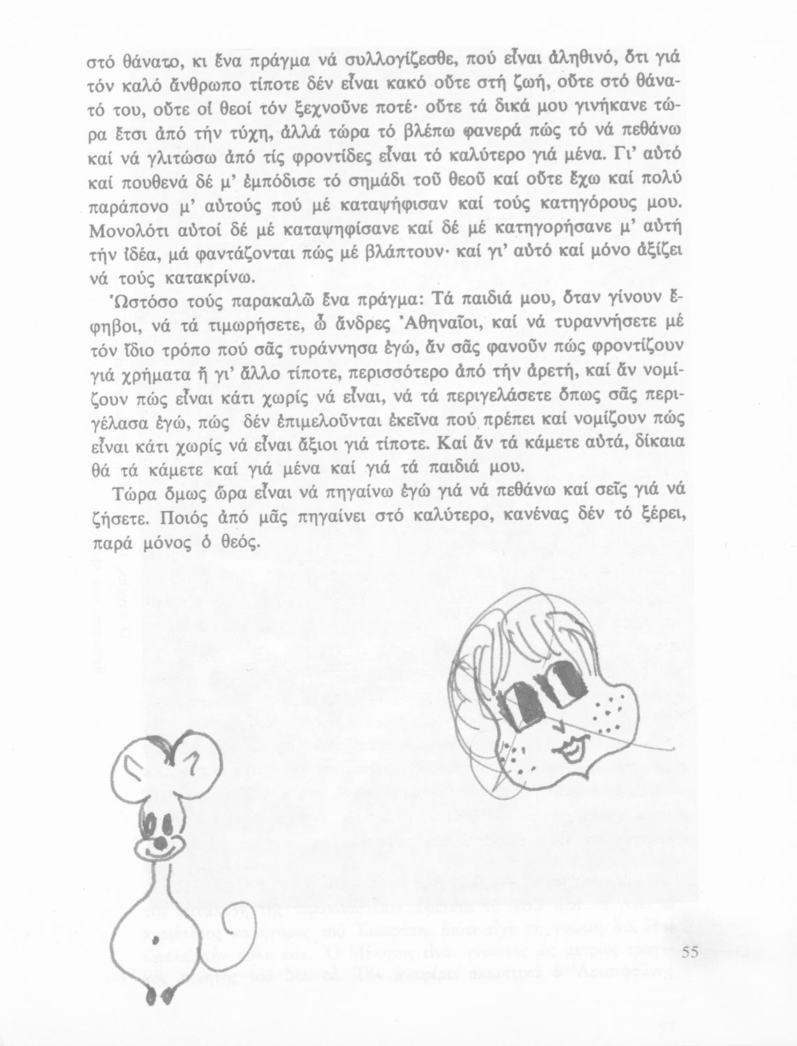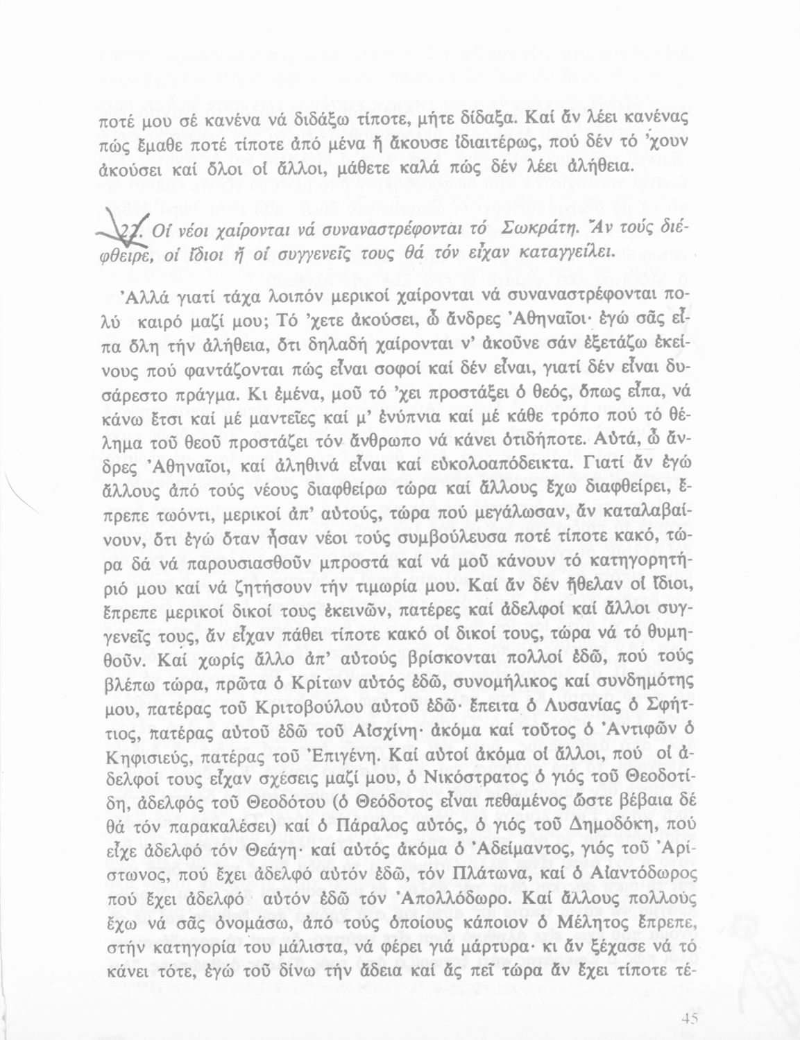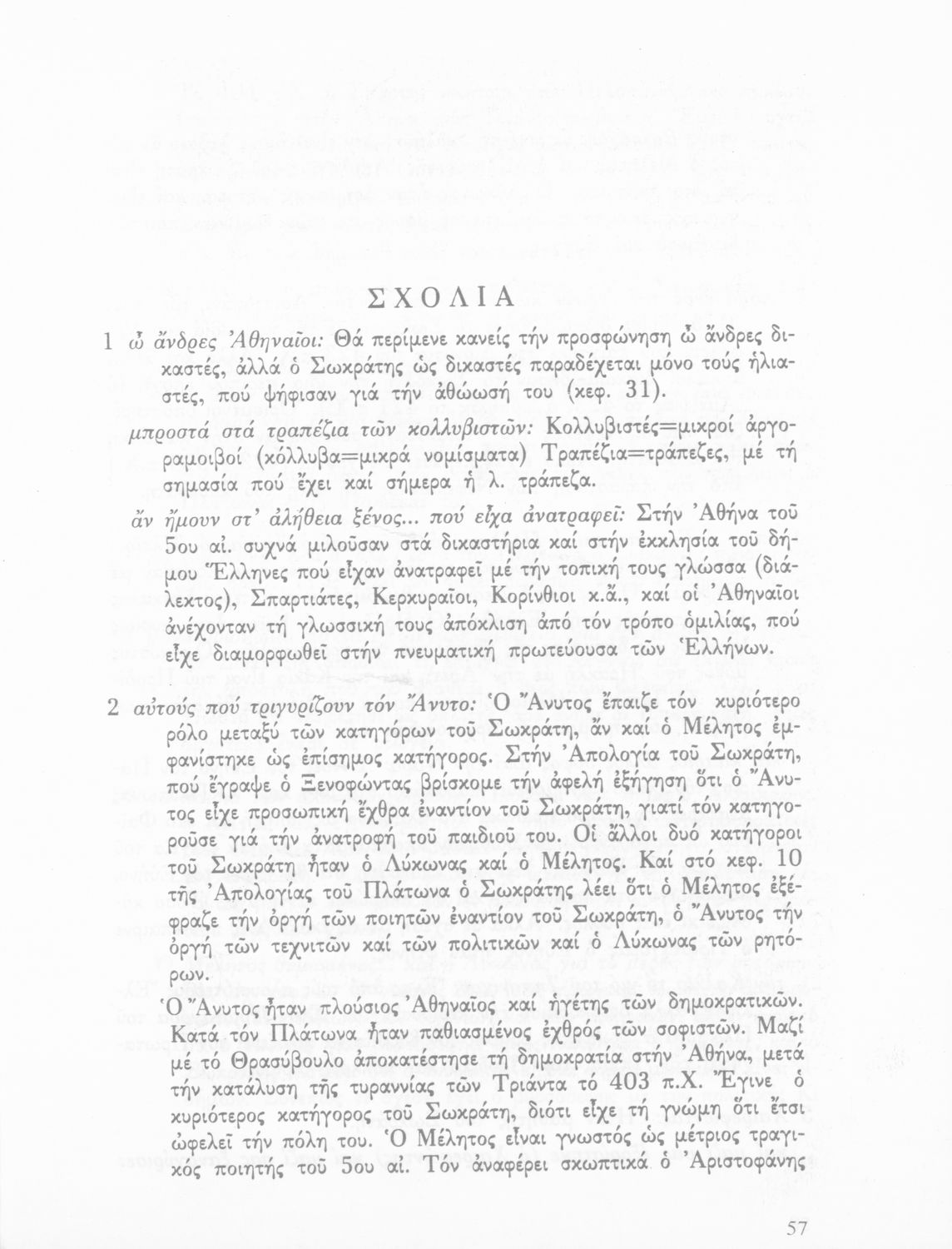 Σχολικό εγχειρίδιο Αρχαίων Ελληνικών Β΄ Λυκείου που περιλαμβάνει εισαγωγή στη ζωή και το έργο του Πλάτωνα, αναφορά στη ζωή και διδασκαλία του Σωκράτη, το έργο του Πλάτωνα Απολογία του Σωκράτη σε μετάφραση, ερμηνευτικές παρατηρήσεις και πραγματολογικά σχόλια . Η εισαγωγή, οι σημειώσεις και η ορθογραφική προσαρμογή έγιναν από τον κ. Ευάγγελο Σούλη, δ.φ., καθηγητή του Δ.Μ. Εκπαιδεύσεως.
