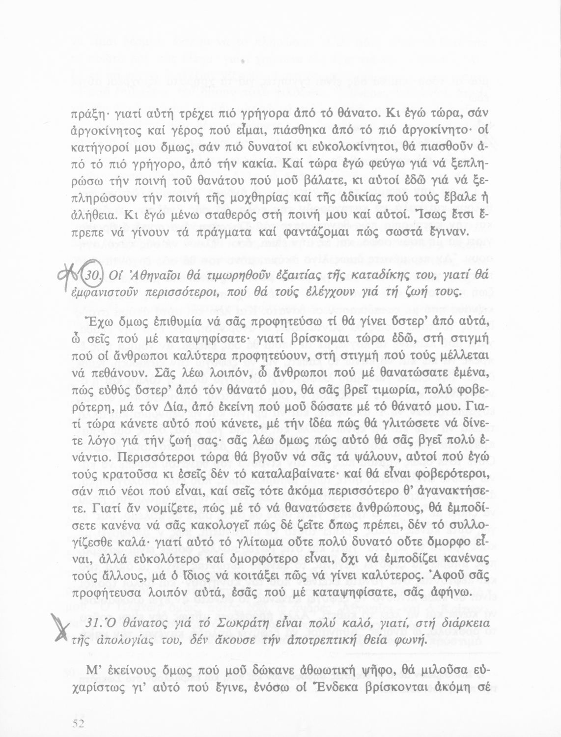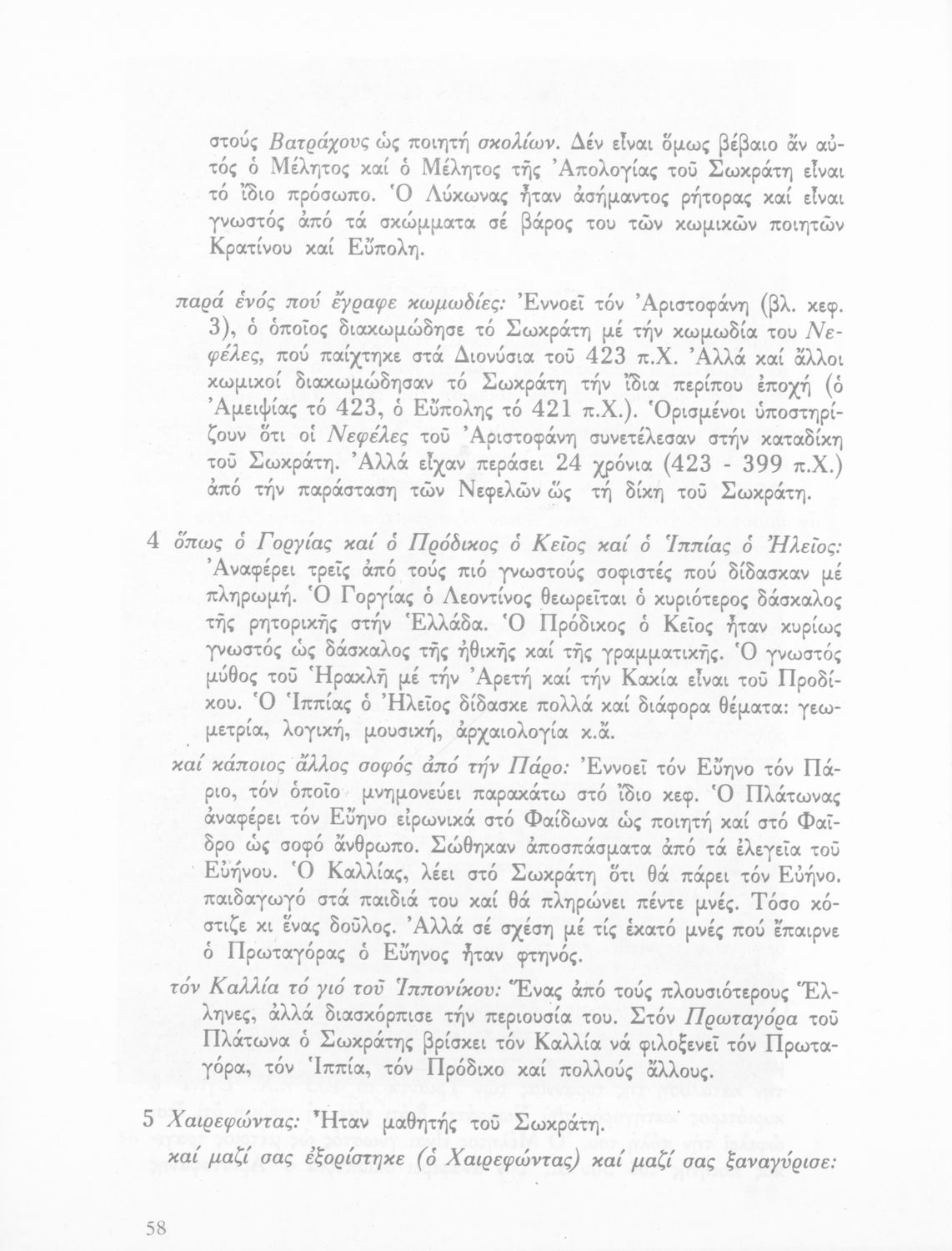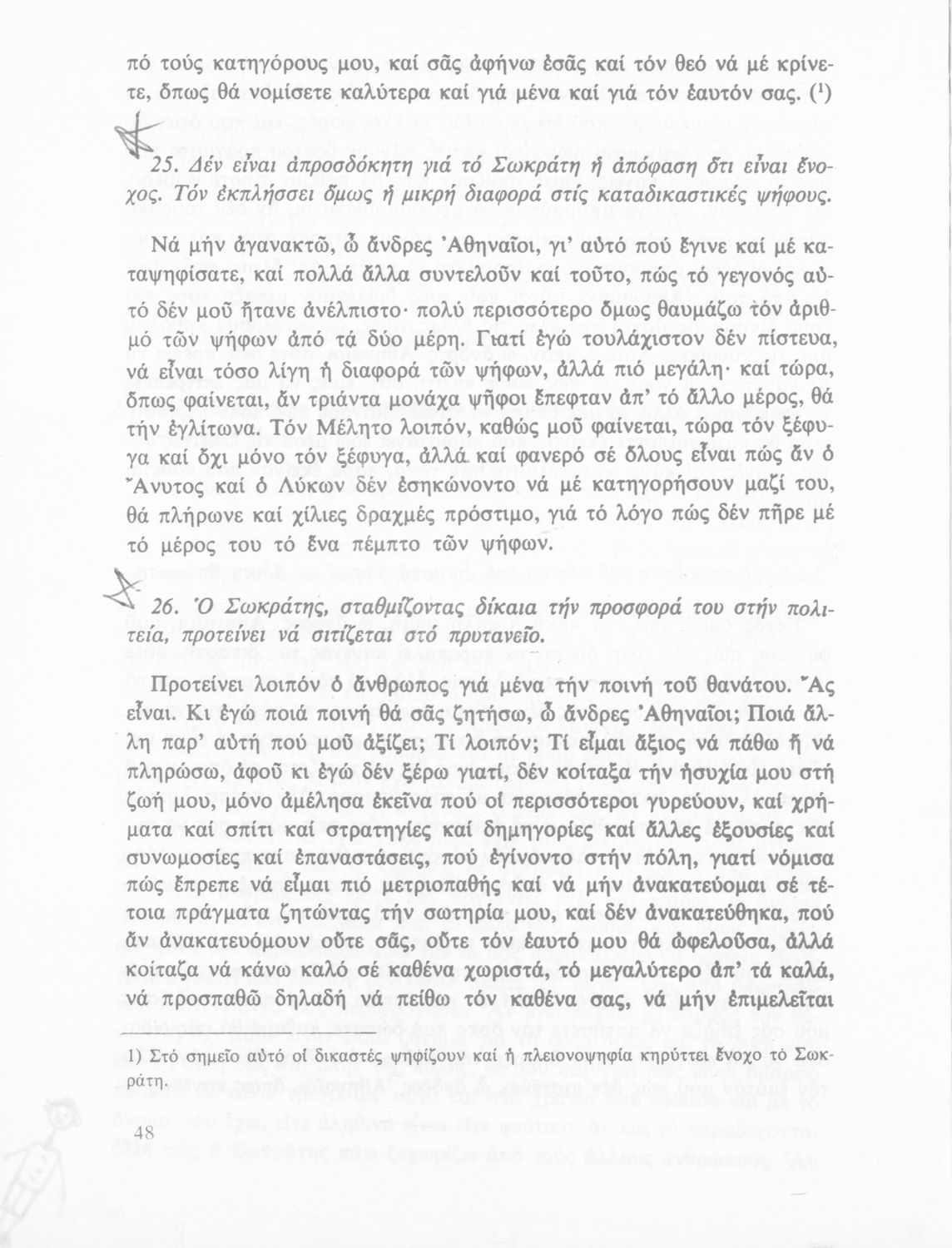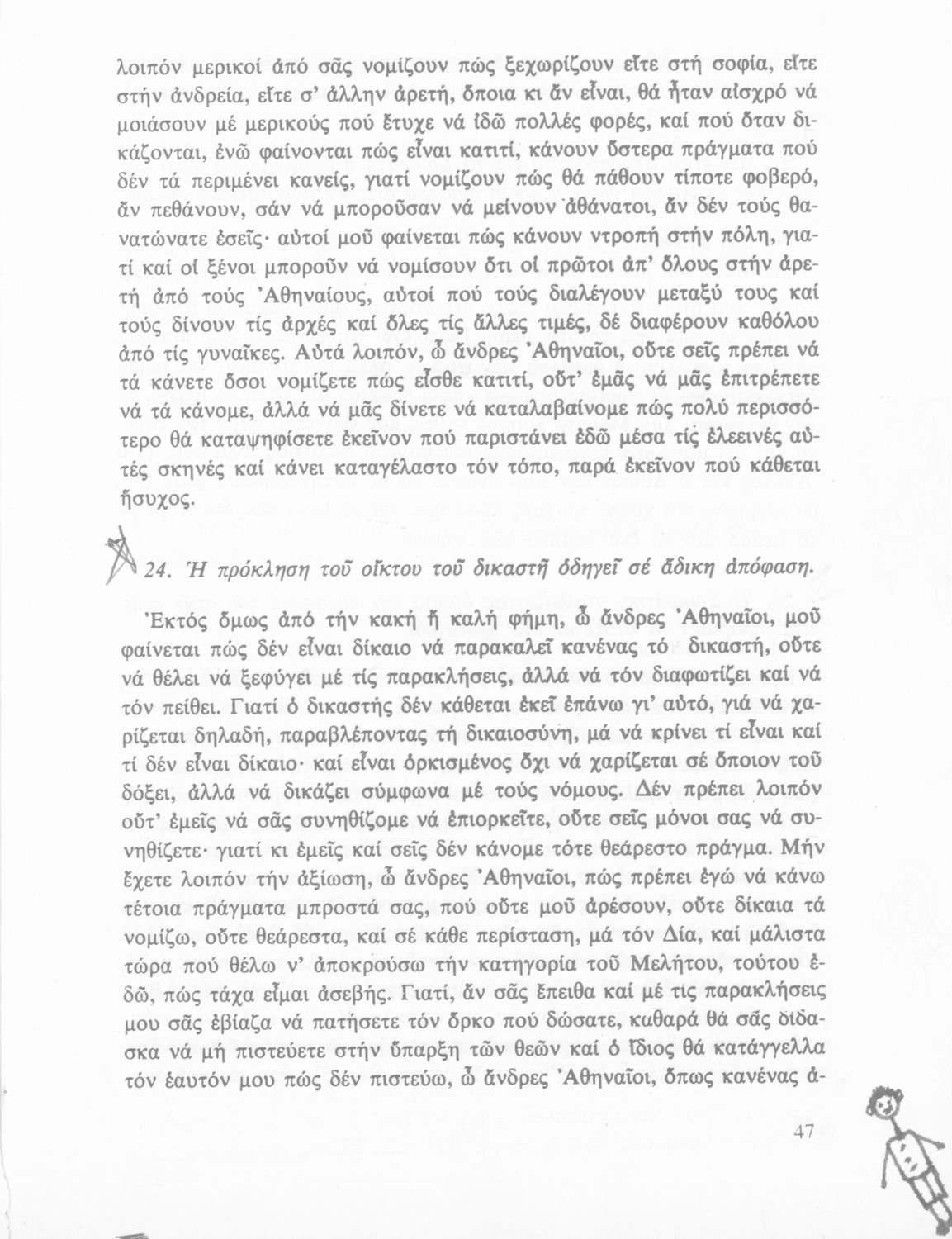 Σχολικό εγχειρίδιο Αρχαίων Ελληνικών Β΄ Λυκείου που περιλαμβάνει εισαγωγή στη ζωή και το έργο του Πλάτωνα, αναφορά στη ζωή και διδασκαλία του Σωκράτη, το έργο του Πλάτωνα Απολογία του Σωκράτη σε μετάφραση, ερμηνευτικές παρατηρήσεις και πραγματολογικά σχόλια . Η εισαγωγή, οι σημειώσεις και η ορθογραφική προσαρμογή έγιναν από τον κ. Ευάγγελο Σούλη, δ.φ., καθηγητή του Δ.Μ. Εκπαιδεύσεως.