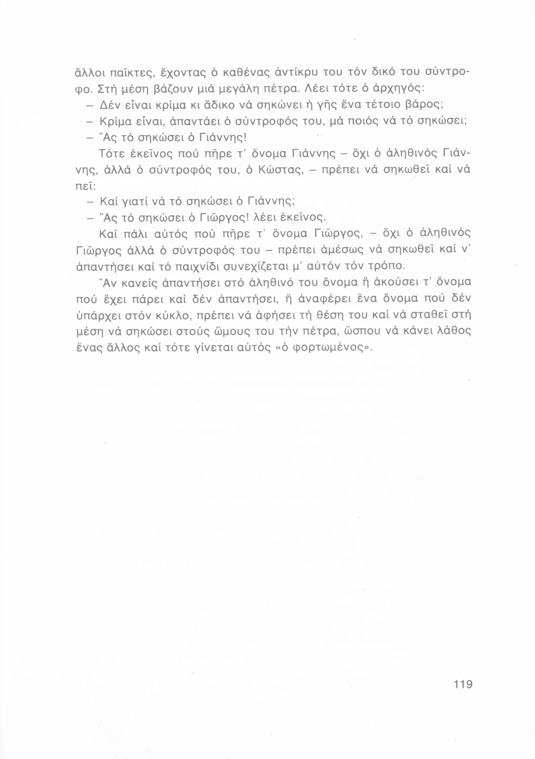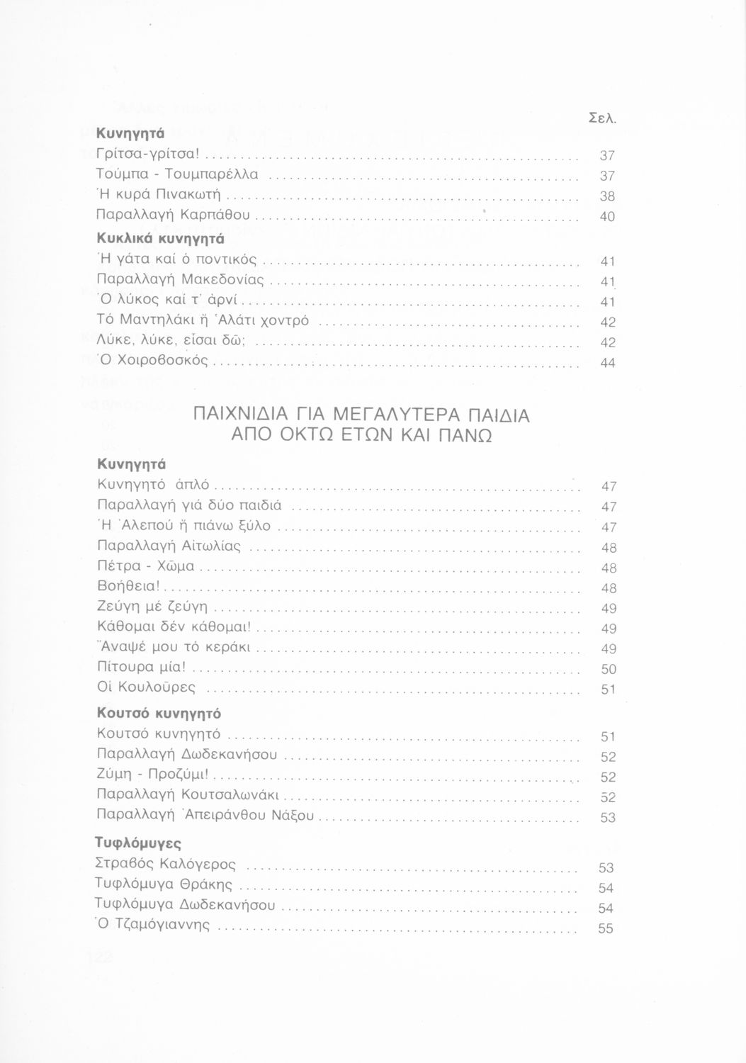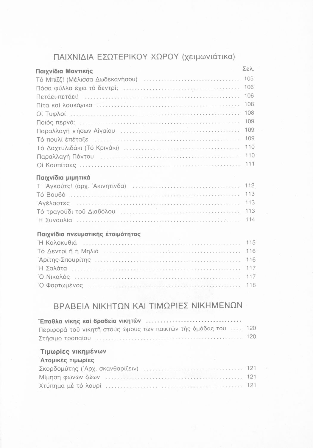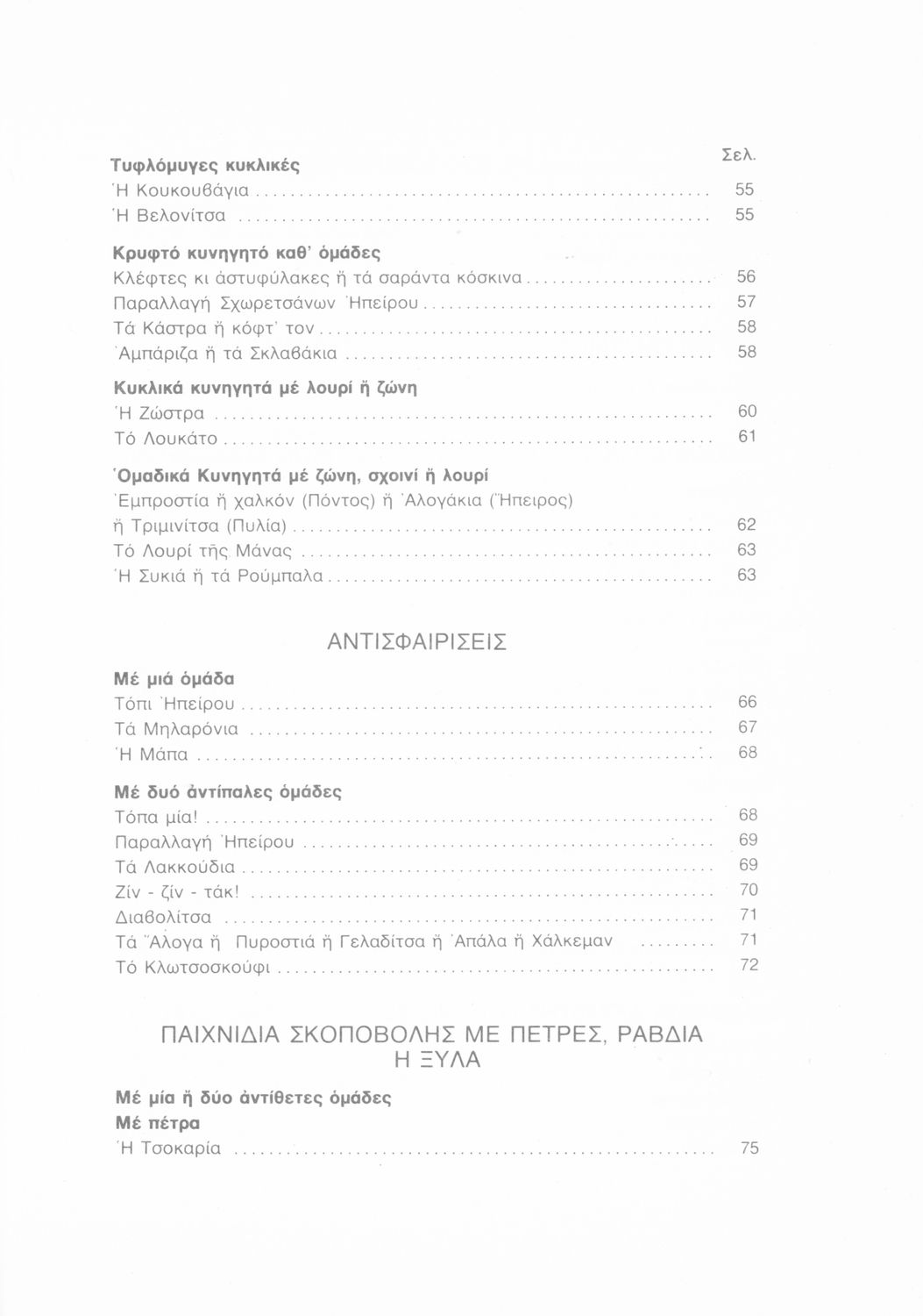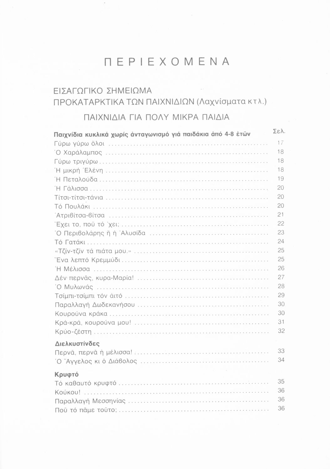 Παρουσίαση περιεχομένου: Εκπαιδευτικό βοήθημα για την Πρωτοβάθμια Εκπαίδευση. Το βιβλίο είναι μια συλλογή παραδοσιακών παιχνιδιών από όλη την Ελλάδα και τιμήθηκε με βραβείο από την Ακαδημία Αθηνών το 1978.