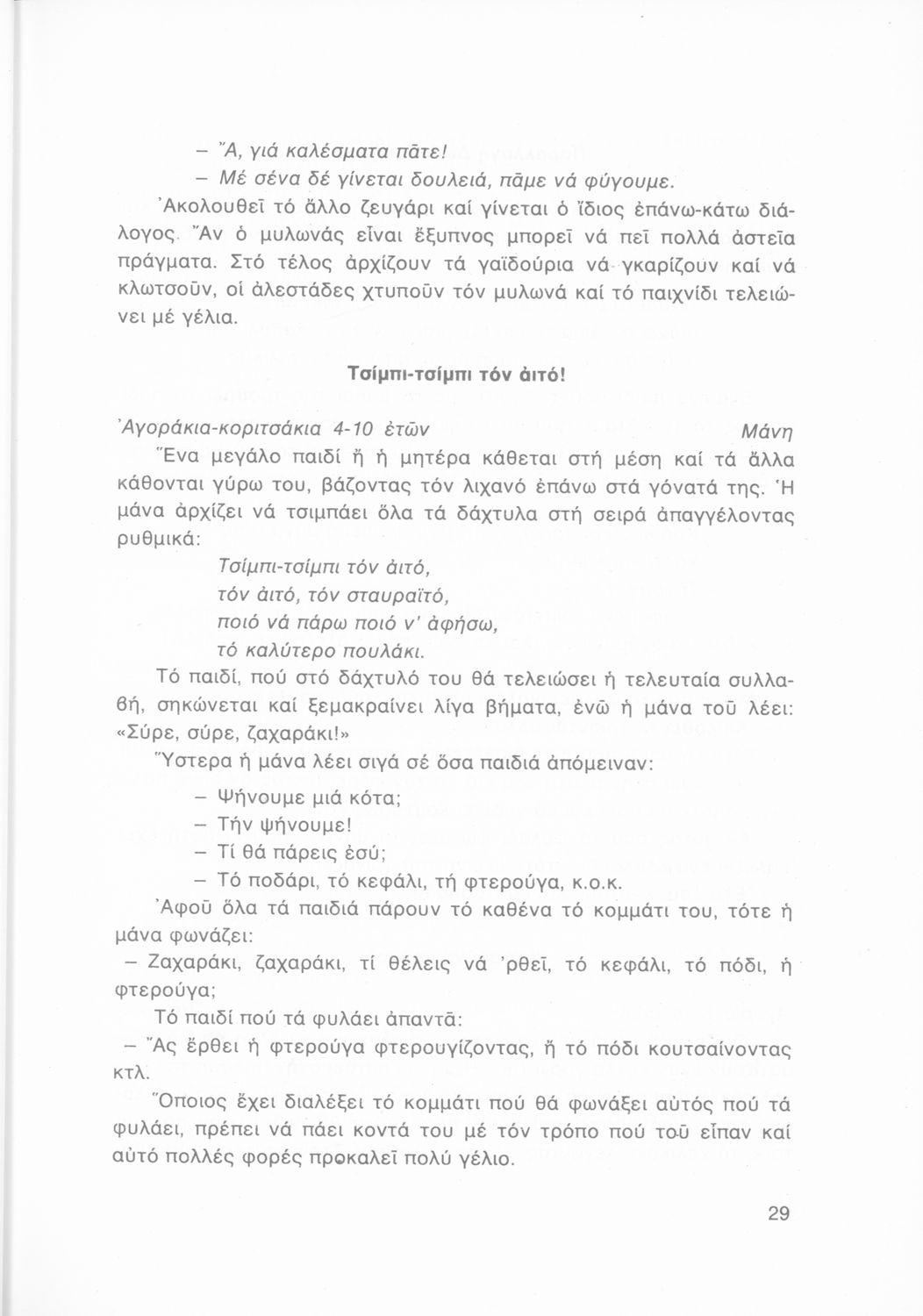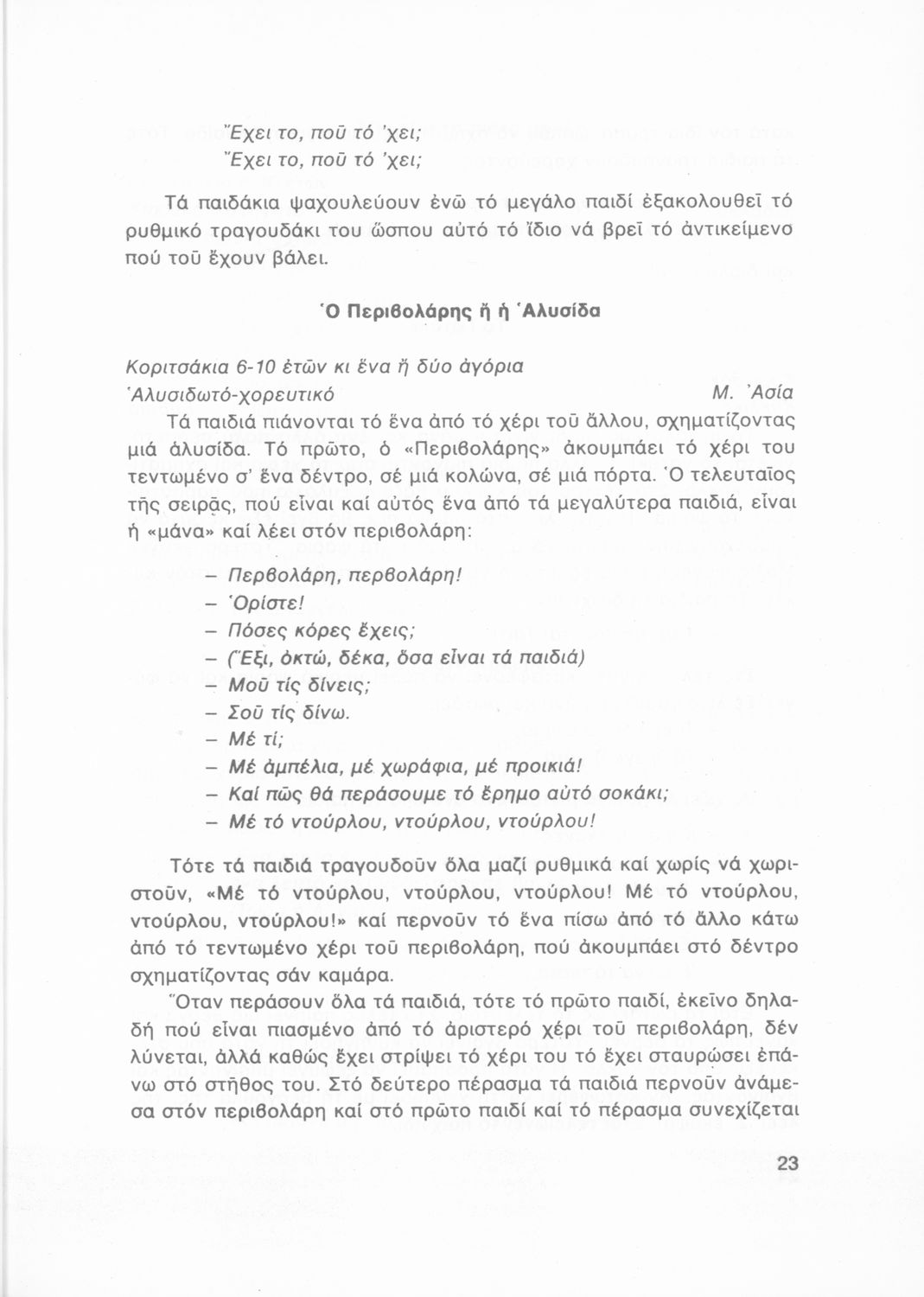 Εκπαιδευτικό βοήθημα για την Πρωτοβάθμια Εκπαίδευση. Το βιβλίο είναι μια συλλογή παραδοσιακών παιχνιδιών από όλη την Ελλάδα και τιμήθηκε με βραβείο από την Ακαδημία Αθηνών το 1978.