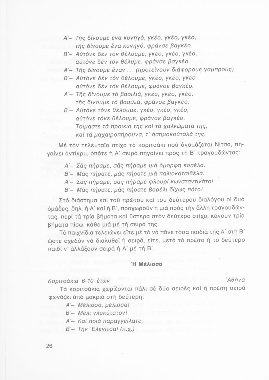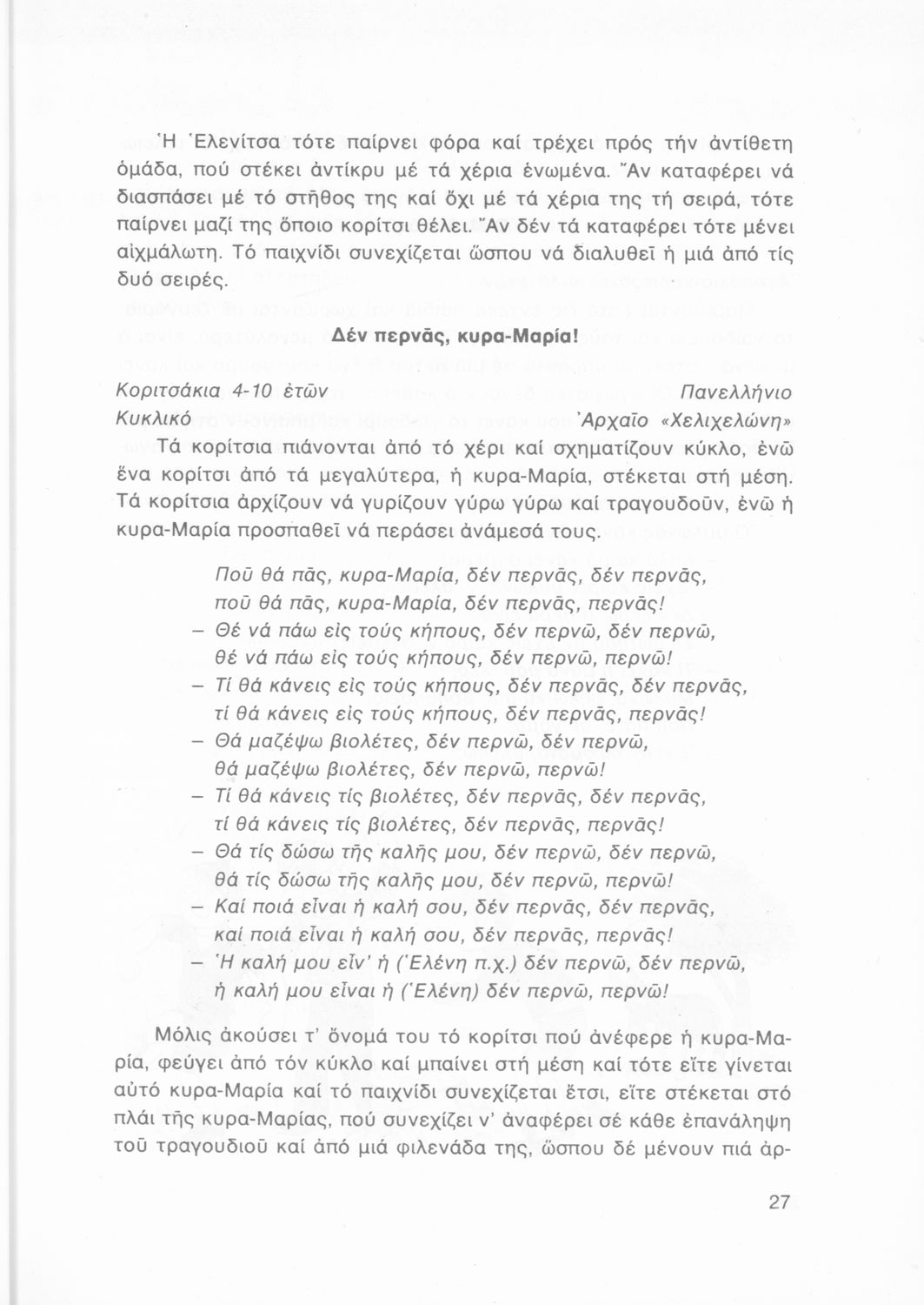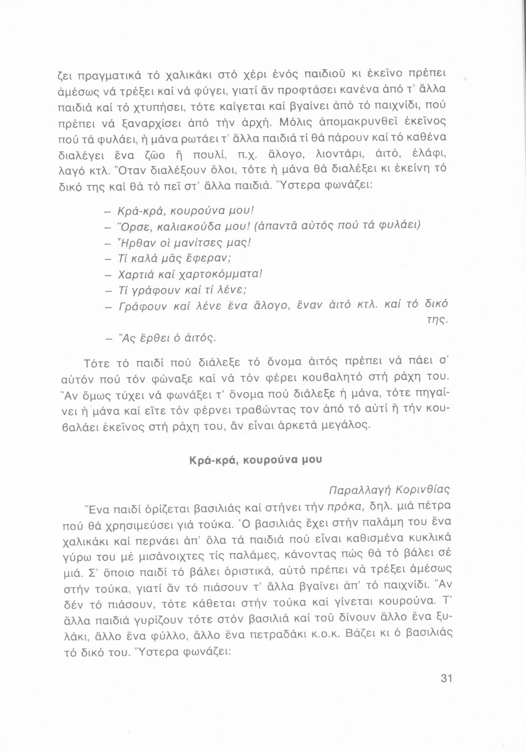 Παρουσίαση περιεχομένου: Εκπαιδευτικό βοήθημα για την Πρωτοβάθμια Εκπαίδευση. Το βιβλίο είναι μια συλλογή παραδοσιακών παιχνιδιών από όλη την Ελλάδα και τιμήθηκε με βραβείο από την Ακαδημία Αθηνών το 1978.