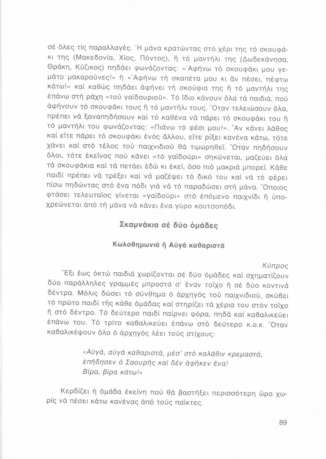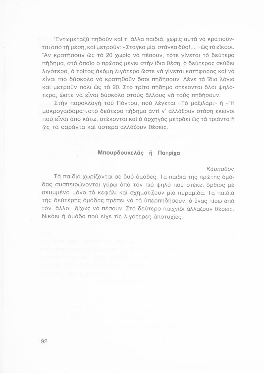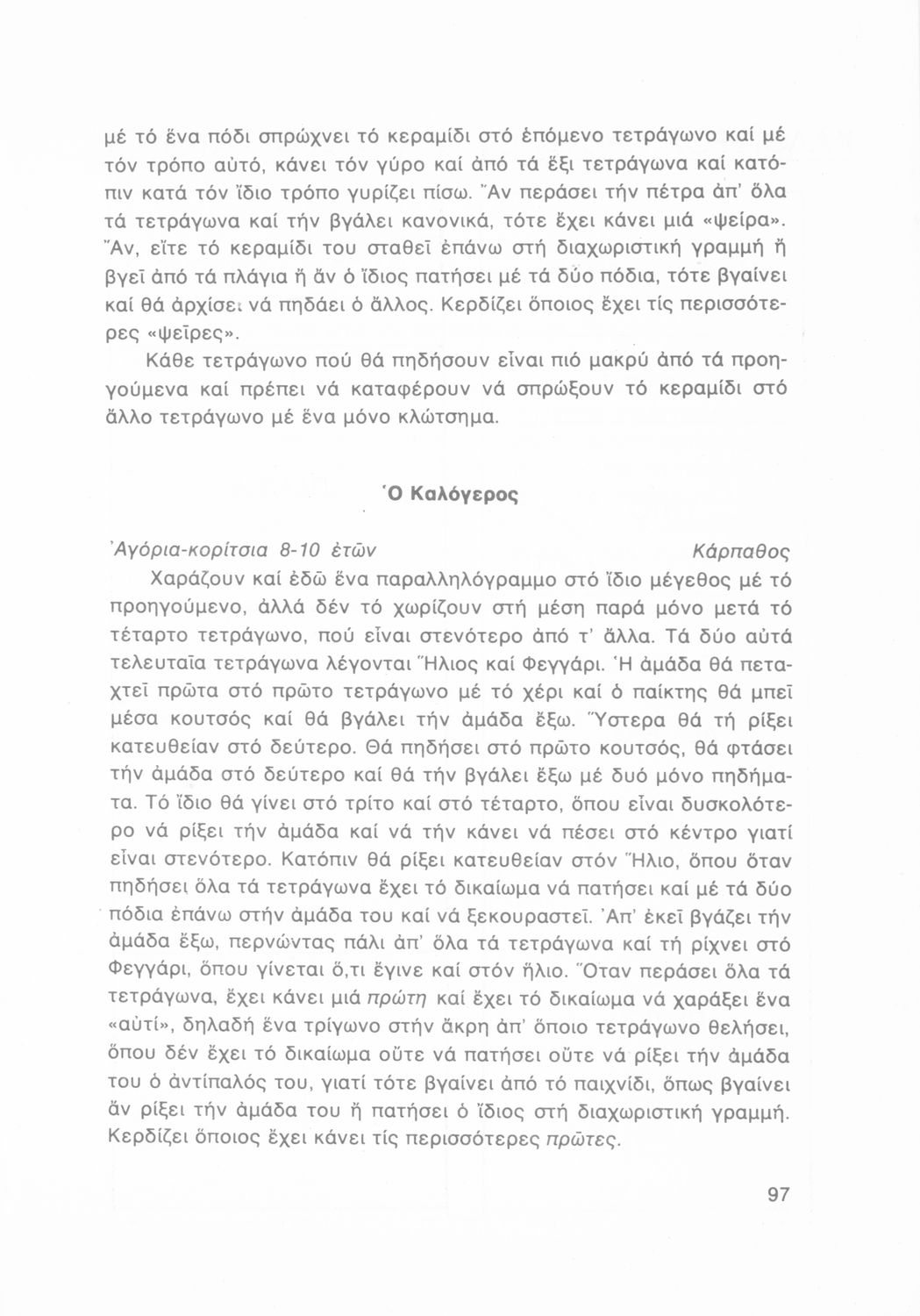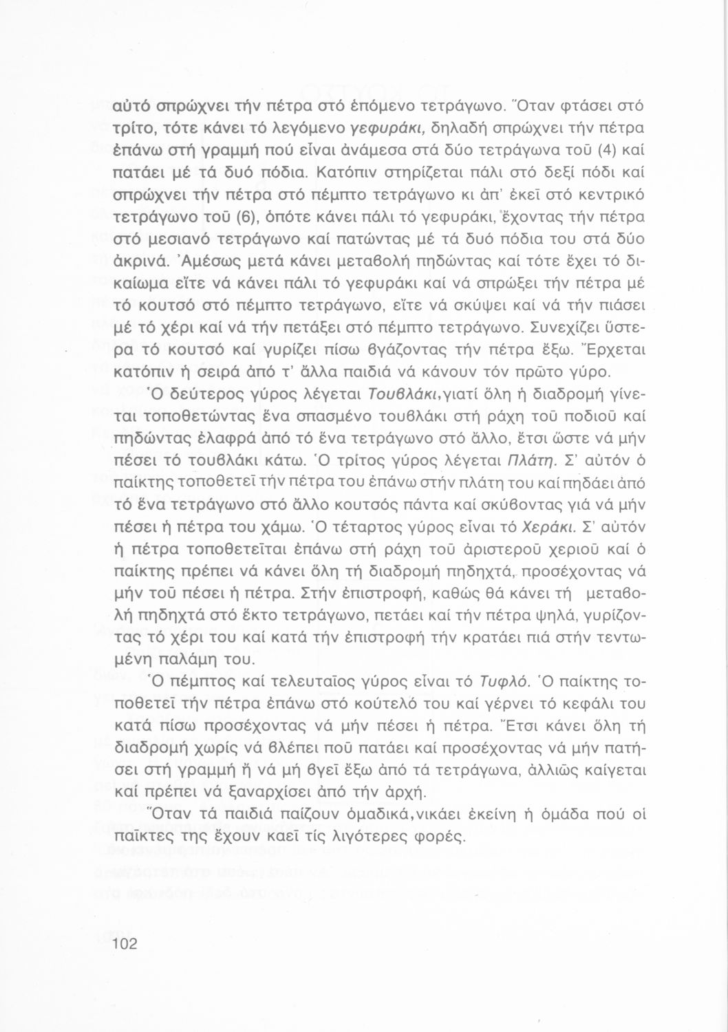 Εκπαιδευτικό βοήθημα για την Πρωτοβάθμια Εκπαίδευση. Το βιβλίο είναι μια συλλογή παραδοσιακών παιχνιδιών από όλη την Ελλάδα και τιμήθηκε με βραβείο από την Ακαδημία Αθηνών το 1978.