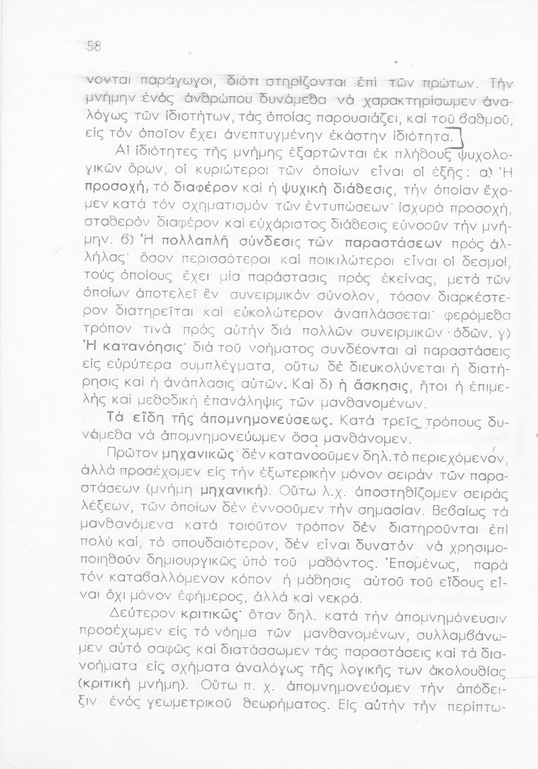 Βαθμίδα εκπαίδευσης: Δευτεροβάθμια Τάξη: Ε' Γυμνασίου Μάθημα: Ψυχολογία Γλώσσα: Απλή καθαρεύουσα Παρουσίαση περιεχομένου: Σχολικό εγχειρίδιο Ψυχολογίας για την Ε΄ Γυμνασίου χωρισμένο σε δύο τμήματα που μελετούν τα γνωστικά φαινόμενα και τα συναισθήματα. Περιέχει παράρτημα για τη φυσιολογική βάση των ψυχικών φαινομένων. |