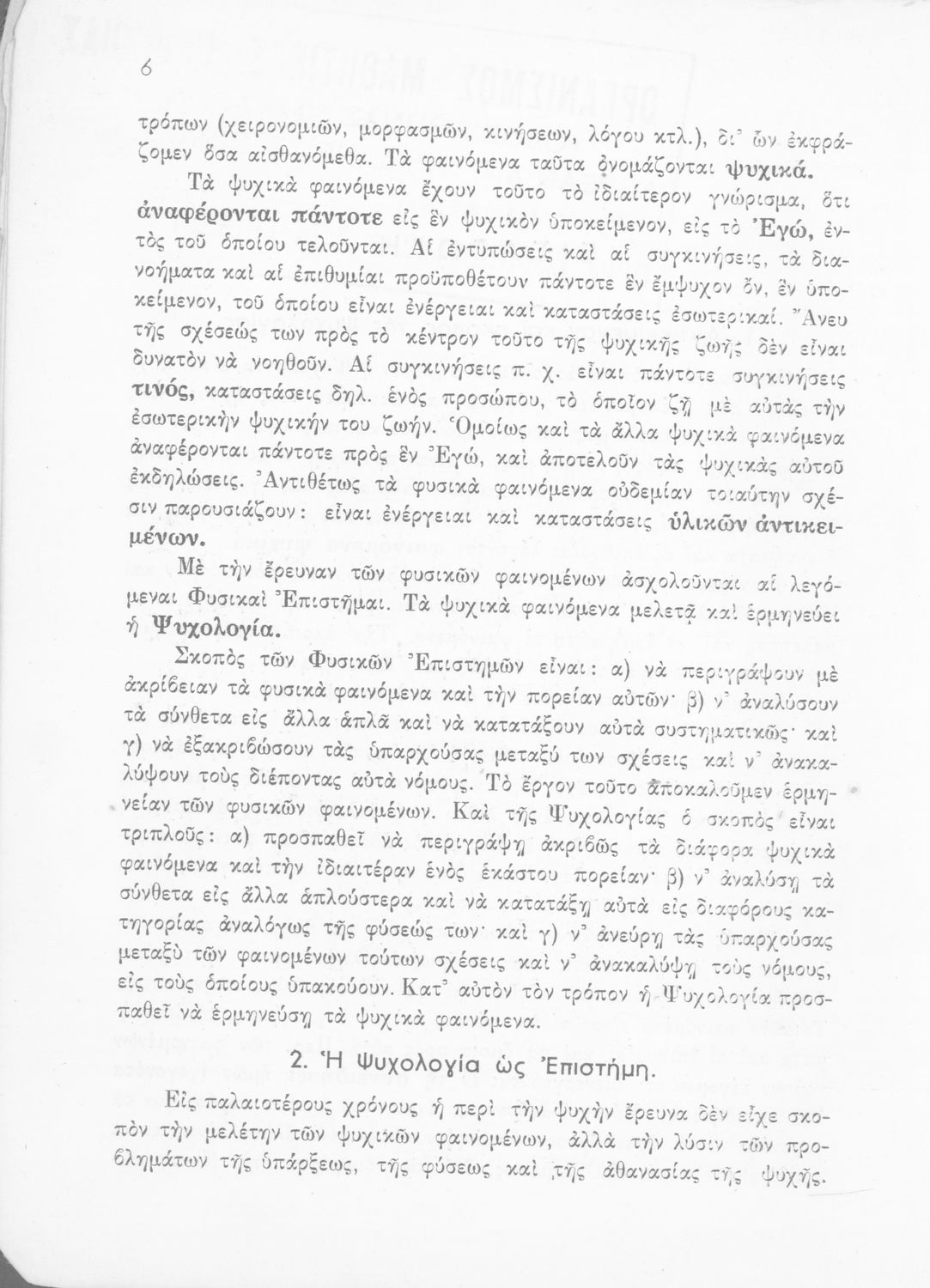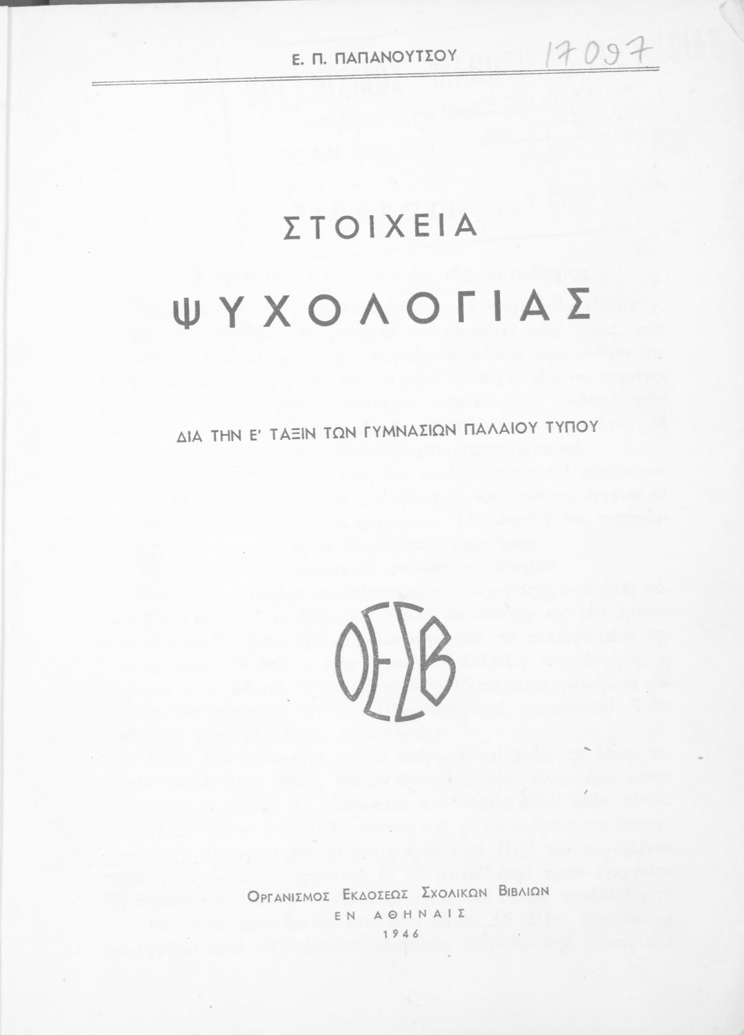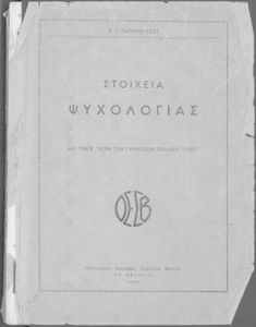 Κωδικός αναγνώρισης: 01-17097 Τίτλος: Στοιχεία ψυχολογίας δια την Ε΄ τάξιν των Γυμνασίων παλαιού τύπου Συγγραφέας: Ε. Π. Παπανούτσος Μέγεθος και υπόστρωμα: Σχολικό εγχειρίδιο, μαλακό εξώφυλλο, 144 σελίδες. Σκίτσα (ασπρόμαυρα). |