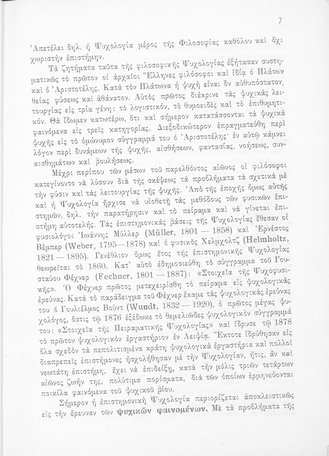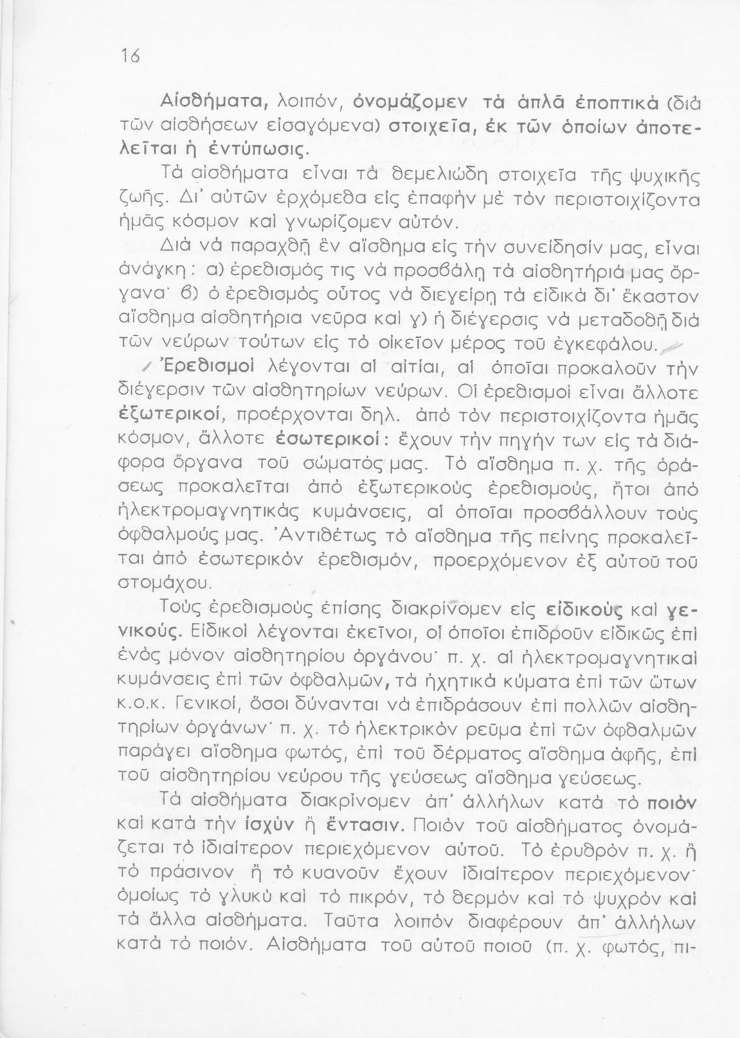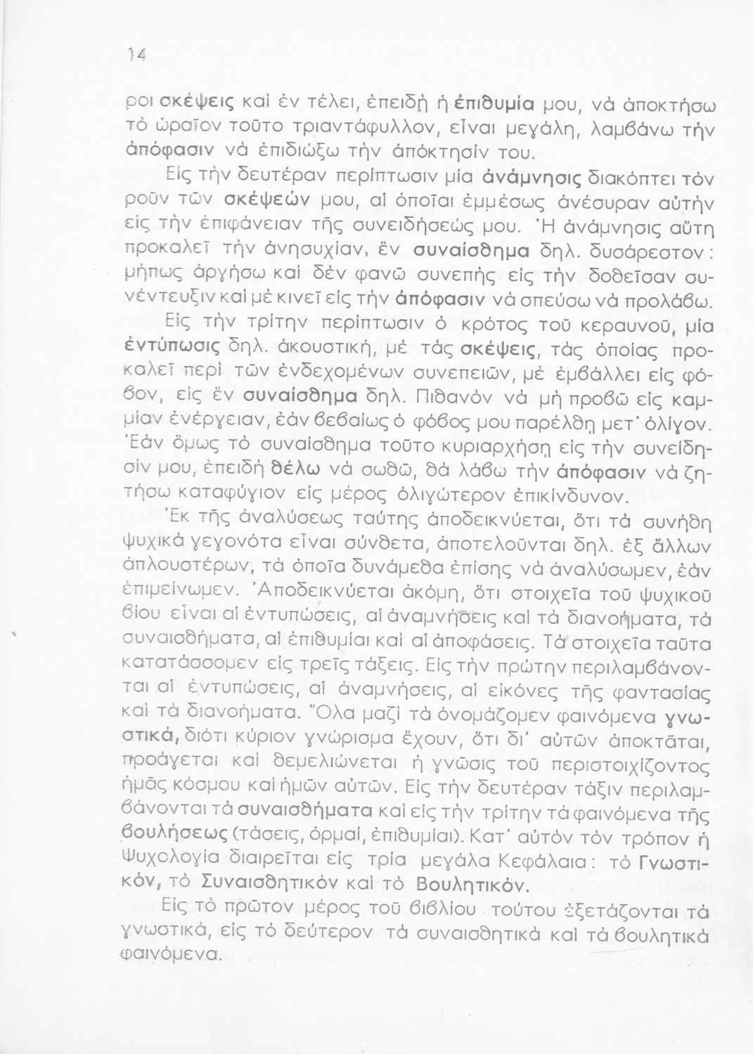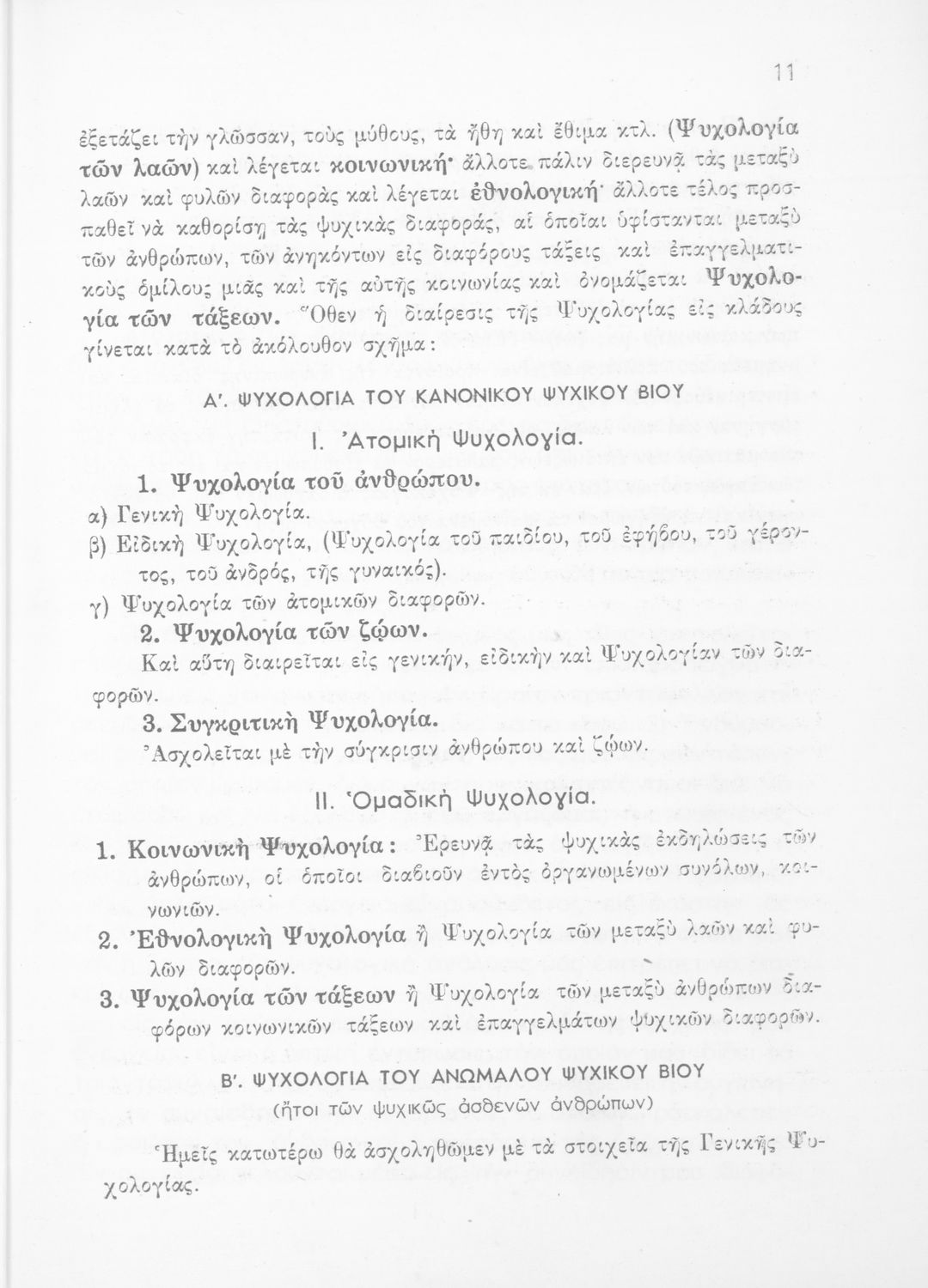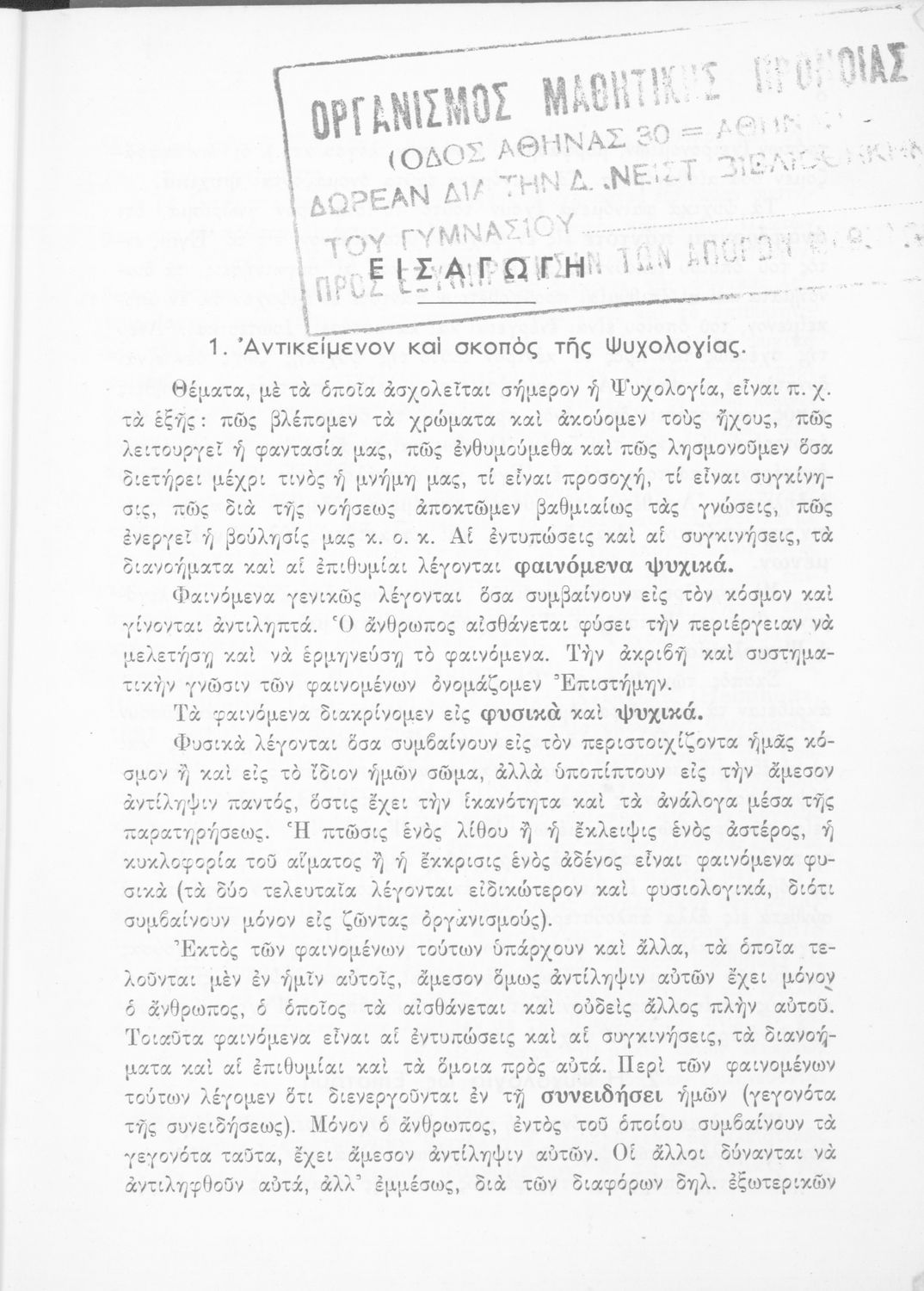 Βαθμίδα εκπαίδευσης: Δευτεροβάθμια Τάξη: Ε' Γυμνασίου Μάθημα: Ψυχολογία Γλώσσα: Απλή καθαρεύουσα Παρουσίαση περιεχομένου: Σχολικό εγχειρίδιο Ψυχολογίας για την Ε΄ Γυμνασίου χωρισμένο σε δύο τμήματα που μελετούν τα γνωστικά φαινόμενα και τα συναισθήματα. Περιέχει παράρτημα για τη φυσιολογική βάση των ψυχικών φαινομένων. |