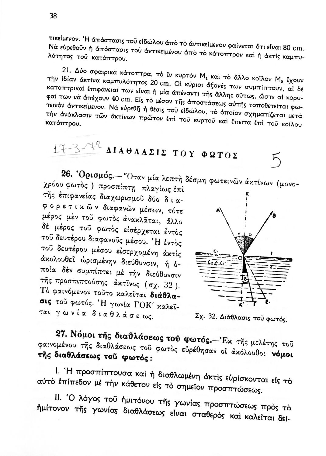 Σχολικό εγχειρίδιο Φυσικής Πειραματικής Ε΄ και ΣΤ΄ Γυμνασίου που εστιάζει στα φυσικά φαινόμενα της οπτικής, του μαγνητισμού, του ηλεκτρισμού, και της πυρηνικής φυσικής. Φέρει το σύμβολο της δικτατορίας.
