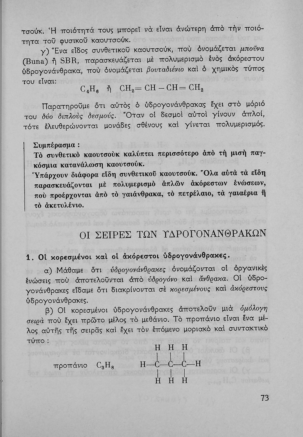 Σχολικό εγχειρίδιο Χημείας Γ΄ Γυμνασίου που περιέχει εισαγωγή στην οργανική χημεία και εστιάζει στους υδρογονάνθρακες, τα σάκχαρα και τα λιπαρά σώματα.