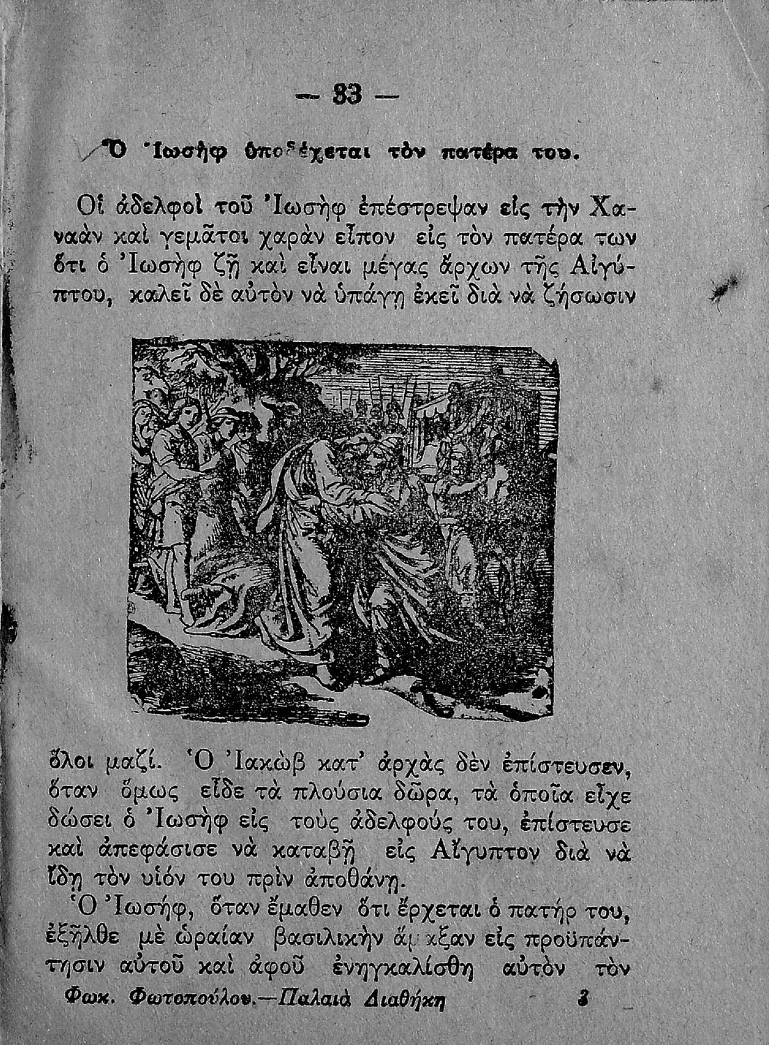 Άπασα η ύλη των εν τω δημ. σχολείω διδασκομένων μαθημάτων κατά το επίσημον αναλυτικόν πρόγραμμα του Υπουργ. Παιδείας, τόμος Α, περιέχων την ύλην των εν τη Δευτέρα, Τρίτη και Τετάρτη τάξη διδασκομένων μαθημάτων. Ιερά ιστορία της Παλαιάς Διαθήκης περιέχουσα την ύλην του προγράμματος της 1ης Σεπτεμβρίου 1913 μετά πολλών εικόνων