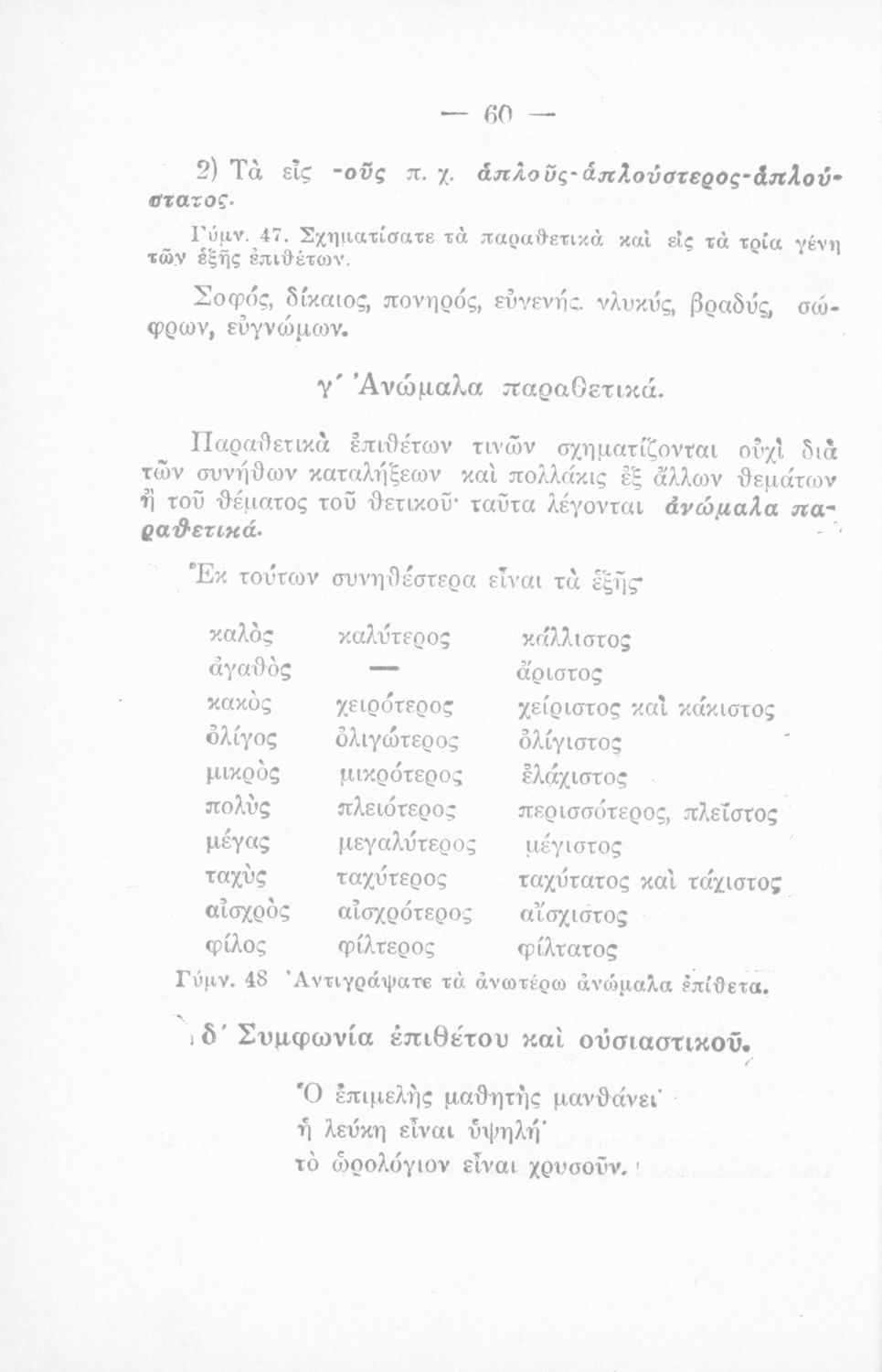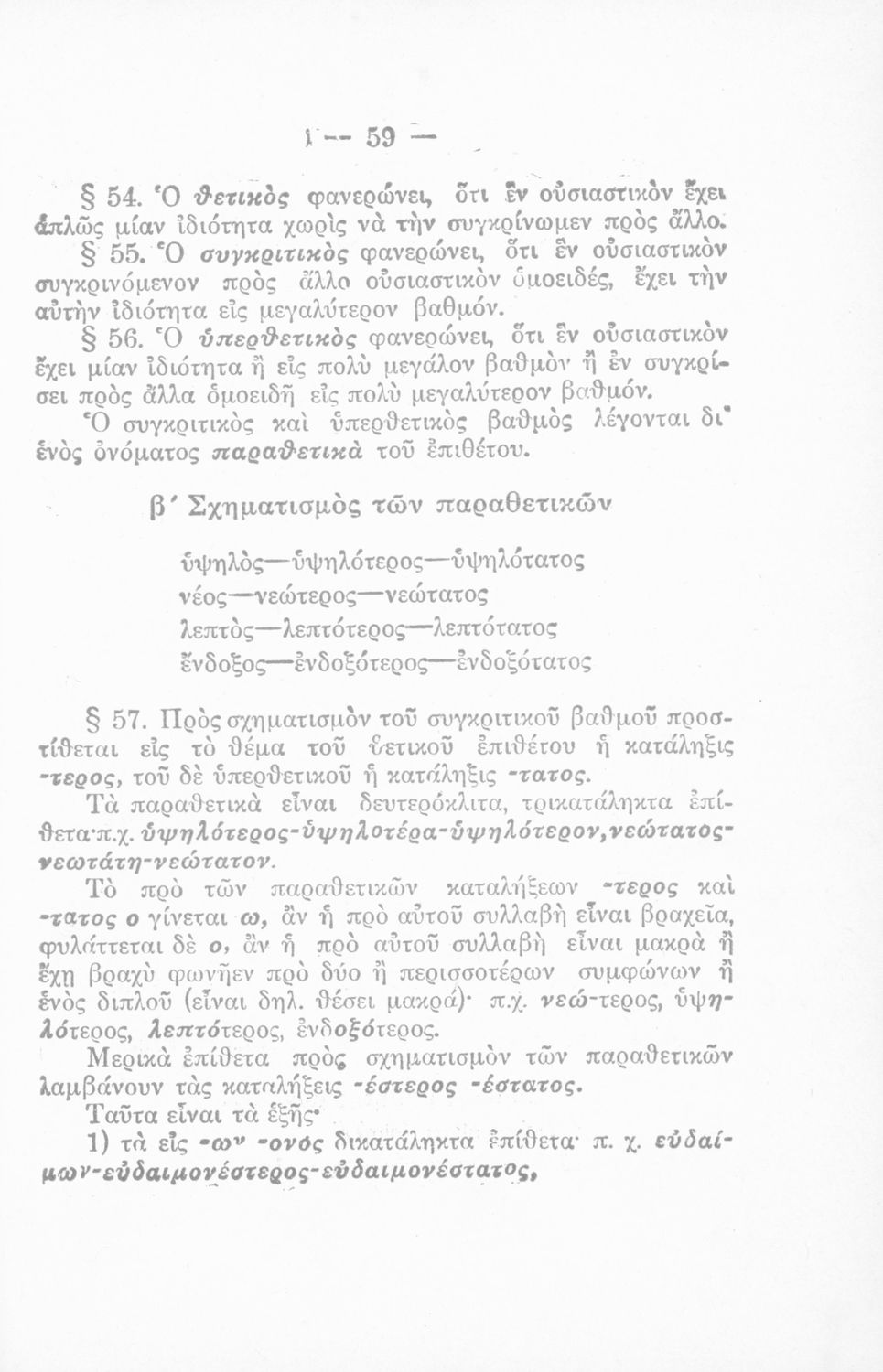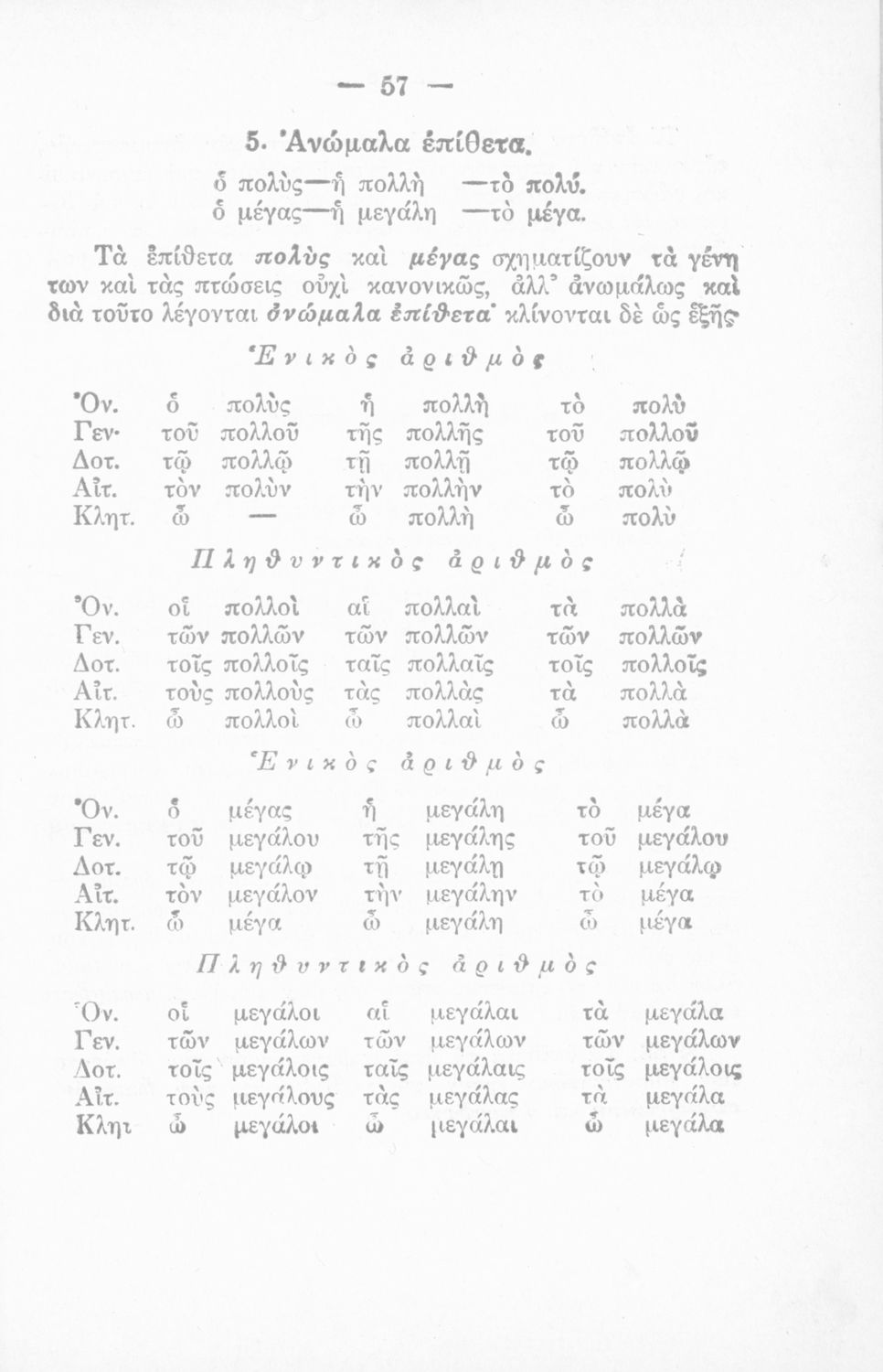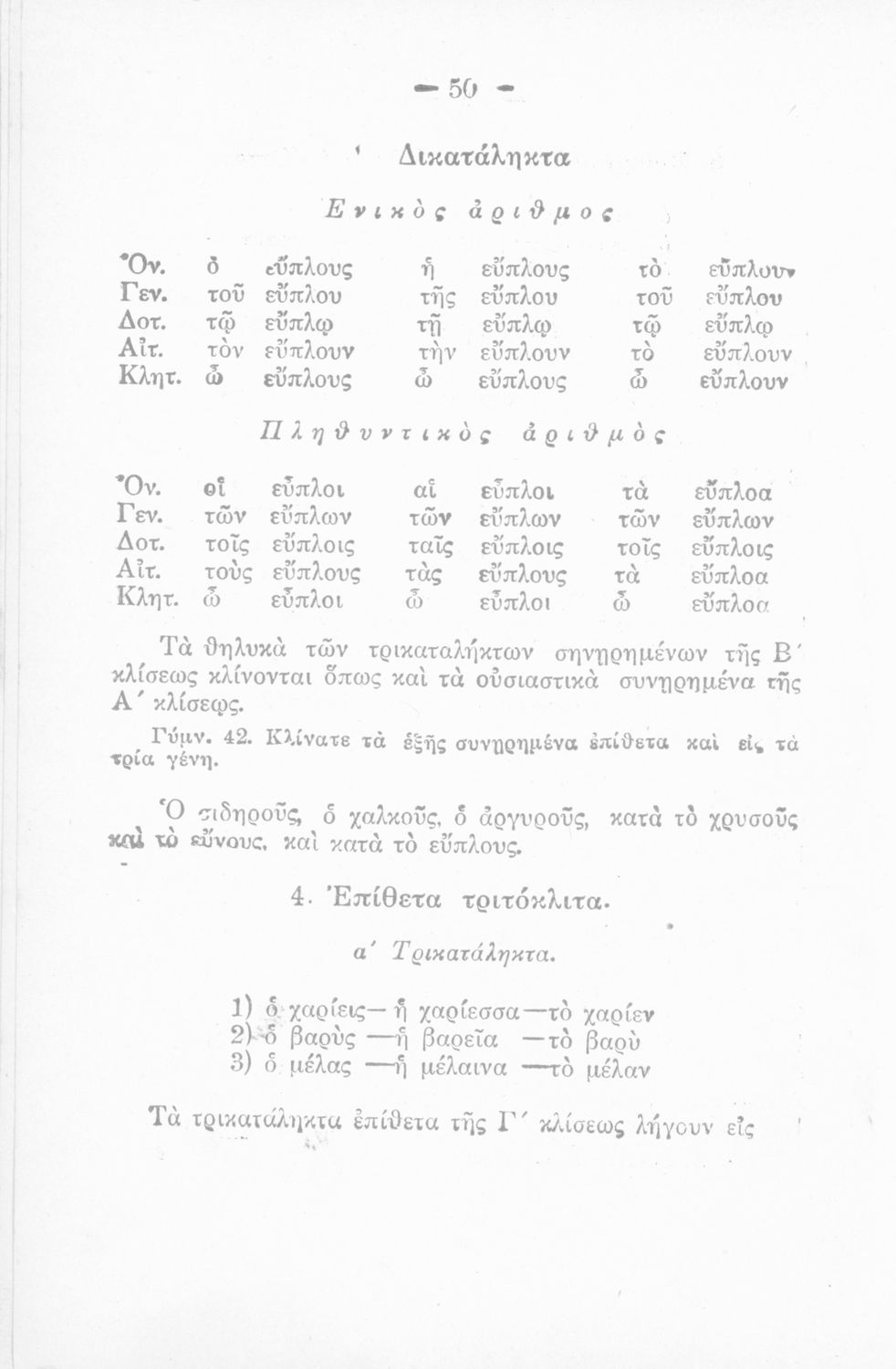 Σχολικό εγχειρίδιο γραμματικής για τους μαθητές της Ε΄ και ΣΤ΄ τάξης του Δημοτικού. Περιέχει τη διδασκαλία της γραμματικής της καθαρεύουσας με κανόνες και παραδείγματα.