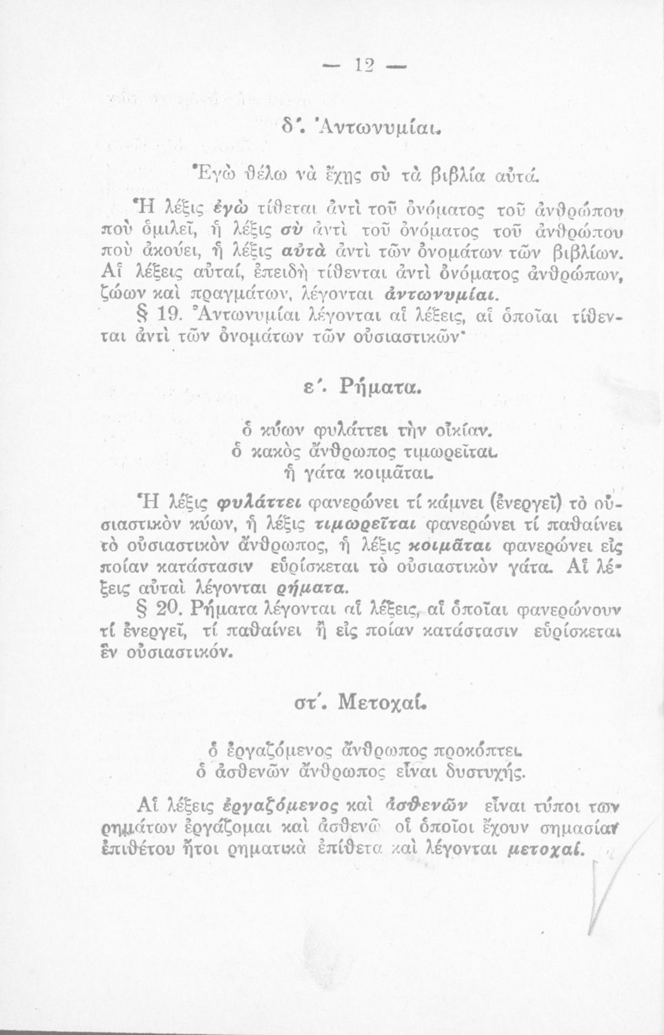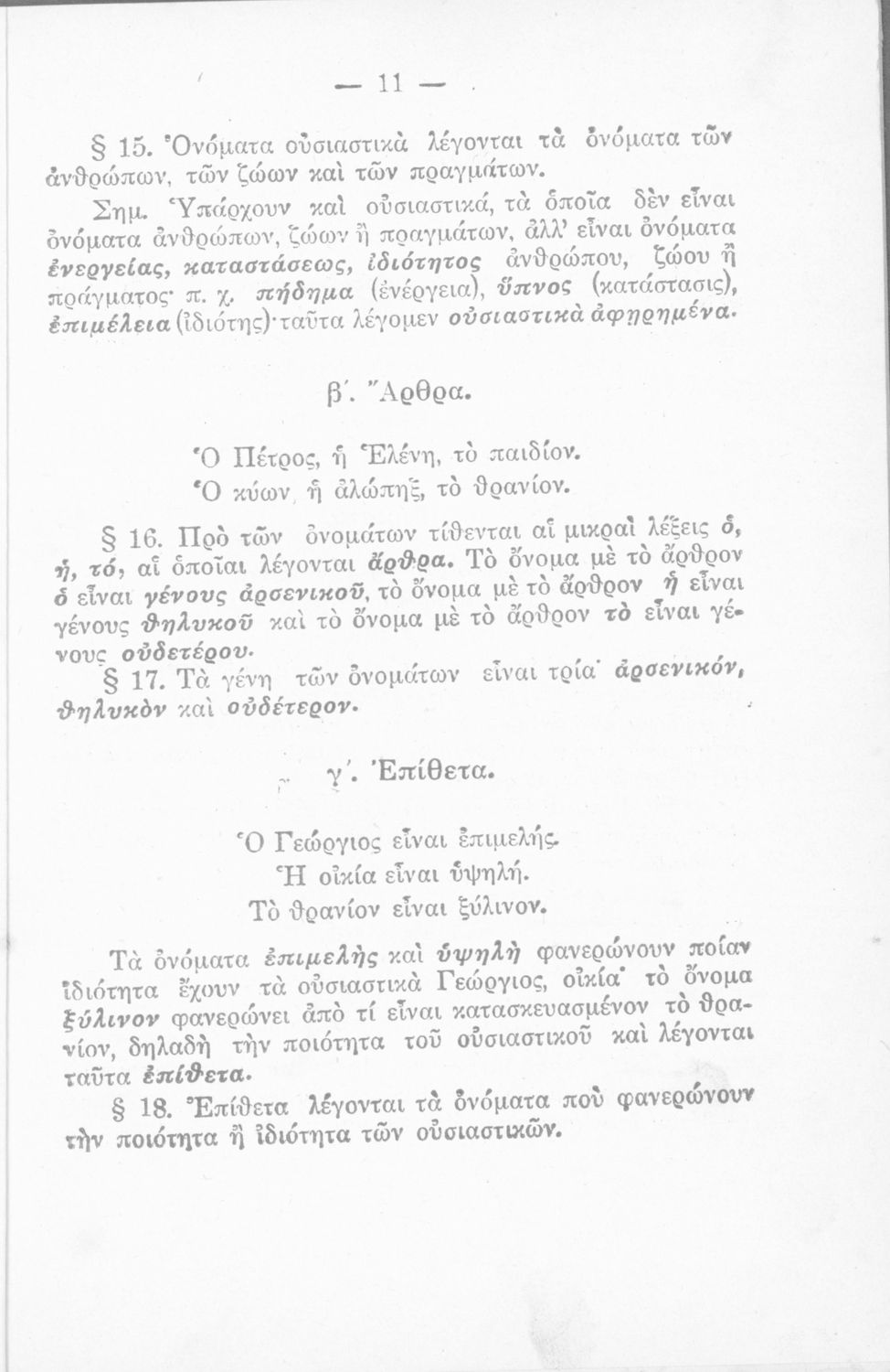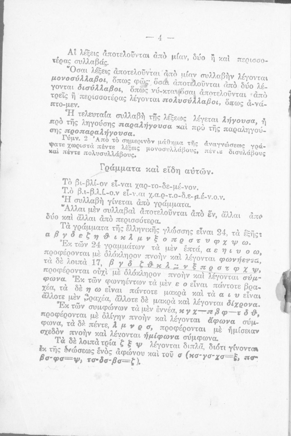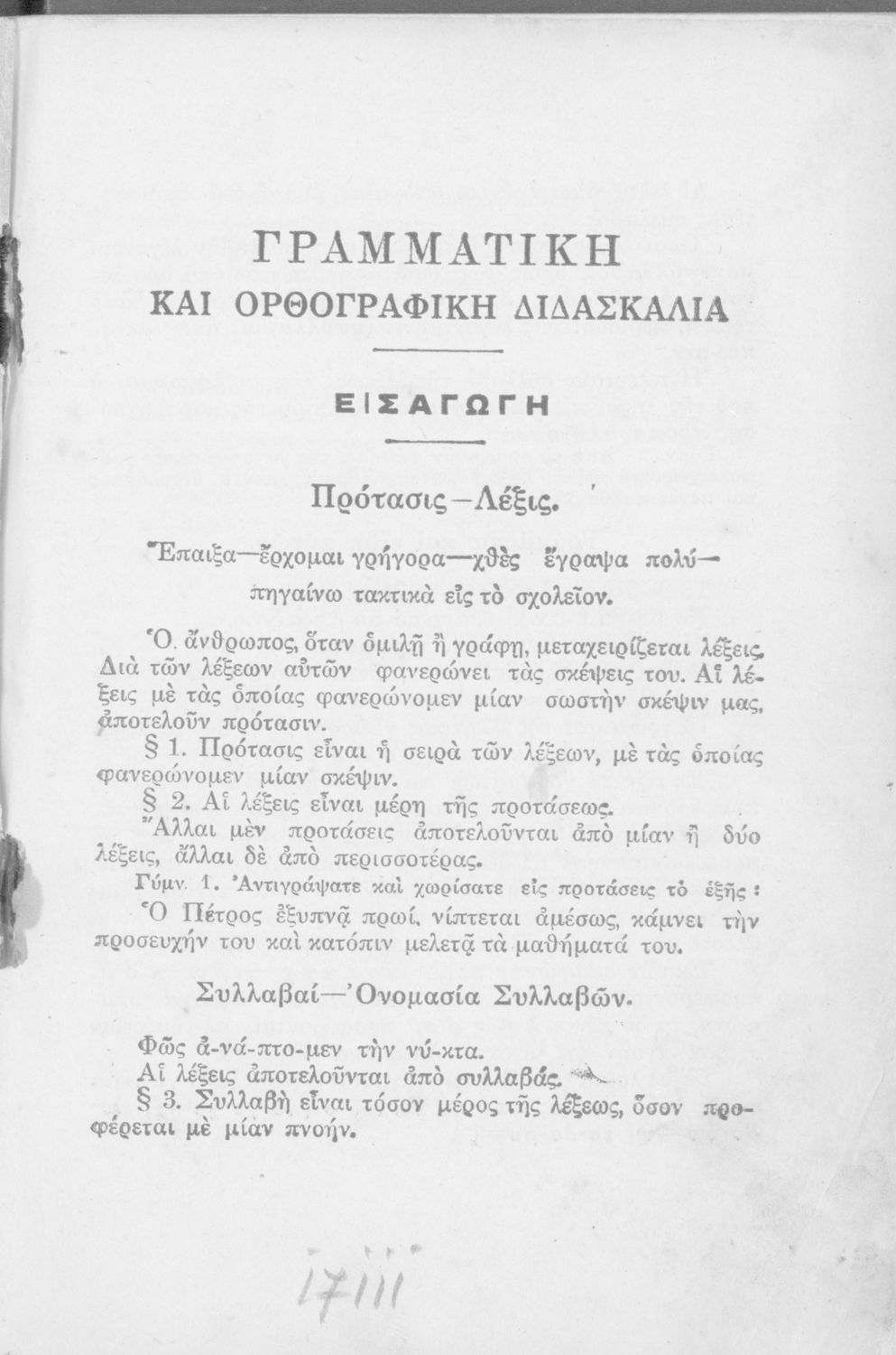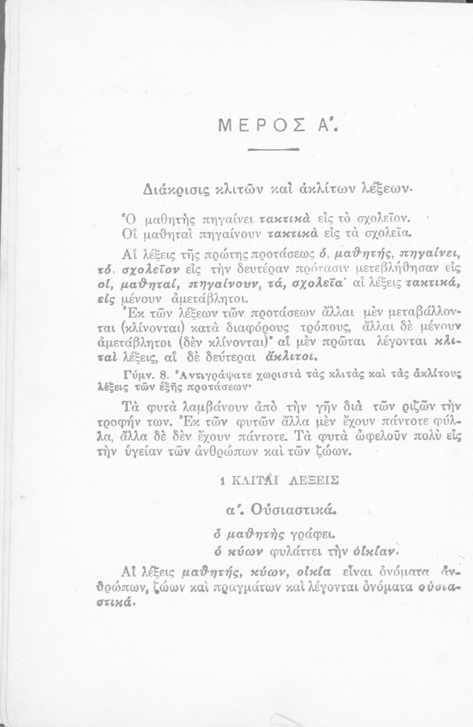 Σχολικό εγχειρίδιο Γραμματικής για τους μαθητές του Δημοτικού. Περιέχει την διδασκαλία της Γραμματικής της Καθαρεύουσας για τα Δημοτικά σχολεία.