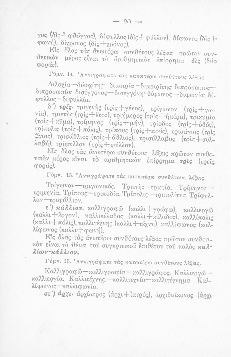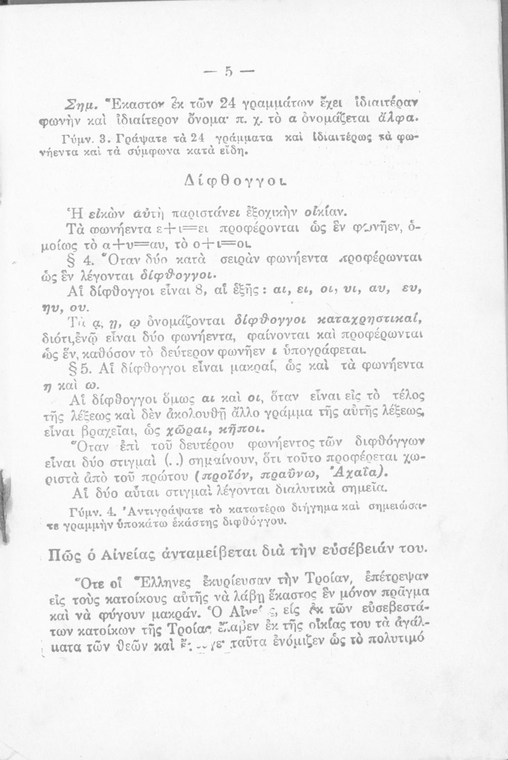 Σχολικό εγχειρίδιο γραμματικής για τους μαθητές της Ε΄ και ΣΤ΄ τάξης του Δημοτικού. Περιέχει τη διδασκαλία της γραμματικής της καθαρεύουσας με κανόνες και παραδείγματα.