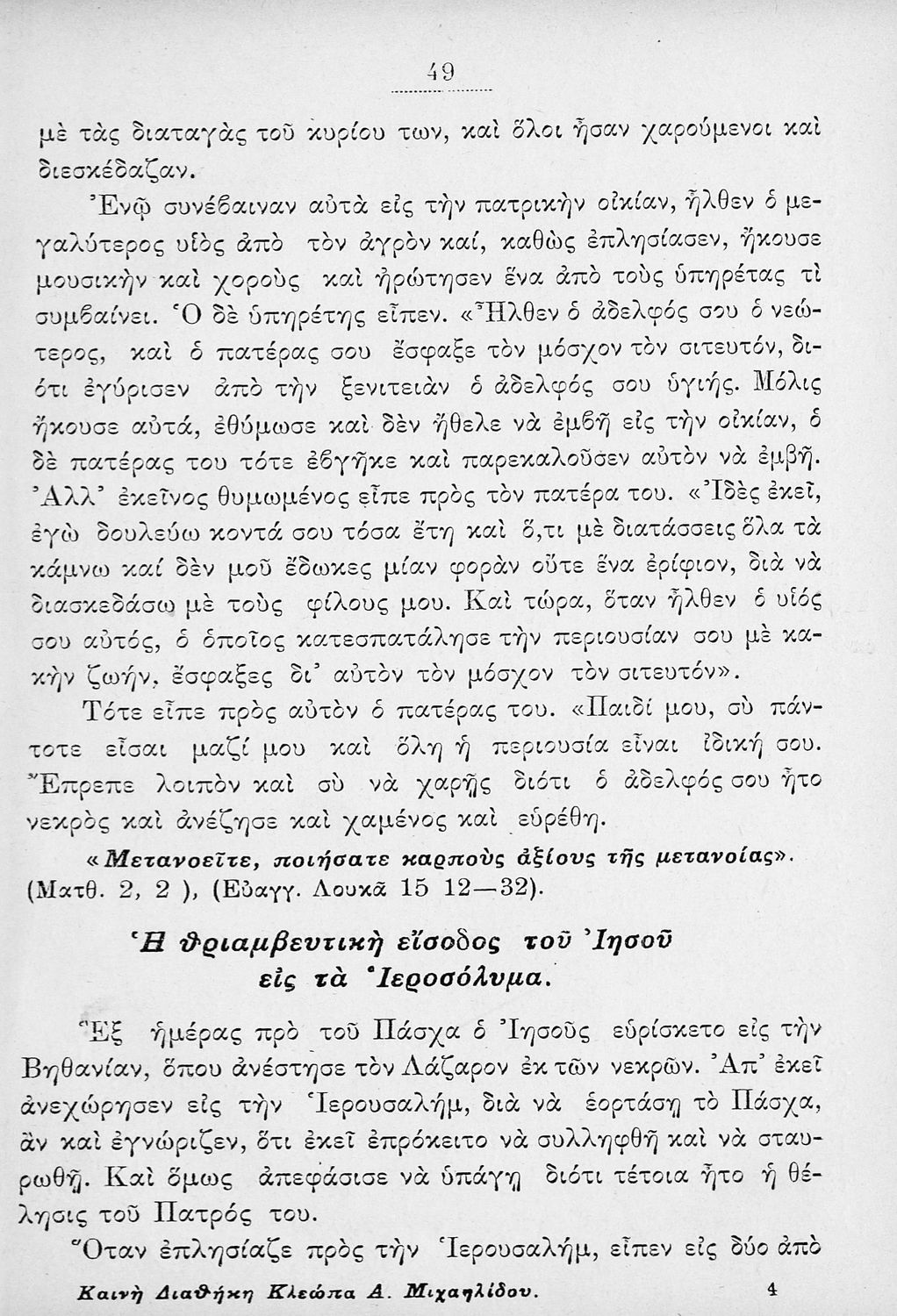 LDR 01346 2200181 4500 035 ## _a01-17118 040 ## _aΙνστιτούτο Εκπαιδευτικής Πολιτικής 041 ## _ael 100 ## _aΚλέωπας Α. Μιχαηλίδης 110 ## _a17118 245 0# _aΙερά Ιστορία της Καινής Διαθήκης συνταχθείσα συμφώνως με το τελευταίο αναλυτικόν πρόγραμμα της 13ης Σεπτεμβρίου 1913 του Υπουργείου Παιδείας προς χρήσιν των Δημοτικών Σχολείων αμφοτέρων των φύλων 260 ## _aΑθήνα _bΜιχαήλ Σ. Ζηκάκης _c1927 300 ## _a90 _bΕικόνες (ασπρόμαυρες) _c20 520 ## _aΜαθητικό βοήθημα Θρησκευτικών Δημοτικού που περιλαμβάνει την ιστορία της Καινής Διαθήκης από τον Ευαγγελισμό της Θεοτόκου μέχρι την ανάληψη του Ιησού Χριστού. Περιέχει και σύντομη γεωγραφία της Παλαιστίνης. 522 ## _aΕλλάδα 546 ## _aΚαθαρεύουσα 563 ## _aΣκληρό Εξώφυλλο 650 #4 _aΘαύματα _aΠαραβολές _aΧριστιανική διδασκαλία
