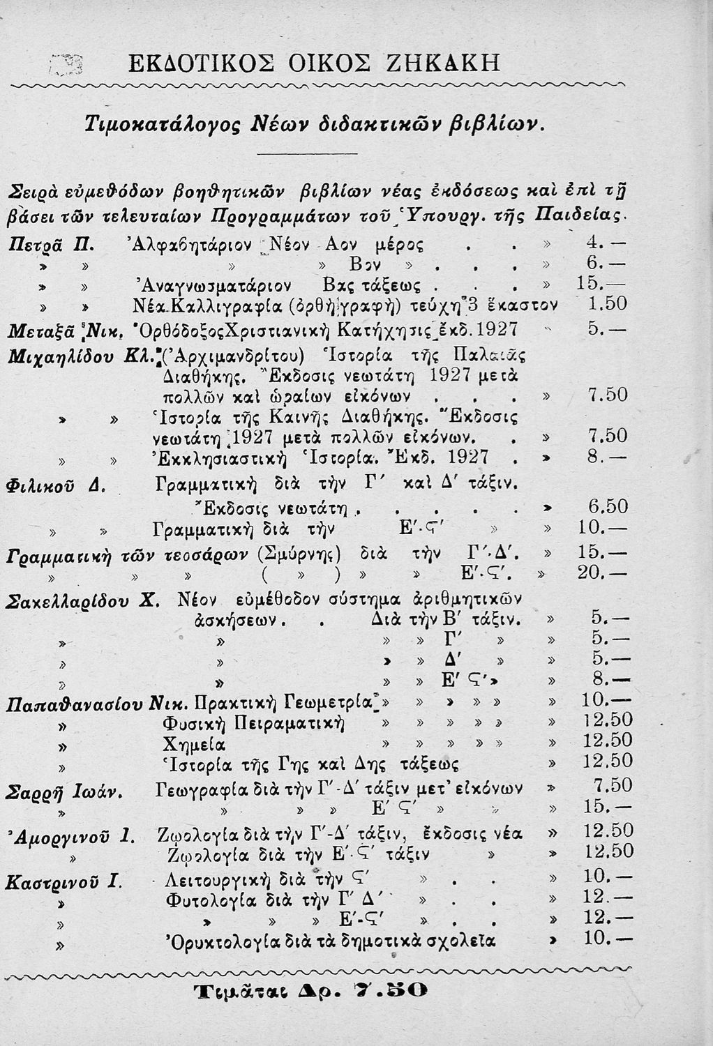 Εκδότης: Μιχαήλ Σ. Ζηκάκης Έτος έκδοσης: 1927 Τόπος έκδοσης: Αθήνα |