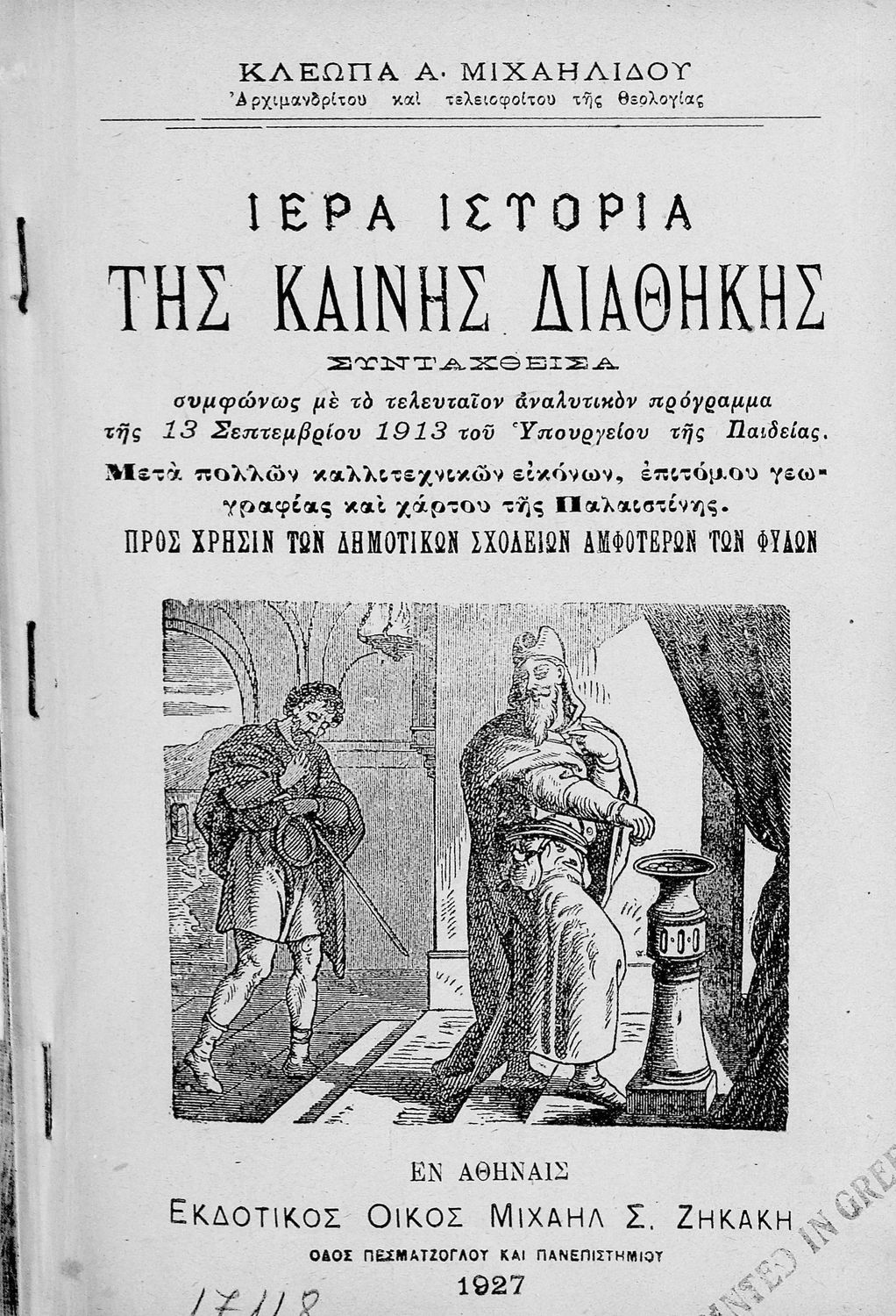 Τίτλος: Ιερά Ιστορία της Καινής Διαθήκης συνταχθείσα συμφώνως με το τελευταίο αναλυτικόν πρόγραμμα της 13ης Σεπτεμβρίου 1913 του Υπουργείου Παιδείας προς χρήσιν των Δημοτικών Σχολείων αμφοτέρων των φύλων