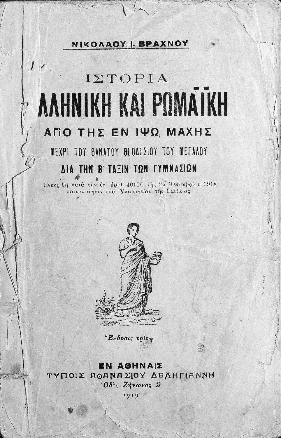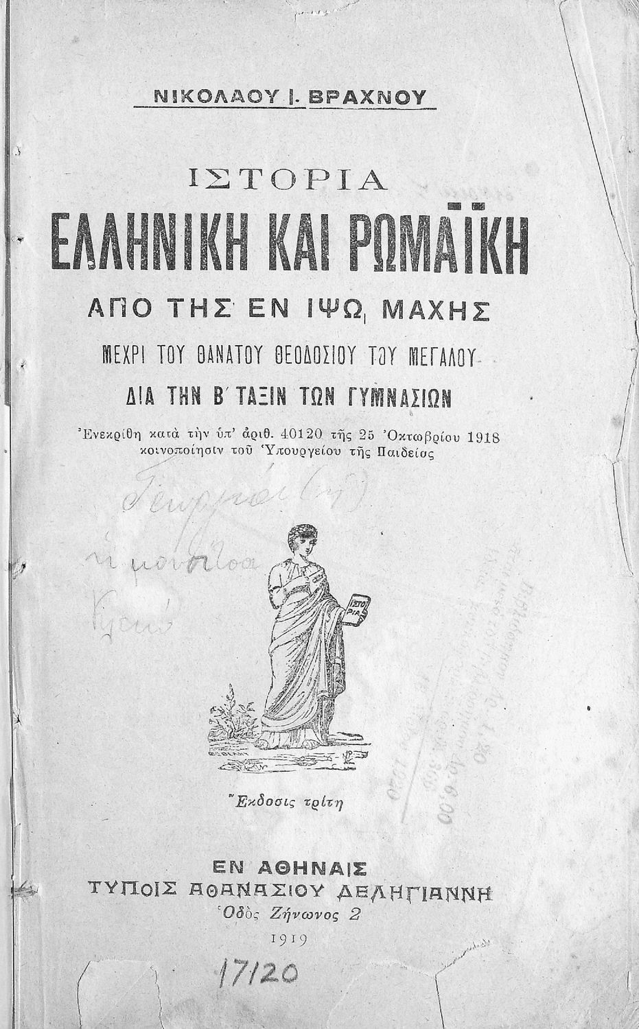 Τίτλος: Ιστορία Ελληνική και Ρωμαϊκή. Από της εν Ιψώ μάχης μέχρι του θανάτου Θεοδόσιου του Μεγάλου δια την Β΄ Τάξιν των Γυμνασίων