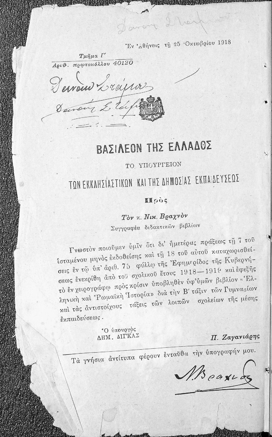 Υπουργική απόφαση / Σύμβαση: 40120/25-10-1918