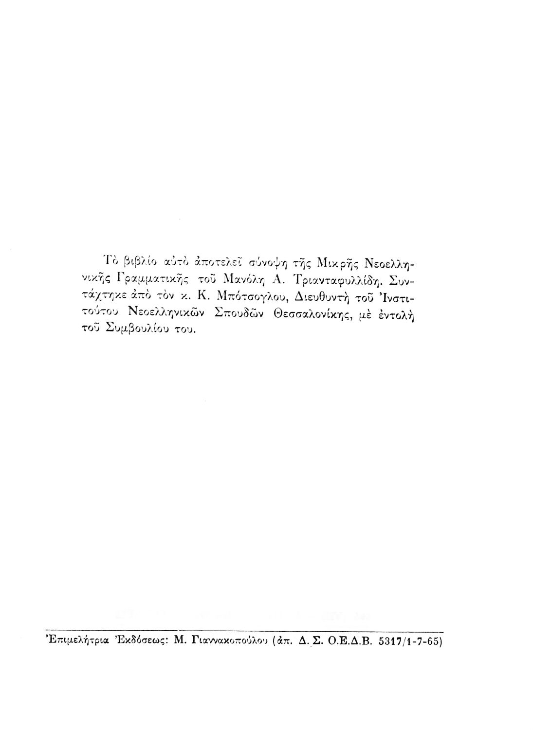 Κωδικός αναγνώρισης: 01-17126 Τίτλος: Μικρή Νεοελληνική Γραμματική . Δημοτικού Σχολείου Συγγραφέας: Μαν. Α. Τριανταφυλλίδης Μέγεθος και υπόστρωμα: Σχολικό εγχειρίδιο, σκληρό εξώφυλλο, 158 σελίδες. |