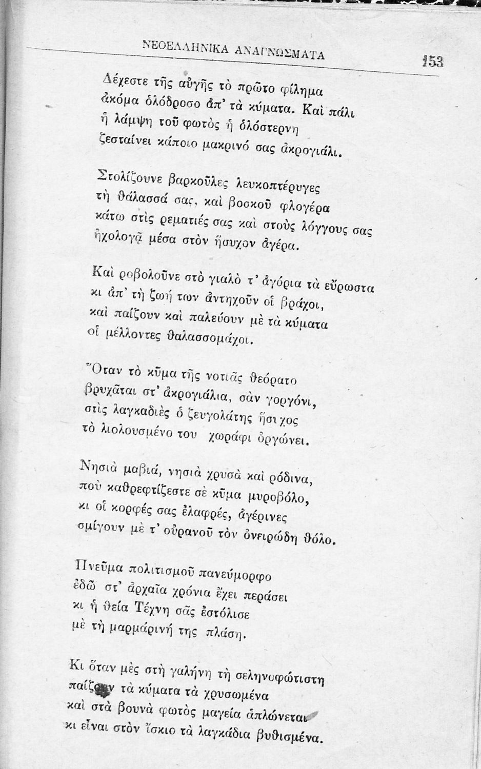 Σχολικό εγχειρίδιο για την Β΄ Γυμνασίου και την Γ΄ Αστικού Θηλέων για το μάθημα των Νέων Ελληνικών. Το εγχειρίδιο αποτελείται από κείμενα πεζού λόγου, επικολυρικά ποιήματα, ωδές, ηθογραφικά διηγήματα, ρητορικά