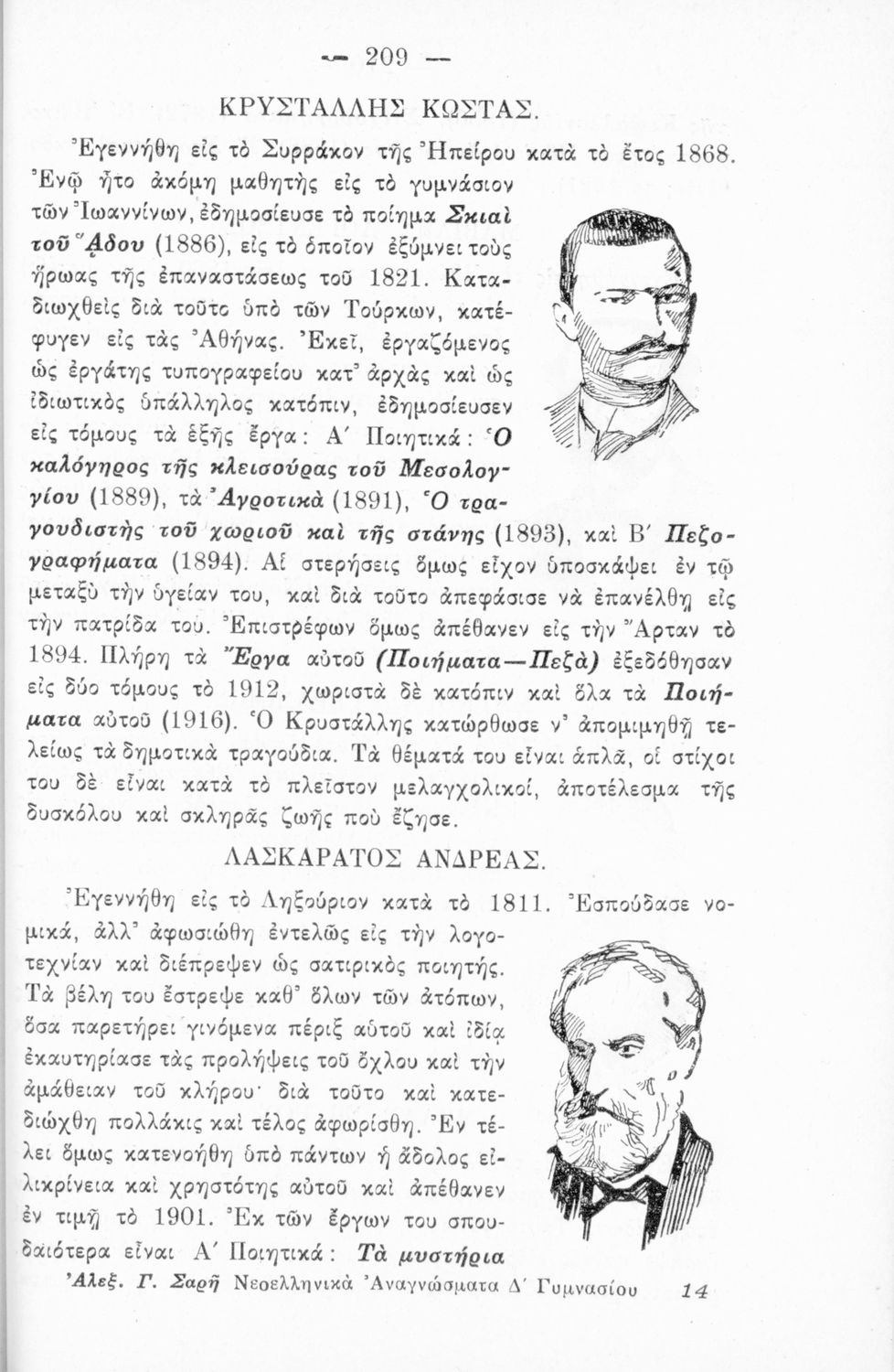 Βαθμίδα εκπαίδευσης: Δευτεροβάθμια Τάξη: Δ' Γυμνασίου Μάθημα: Νέα Ελληνικά Γλώσσα: Καθαρεύουσα Παρουσίαση περιεχομένου: Σχολικό εγχειρίδιο Νέων Ελληνικών Δ΄ Γυμνασίου που περιλαμβάνει ποιήματα και πεζά Ελλήνων συγγραφέων και δημοτικά τραγούδια εμπνευσμένα από την σύγχρονη ελληνική ιστορία, την ελληνική φύση και τη ζωή στην ύπαιθρο, την οικογενειακή και κοινωνική ζωή και τη θρησκευτική παράδοση. Περιέχει και παράρτημα με βιογραφίες των συγγραφέων και λεξιλόγιο. |