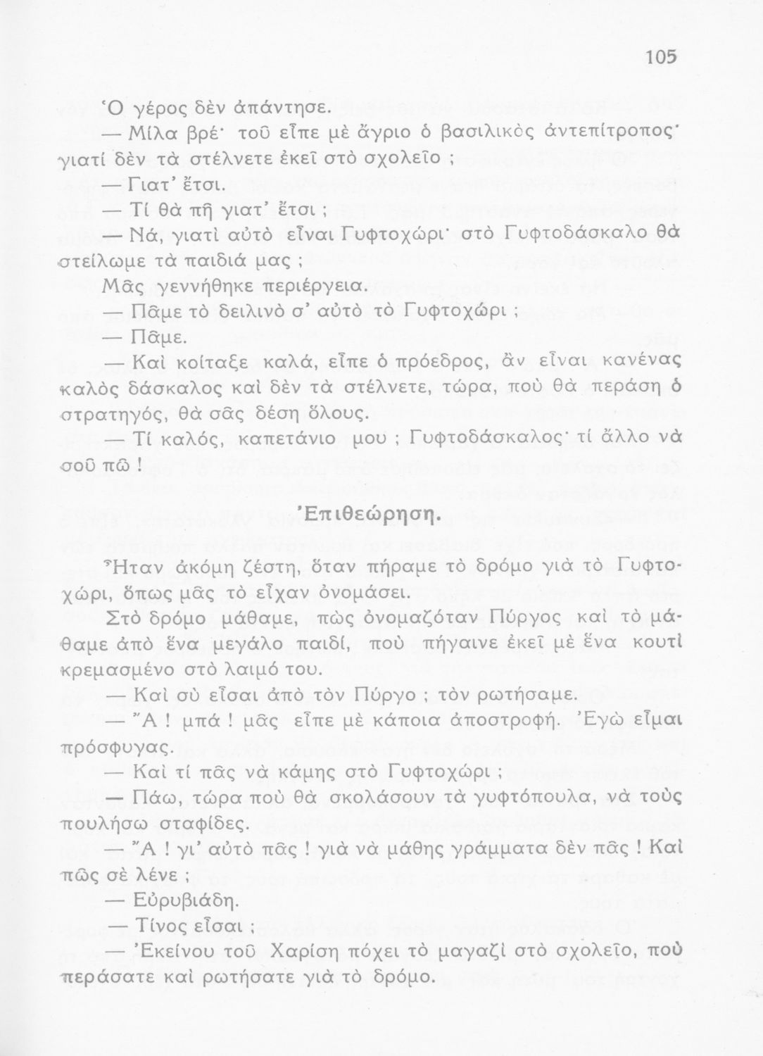 Σχολικό εγχειρίδιο για την Β΄ Γυμνασίου και την Γ΄ Αστικού Θηλέων για το μάθημα των Νέων Ελληνικών. Το εγχειρίδιο αποτελείται από κείμενα πεζού λόγου, επικολυρικά ποιήματα, ωδές, ηθογραφικά διηγήματα, ρητορικά