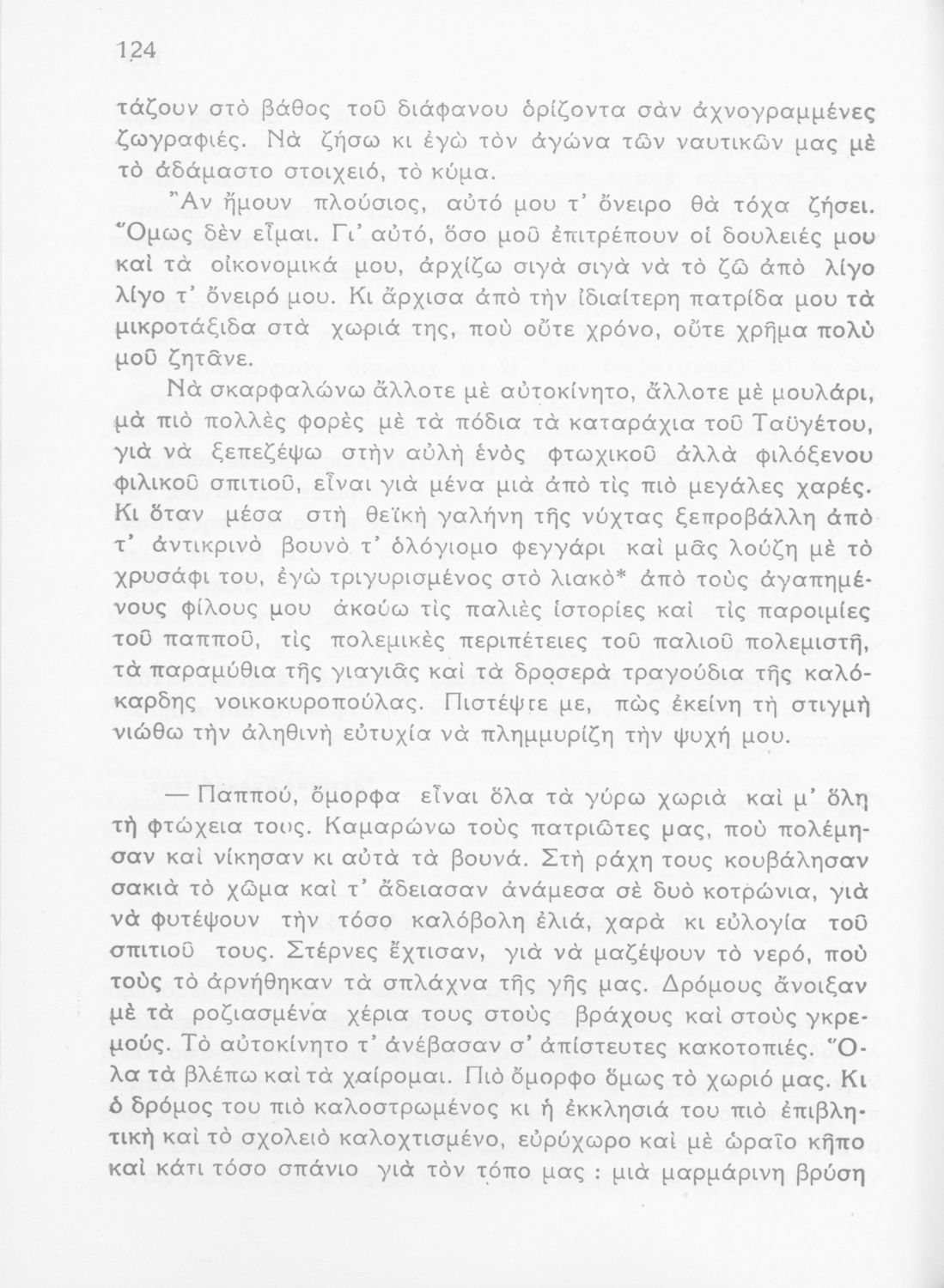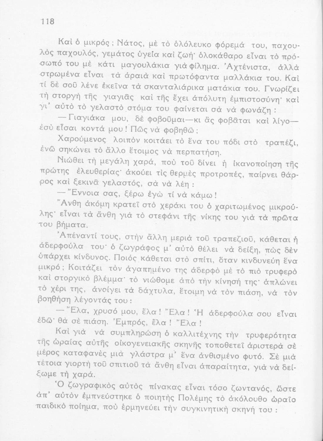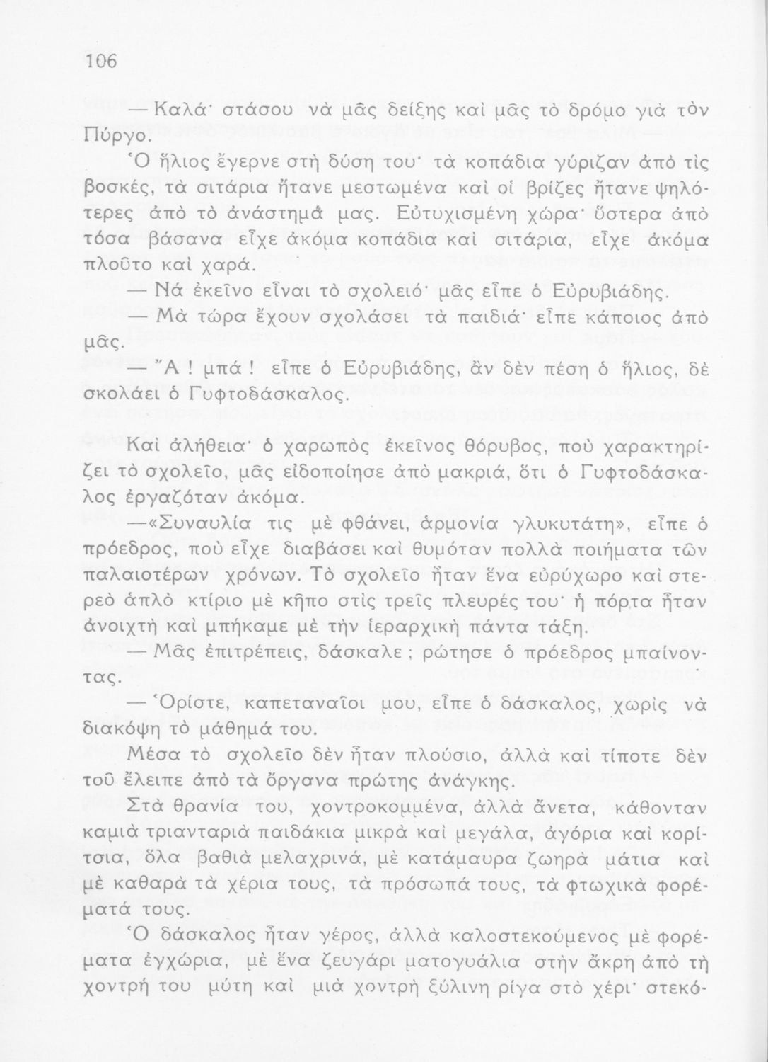 Σχολικό εγχειρίδιο Νέων Ελληνικών Δ΄ Γυμνασίου και Β΄ Αστικού Σχολείου που περιέχει πεζά και ποιήματα Ελλήνων συγγραφέων εμπνευσμένα από τη θρησκευτική και κοινωνική ζωή, την ελληνική μυθολογία, την αρχαία και σύγχρονη ελληνική ιστορία, και την ελληνική φύση. Περιέχει παράρτημα με μεταφράσεις κειμένων αρχαίων ελλήνων συγγραφέων και αποσπάσματα από τη μεσαιωνική γραμματεία, βιογραφίες των συγγραφέων και λεξιλόγιο.