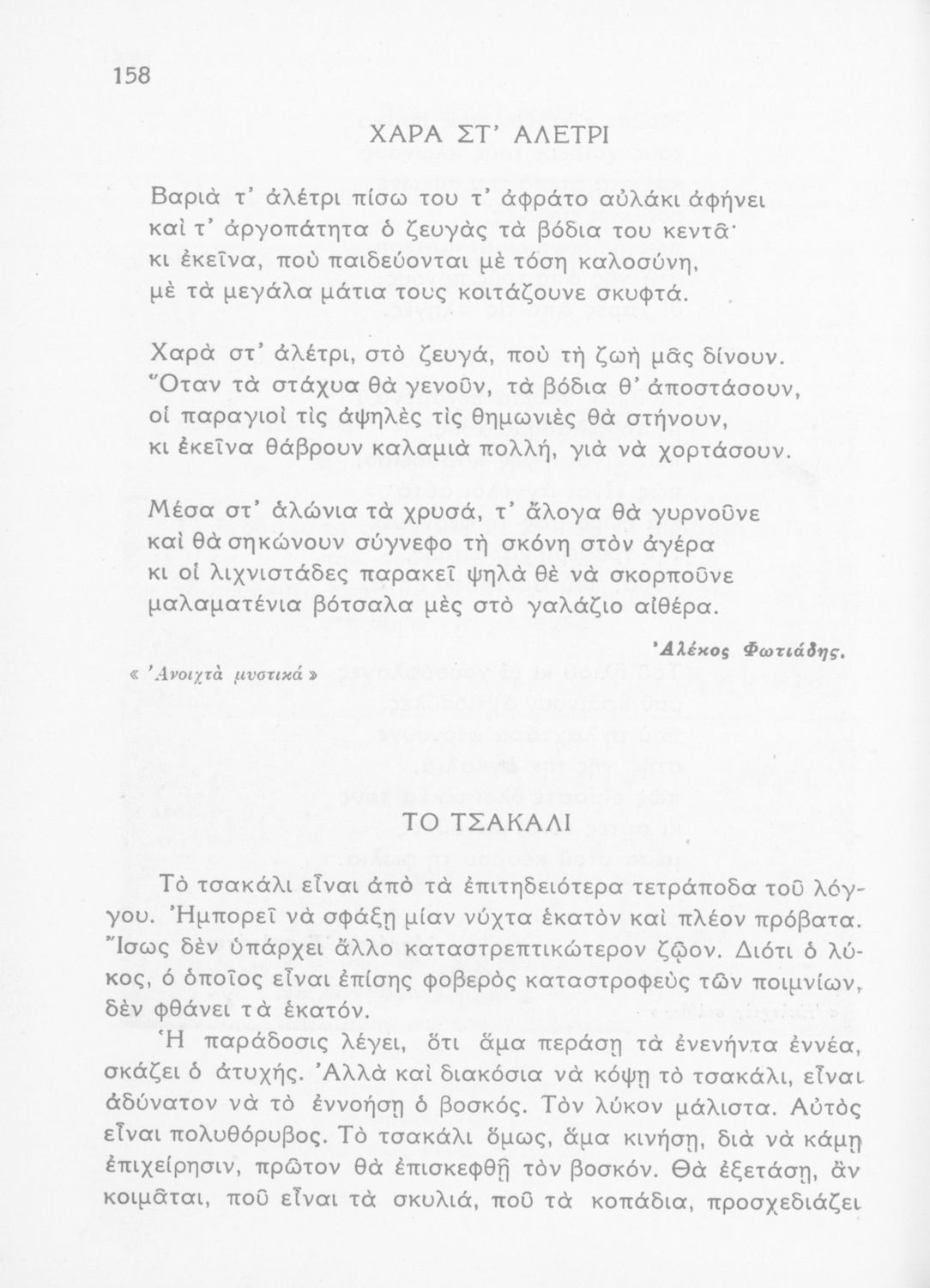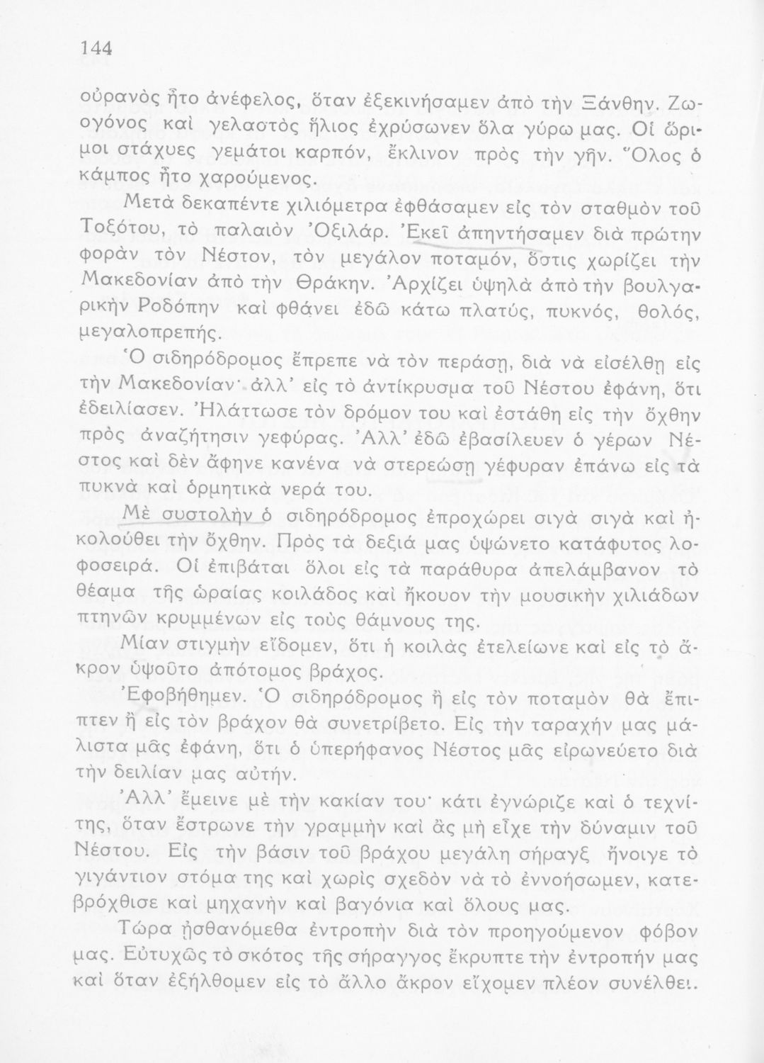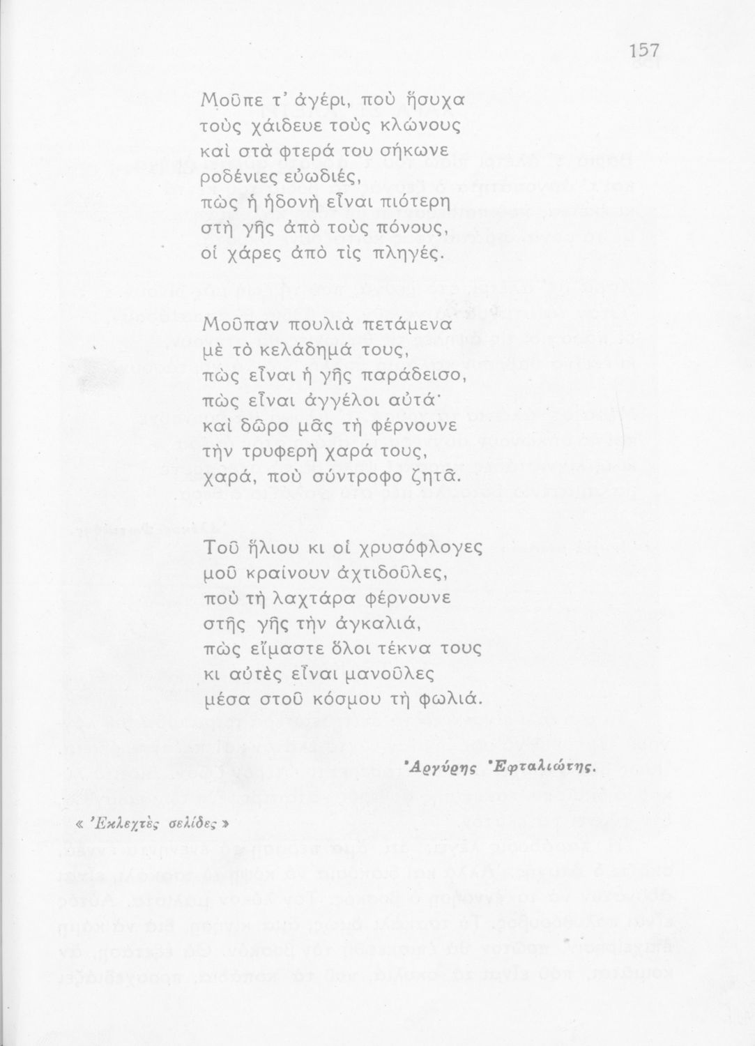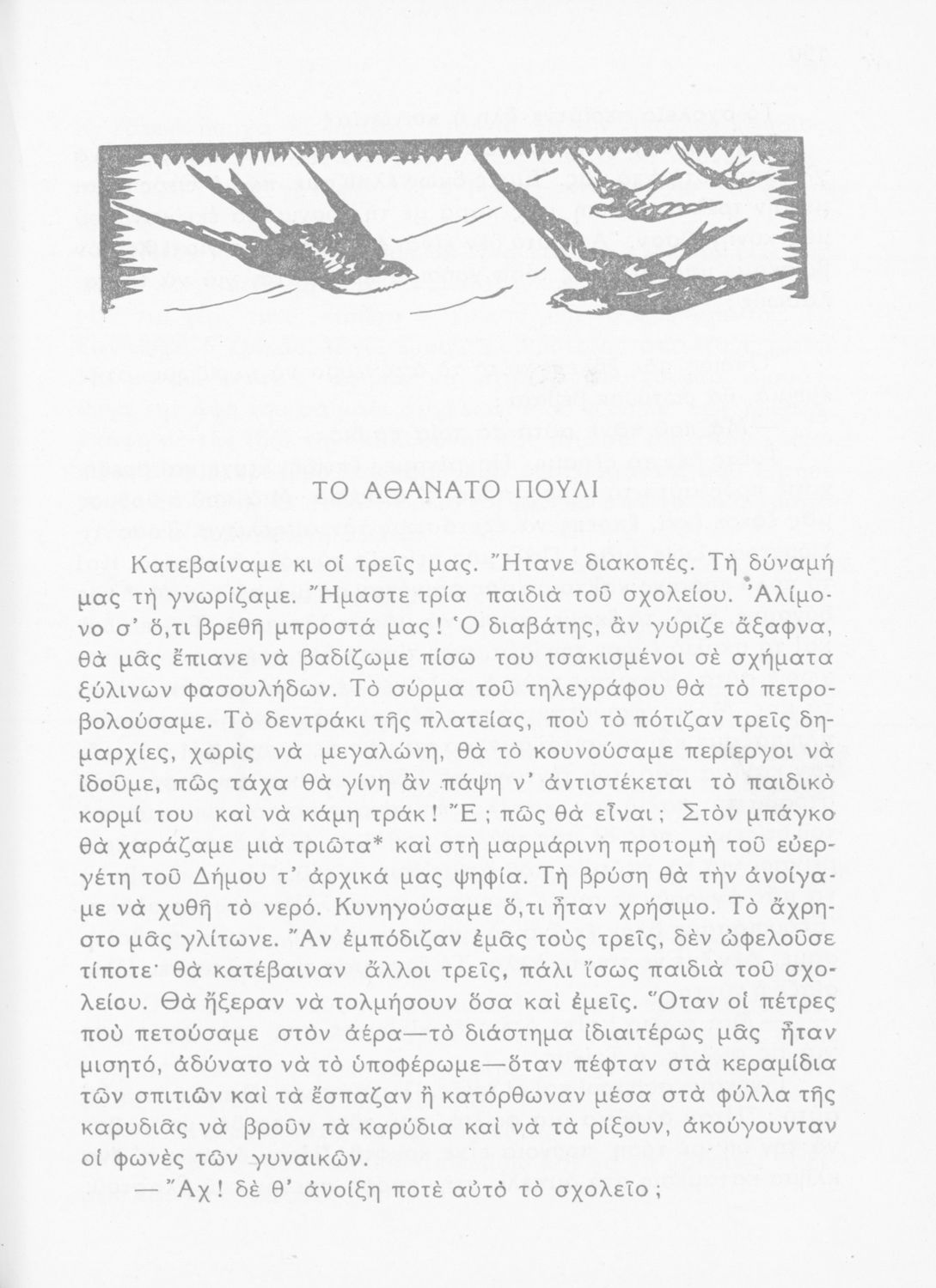 Σχολικό εγχειρίδιο Νέων Ελληνικών Δ΄ Γυμνασίου και Β΄ Αστικού Σχολείου που περιέχει πεζά και ποιήματα Ελλήνων συγγραφέων εμπνευσμένα από τη θρησκευτική και κοινωνική ζωή, την ελληνική μυθολογία, την αρχαία και σύγχρονη ελληνική ιστορία, και την ελληνική φύση. Περιέχει παράρτημα με μεταφράσεις κειμένων αρχαίων ελλήνων συγγραφέων και αποσπάσματα από τη μεσαιωνική γραμματεία, βιογραφίες των συγγραφέων και λεξιλόγιο.