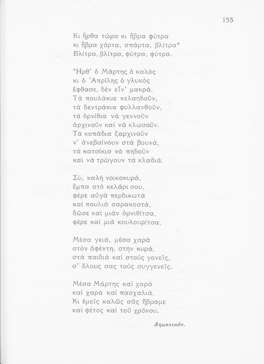 Σχολικό εγχειρίδιο για την Β΄ Γυμνασίου και την Γ΄ Αστικού Θηλέων για το μάθημα των Νέων Ελληνικών. Το εγχειρίδιο αποτελείται από κείμενα πεζού λόγου, επικολυρικά ποιήματα, ωδές, ηθογραφικά διηγήματα, ρητορικά