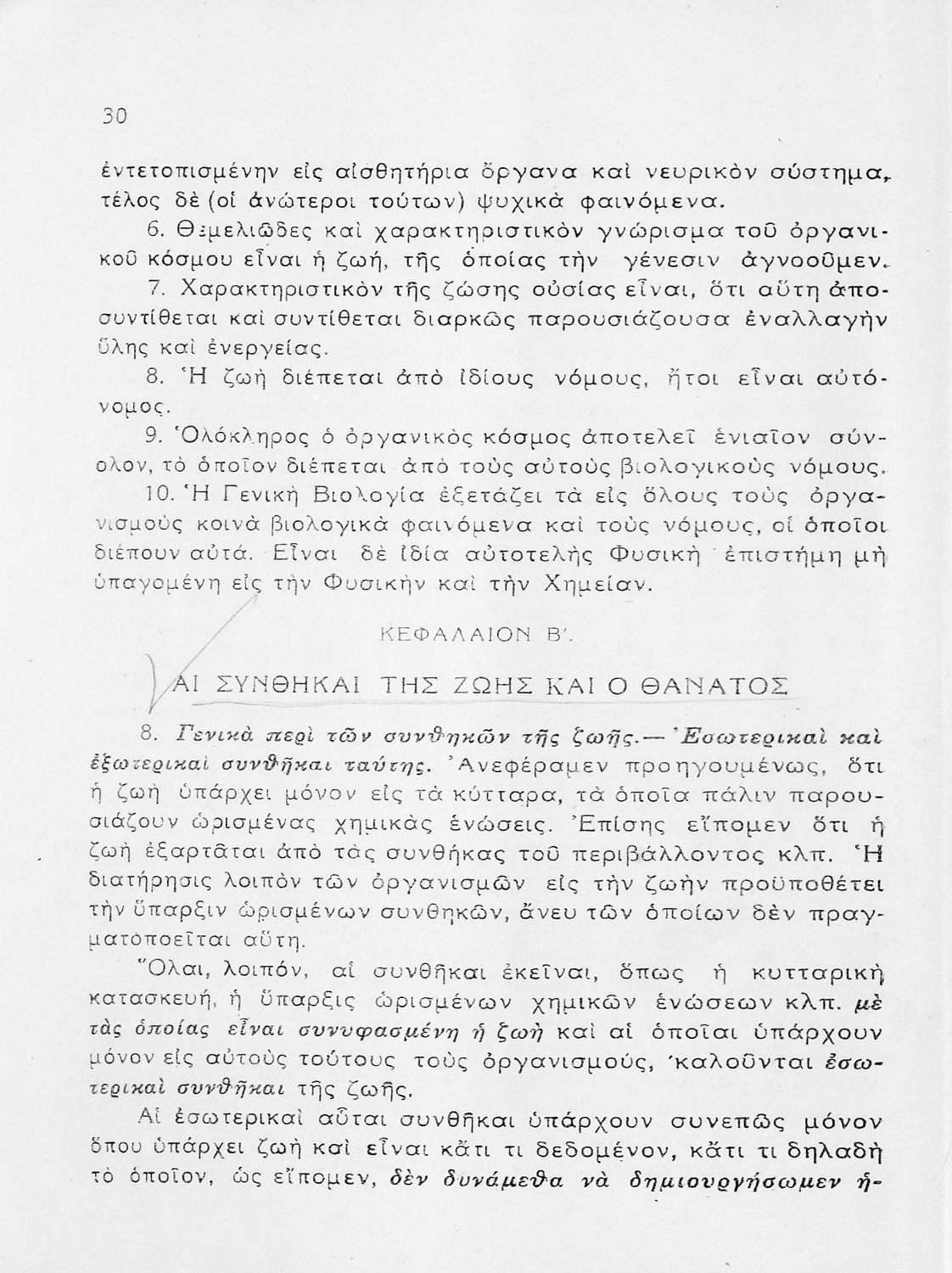 Βαθμίδα εκπαίδευσης: Δευτεροβάθμια Τάξη: Δ' Γυμνασίου παλαιού τύπου / ΣΤ΄ Γυμνασίου νέου τύπου Μάθημα: Βιολογία Γλώσσα: Απλή καθαρεύουσα Παρουσίαση περιεχομένου: Σχολικό εγχειρίδιο Βιολογίας Δ΄ Γυμνασίου που εστιάζει στις συνθήκες γέννησης, μεταβολής και θανάτου των έμβιων οργανισμών. Ο συγγραφέας ήταν καθηγητής της γενικής Βιολογίας στο Πανεπιστήμιο Αθηνών. |