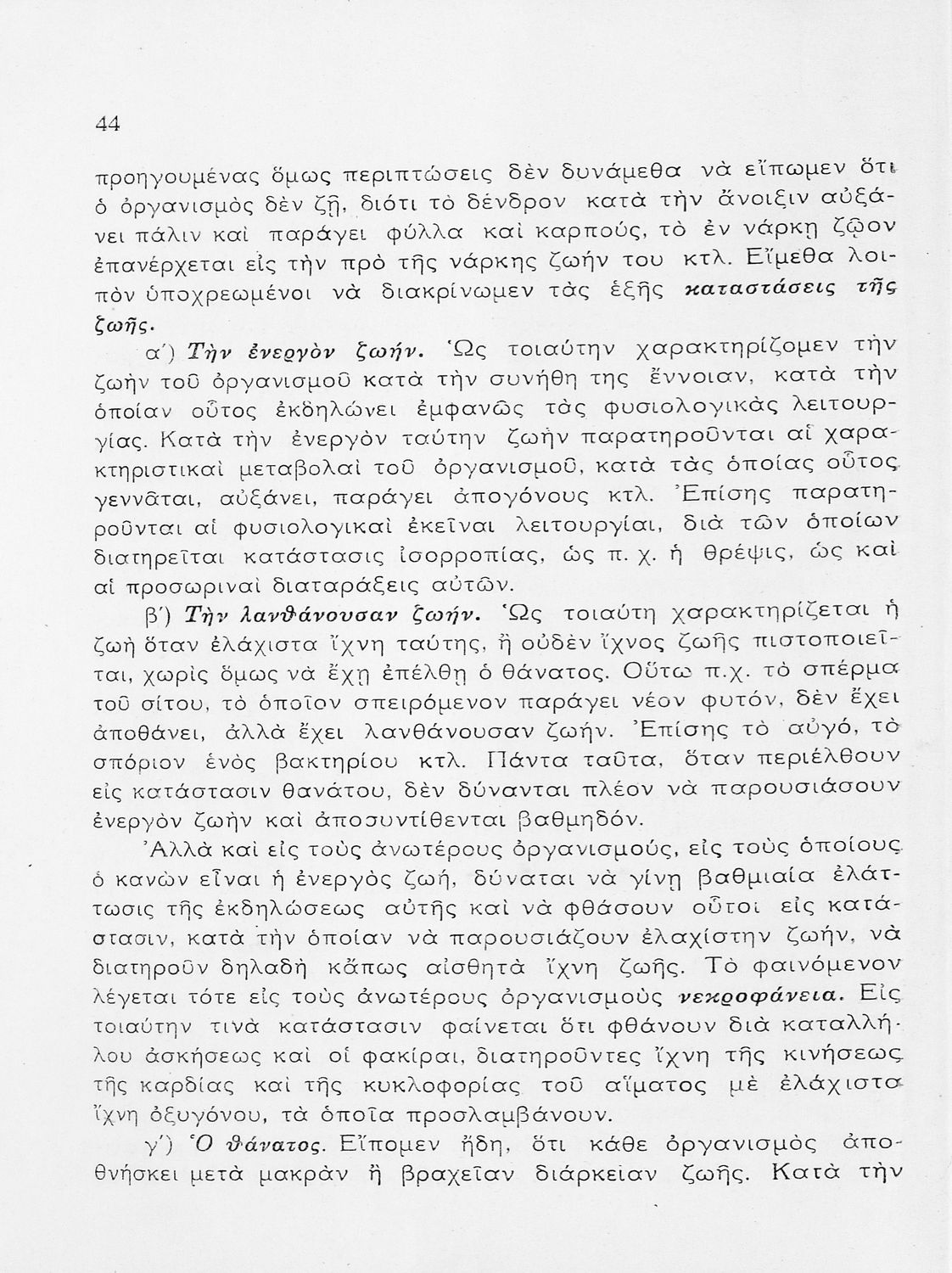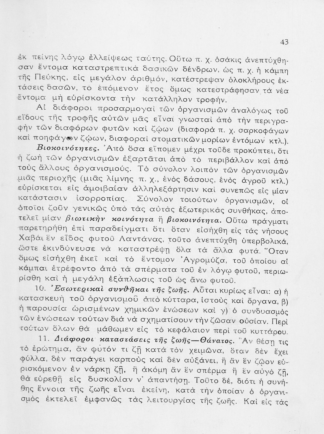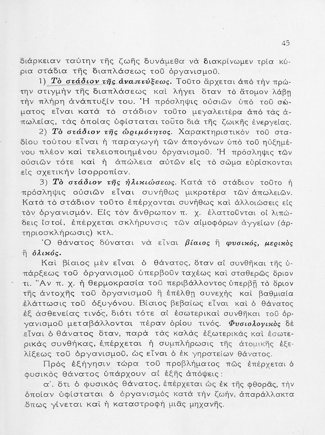 Βαθμίδα εκπαίδευσης: Δευτεροβάθμια Τάξη: Δ' Γυμνασίου παλαιού τύπου / ΣΤ΄ Γυμνασίου νέου τύπου Μάθημα: Βιολογία Γλώσσα: Απλή καθαρεύουσα Παρουσίαση περιεχομένου: Σχολικό εγχειρίδιο Βιολογίας Δ΄ Γυμνασίου που εστιάζει στις συνθήκες γέννησης, μεταβολής και θανάτου των έμβιων οργανισμών. Ο συγγραφέας ήταν καθηγητής της γενικής Βιολογίας στο Πανεπιστήμιο Αθηνών. |