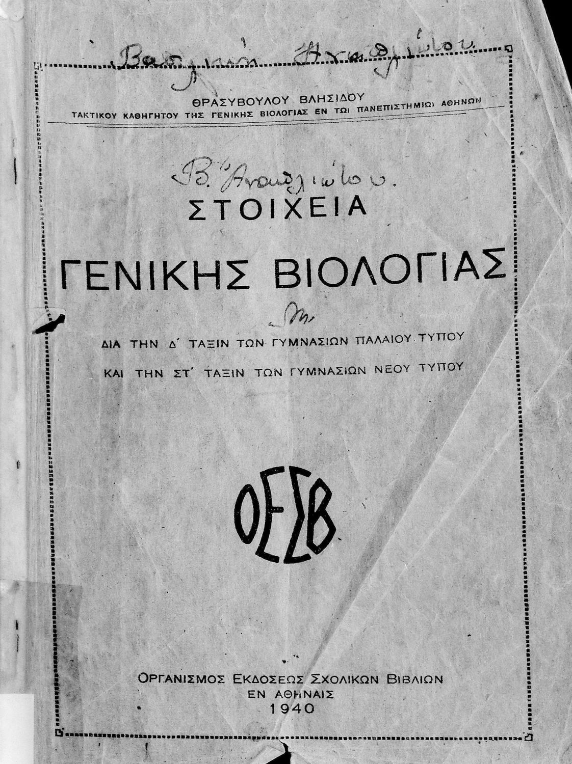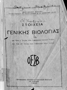 Κωδικός αναγνώρισης: 01-17146 Τίτλος: Στοιχεία Γενικής Βιολογίας δια την Δ΄ τάξιν Γυμνασίων παλαιού τύπου και την ΣΤ΄ τάξιν των Γυμνασίων νέου τύπου Συγγραφέας: Θρασύβουλος Βλησίδης Εικονογράφος: Αλ. Φαλτάϊτς Μέγεθος και υπόστρωμα: Σχολικό εγχειρίδιο, 20εκ., μαλακό εξώφυλλο, 95 σελίδες. Σχεδιαγράμματα (ασπρόμαυρα). |