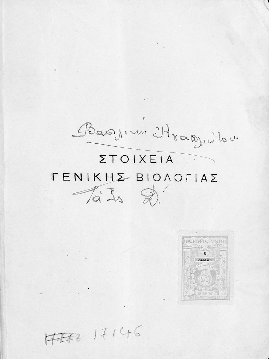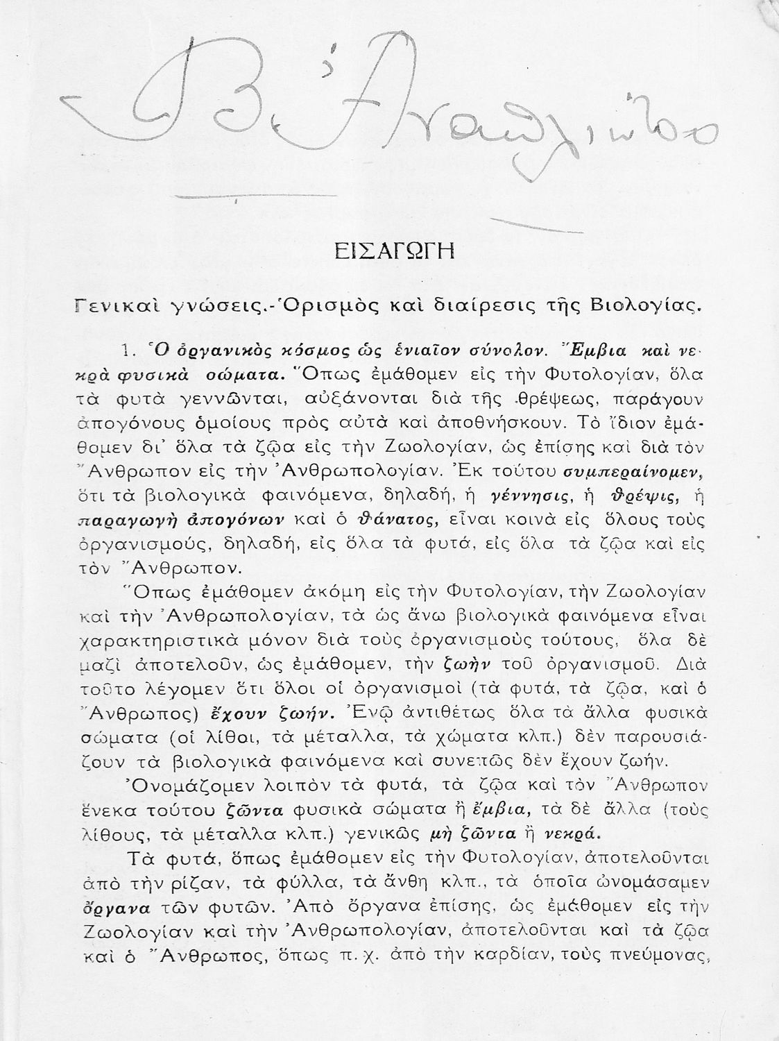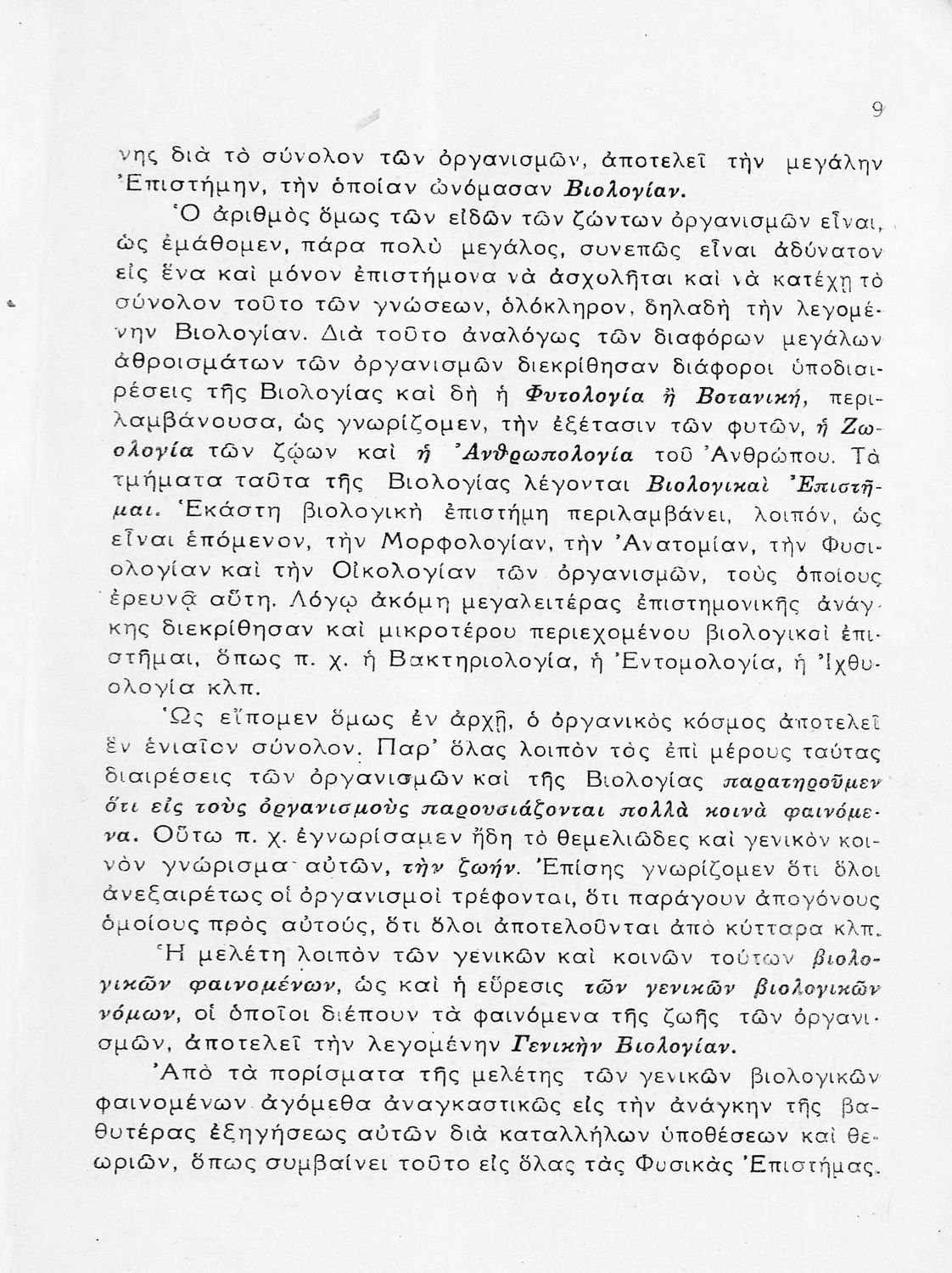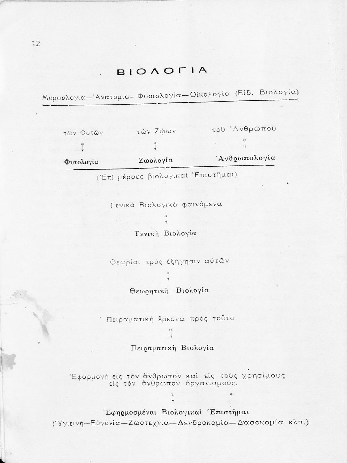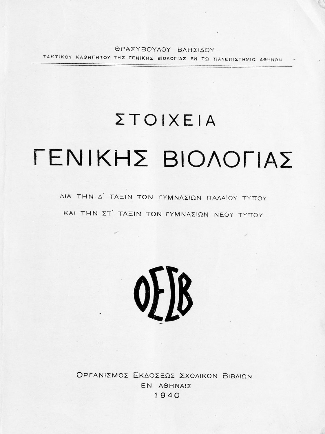 Βαθμίδα εκπαίδευσης: Δευτεροβάθμια Τάξη: Δ' Γυμνασίου παλαιού τύπου / ΣΤ΄ Γυμνασίου νέου τύπου Μάθημα: Βιολογία Γλώσσα: Απλή καθαρεύουσα Παρουσίαση περιεχομένου: Σχολικό εγχειρίδιο Βιολογίας Δ΄ Γυμνασίου που εστιάζει στις συνθήκες γέννησης, μεταβολής και θανάτου των έμβιων οργανισμών. Ο συγγραφέας ήταν καθηγητής της γενικής Βιολογίας στο Πανεπιστήμιο Αθηνών. |