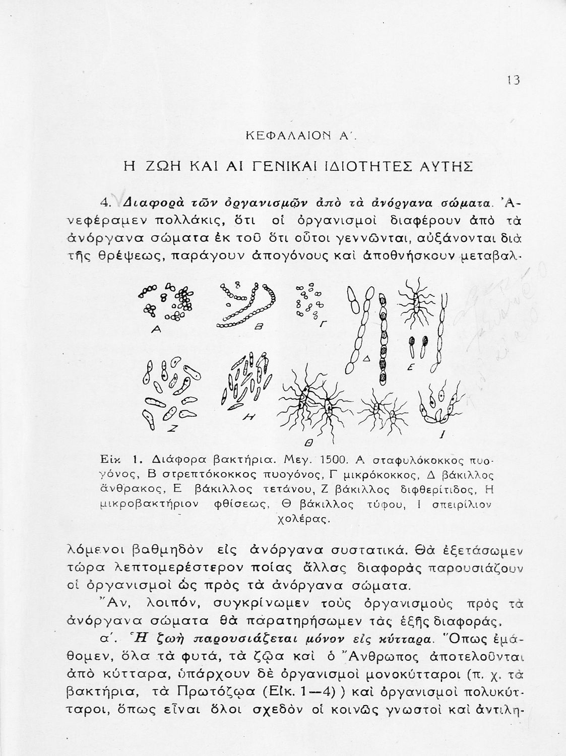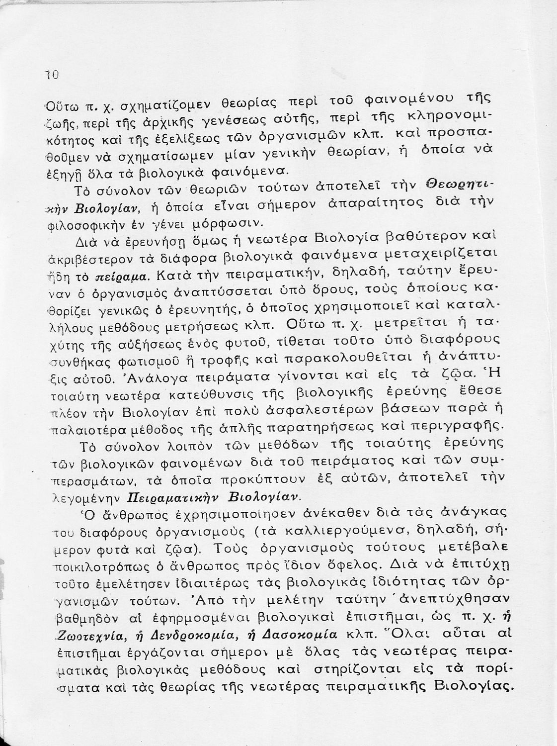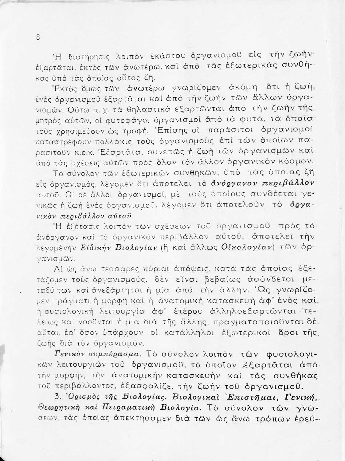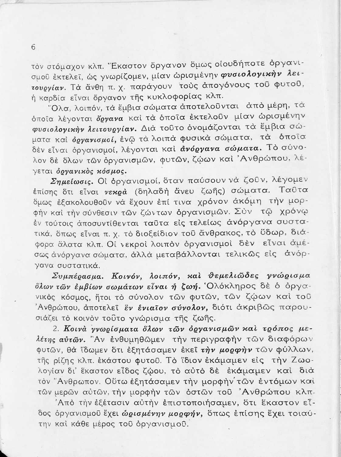 Βαθμίδα εκπαίδευσης: Δευτεροβάθμια Τάξη: Δ' Γυμνασίου παλαιού τύπου / ΣΤ΄ Γυμνασίου νέου τύπου Μάθημα: Βιολογία Γλώσσα: Απλή καθαρεύουσα Παρουσίαση περιεχομένου: Σχολικό εγχειρίδιο Βιολογίας Δ΄ Γυμνασίου που εστιάζει στις συνθήκες γέννησης, μεταβολής και θανάτου των έμβιων οργανισμών. Ο συγγραφέας ήταν καθηγητής της γενικής Βιολογίας στο Πανεπιστήμιο Αθηνών. |