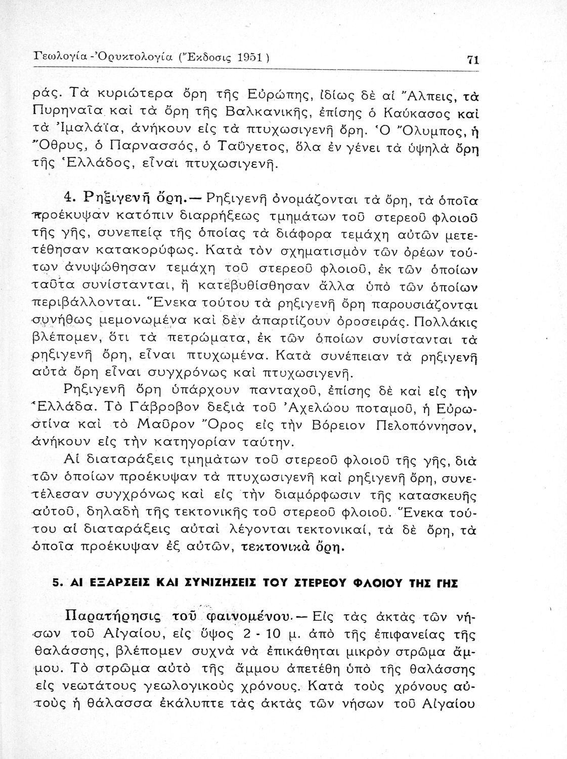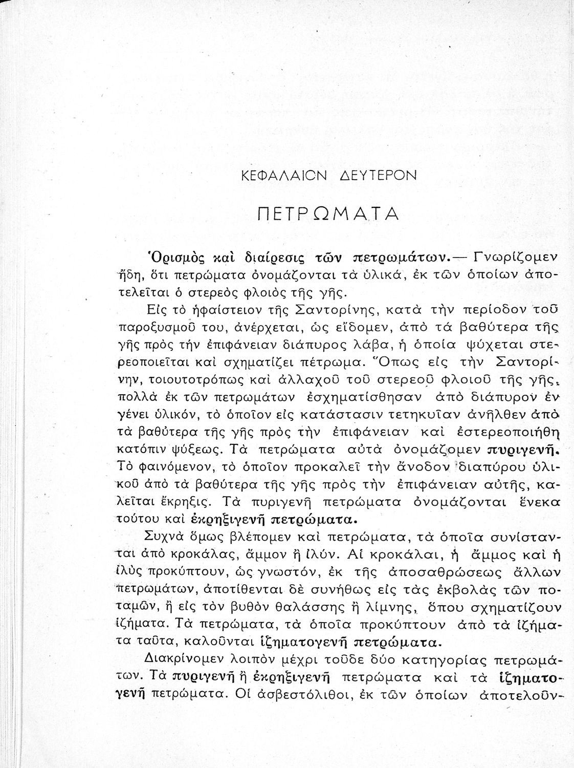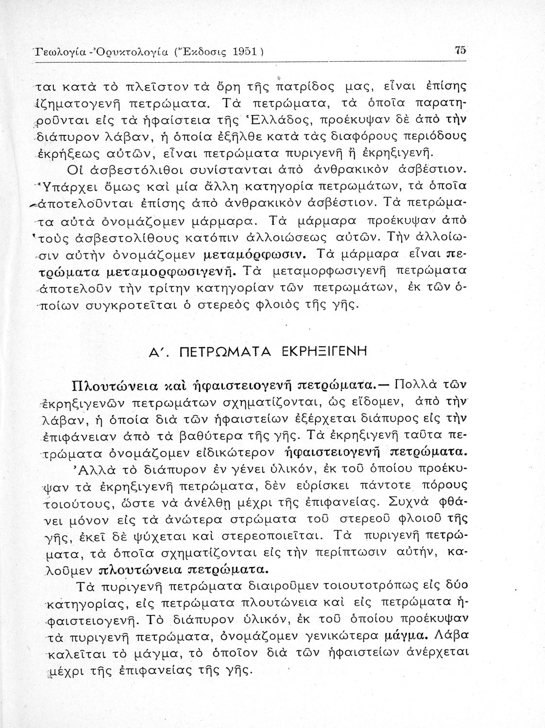 Σχολικό εγχειρίδιο Γεωλογίας/Ορυκτολογίας για την Δ΄ τάξη των Εξαταξίων Γυμνασίων που παρουσιάζει τα ορυκτά με βάση την κλάση στην οποία ανήκουν. Το τμήμα της Γεωλογίας εστιάζει στους γεωλογικούς αιώνες. Ο συγγραφέας ήταν καθηγητής στο ΕΜΠ.