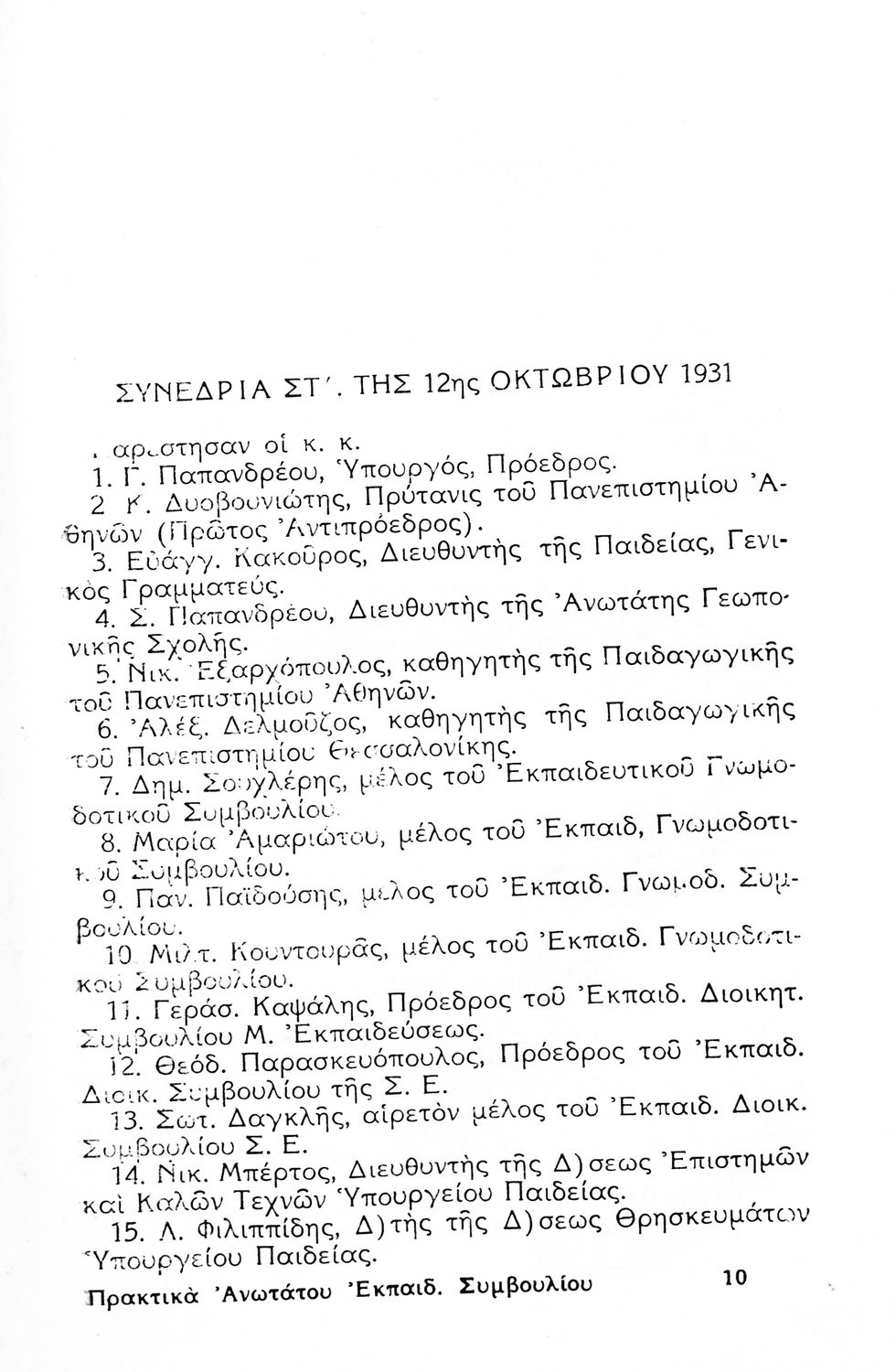 Πρακτικά των Συνεδριάσεων του Ανώτατου Εκπαιδευτικού Συμβουλίου (5-24 Οκτωβρίου 1931 ) που αφορούν την εύρυθμη λειτουργία των σχολείων και τις εκπαιδευτικές ανάγκες της εποχής.
