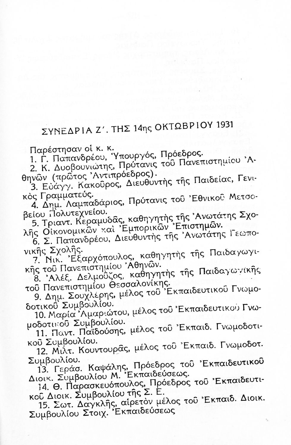 Πρακτικά των Συνεδριάσεων του Ανώτατου Εκπαιδευτικού Συμβουλίου (5-24 Οκτωβρίου 1931 ) που αφορούν την εύρυθμη λειτουργία των σχολείων και τις εκπαιδευτικές ανάγκες της εποχής.