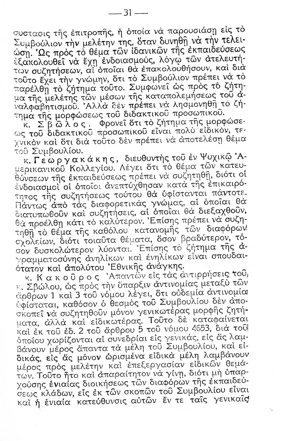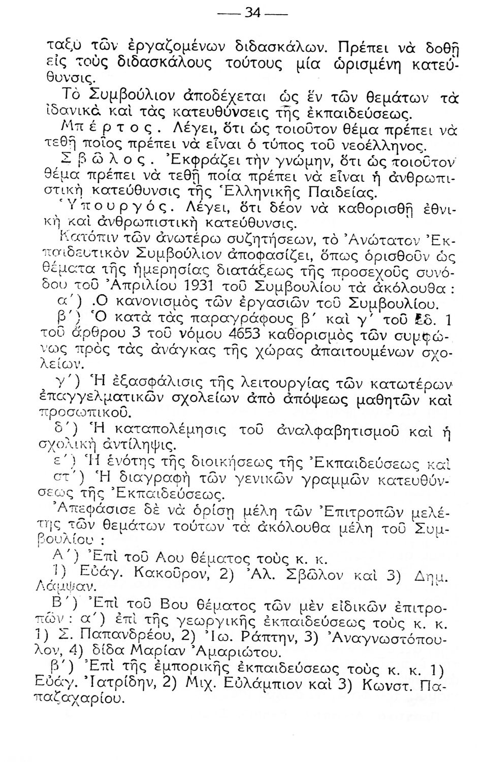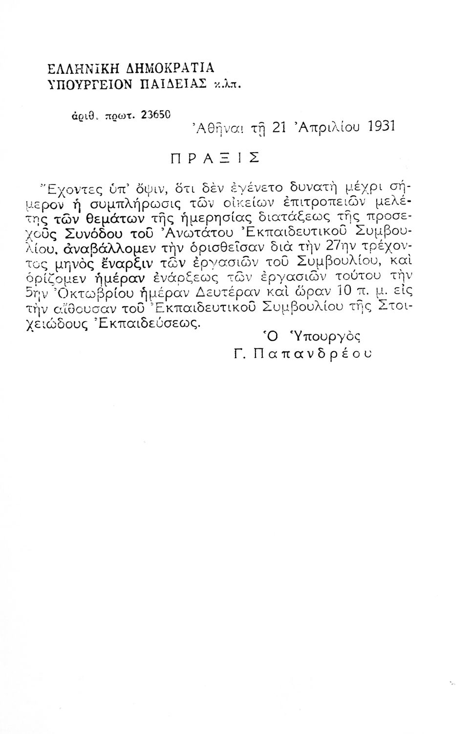 Πρακτικά των Συνεδριάσεων του Ανώτατου Εκπαιδευτικού Συμβουλίου (5-24 Οκτωβρίου 1931 ) που αφορούν την εύρυθμη λειτουργία των σχολείων και τις εκπαιδευτικές ανάγκες της εποχής.