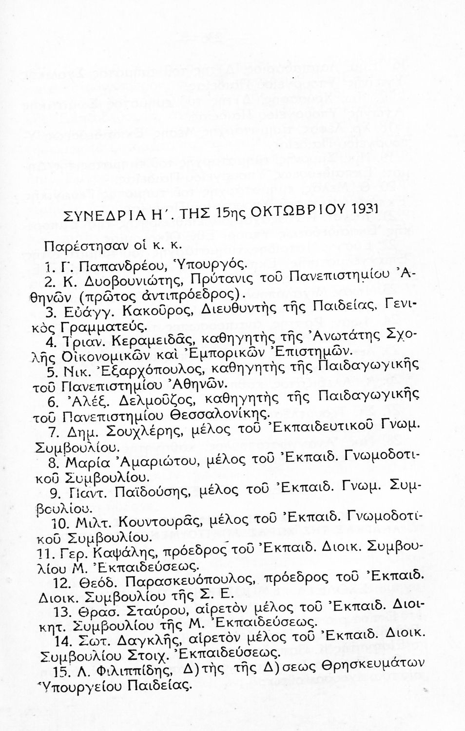 Πρακτικά των Συνεδριάσεων του Ανώτατου Εκπαιδευτικού Συμβουλίου (5-24 Οκτωβρίου 1931 ) που αφορούν την εύρυθμη λειτουργία των σχολείων και τις εκπαιδευτικές ανάγκες της εποχής.