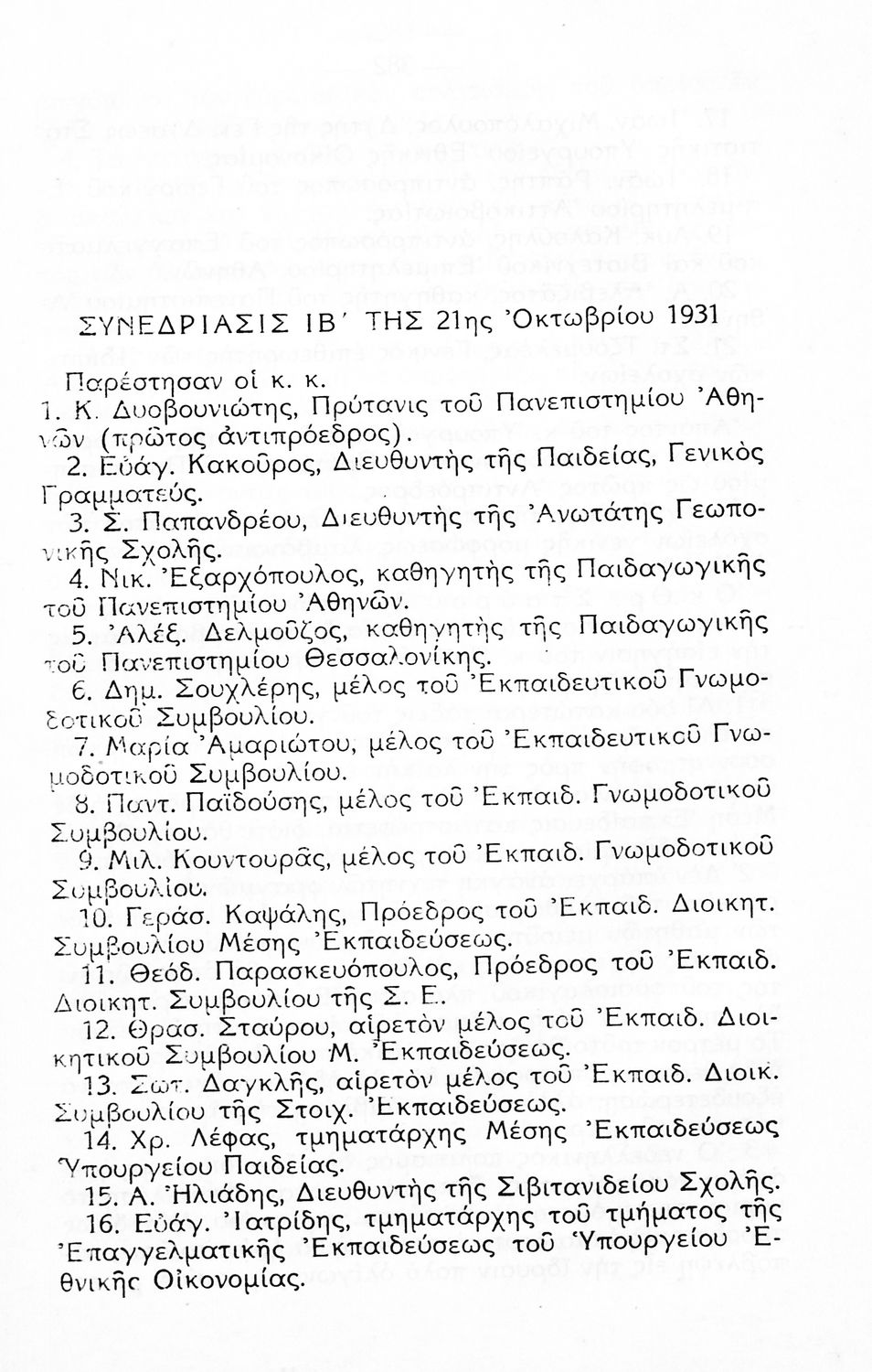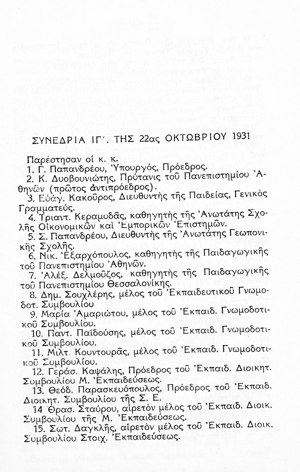Πρακτικά των Συνεδριάσεων του Ανώτατου Εκπαιδευτικού Συμβουλίου (5-24 Οκτωβρίου 1931 ) που αφορούν την εύρυθμη λειτουργία των σχολείων και τις εκπαιδευτικές ανάγκες της εποχής.