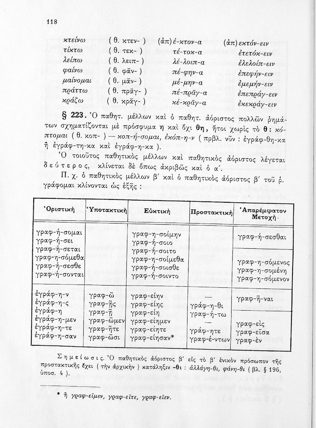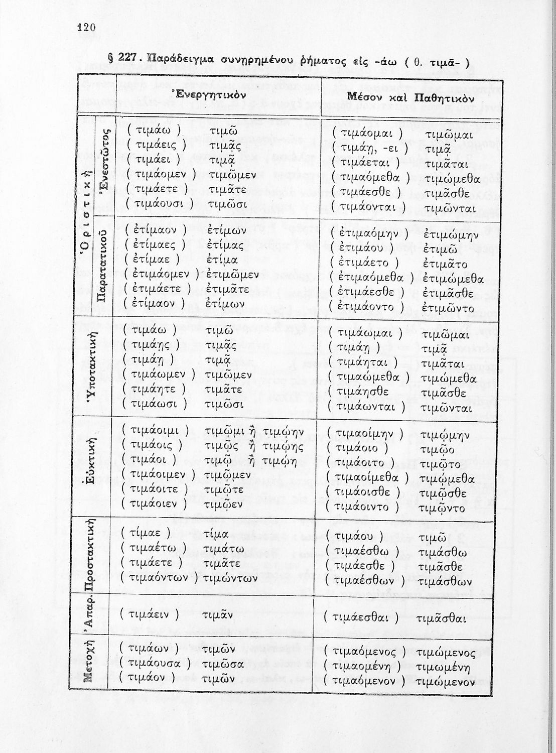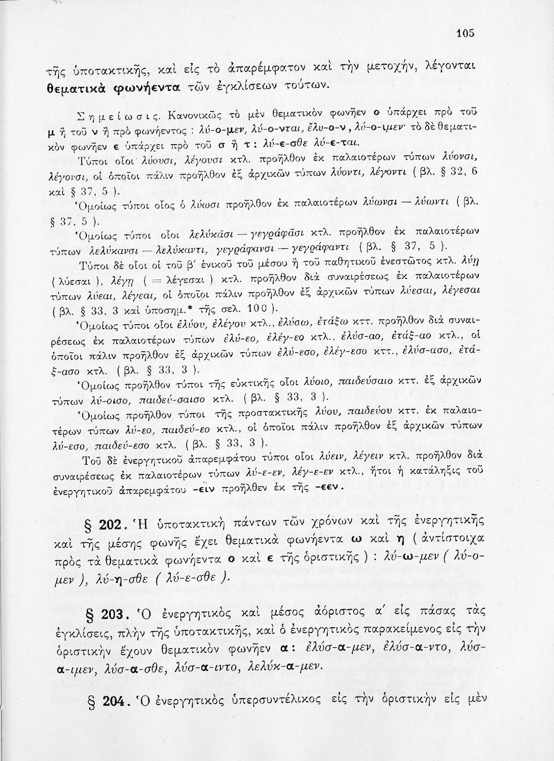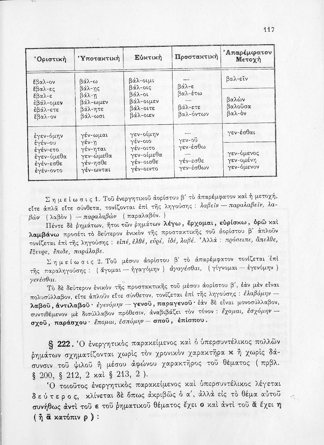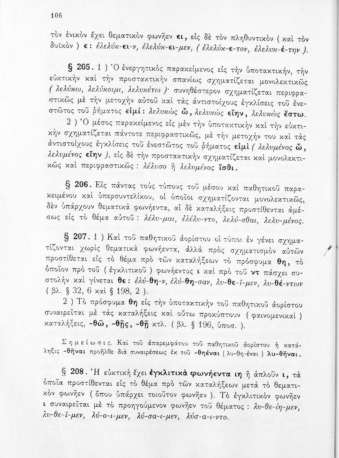 Σχολικό εγχειρίδιο Αρχαίων Ελληνικών Α', Β', και Γ' Γυμνασίου που περιέχει τους κανόνες γραμματικής και είναι χωρισμένο σε φθογγολογικό, τυπολογικό και ετυμολογικό μέρος. Περιέχει και κατάλογο ανωμάλων ρημάτων.