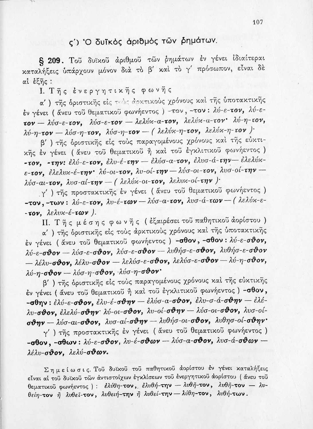 Σχολικό εγχειρίδιο Αρχαίων Ελληνικών Α', Β', Γ' και Δ' Γυμνασίου που περιέχει τους κανόνες γραμματικής και είναι χωρισμένο σε φθογγολογικό, τυπολογικό και ετυμολογικό μέρος. Περιέχει και κατάλογο ανωμάλων ρημάτων. Φέρει το σύμβολο της δικτατορίας.