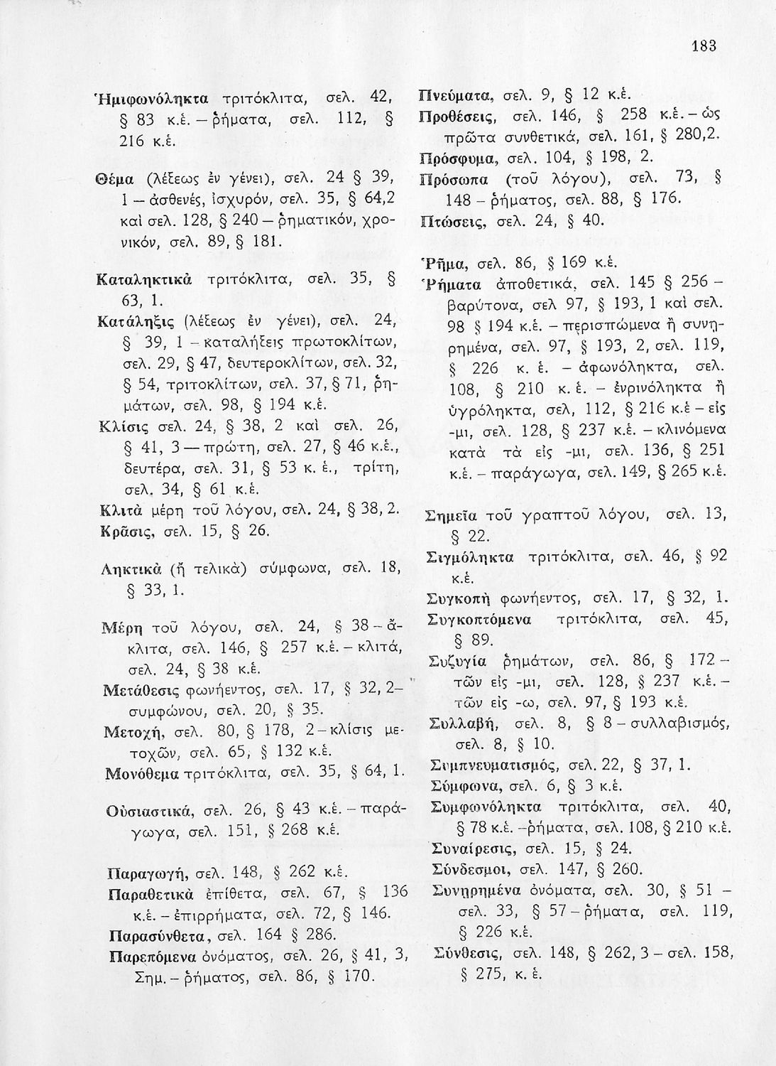 Γραμματική Αρχαίων Ελληνικών της Α΄, Β΄, Γ΄ και Δ΄ Γυμνασίου το οποίο εστιάζει στα μέρη του λόγου και στην σύνταξή τους και είναι χωρισμένο σε φθογγολογικό και τυπολογικό μέρος.